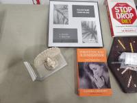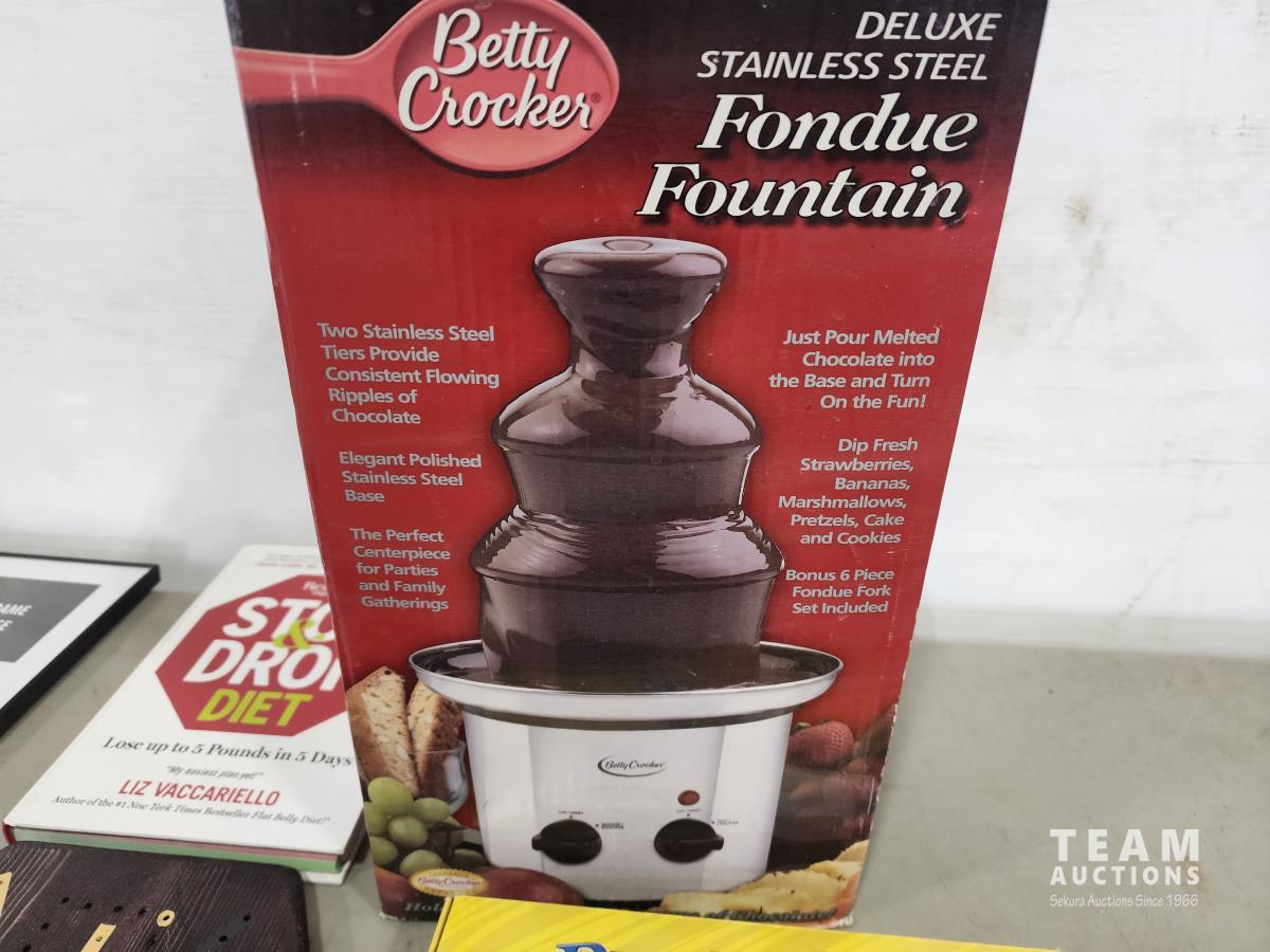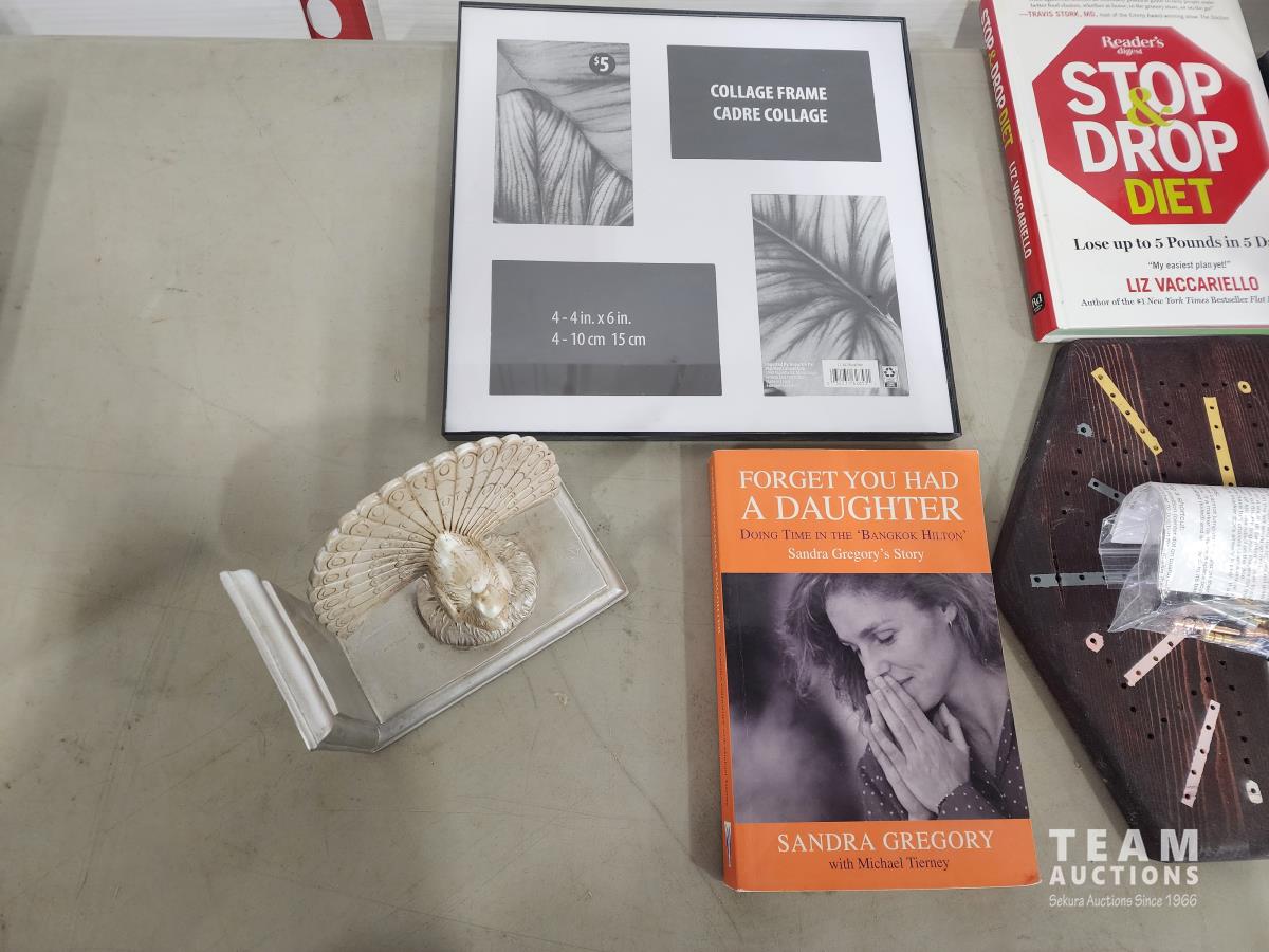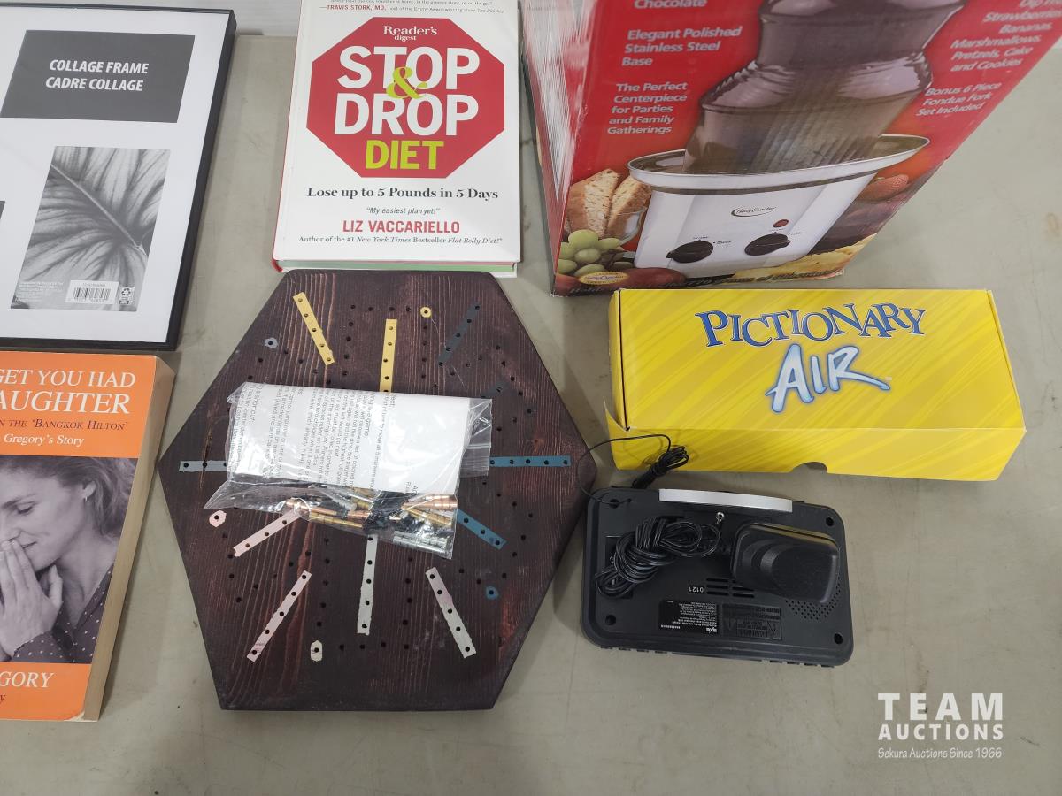 Betty Crocker fondue fountain, picture frame, (2) books, peacock book end, alarm clock, custom aggravation game, Pictonary Air game