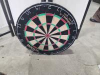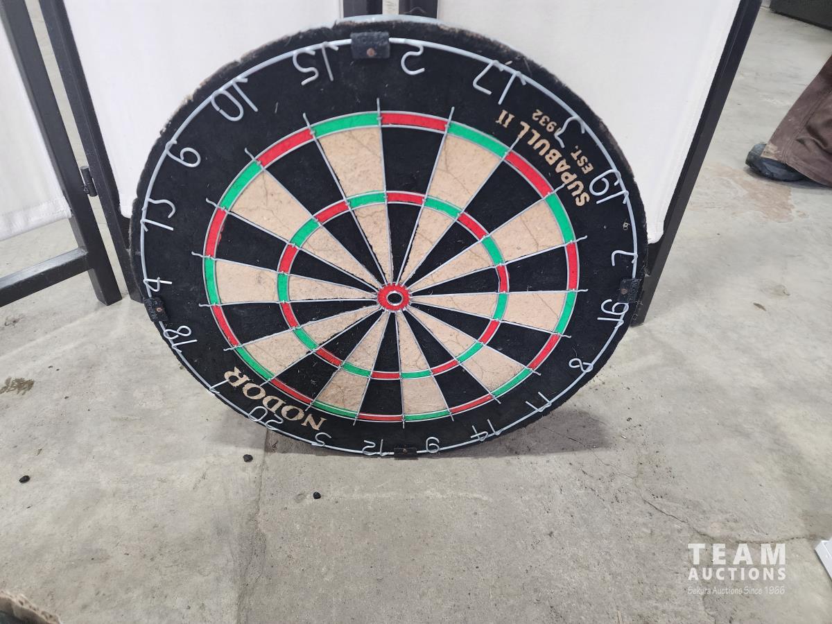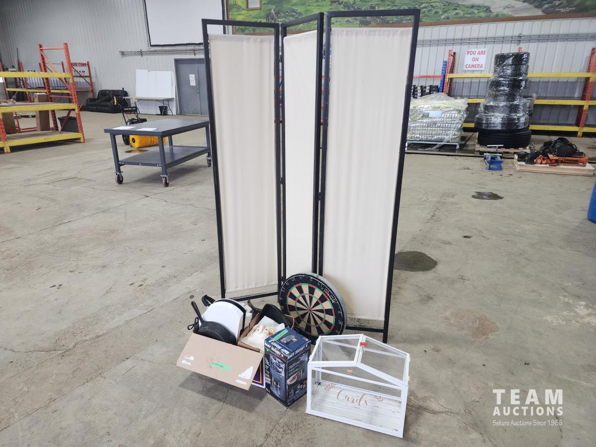 privacy screen, card holder, vintage soup pot, cast iron pans, dart board, change counter