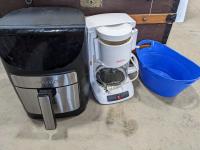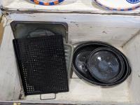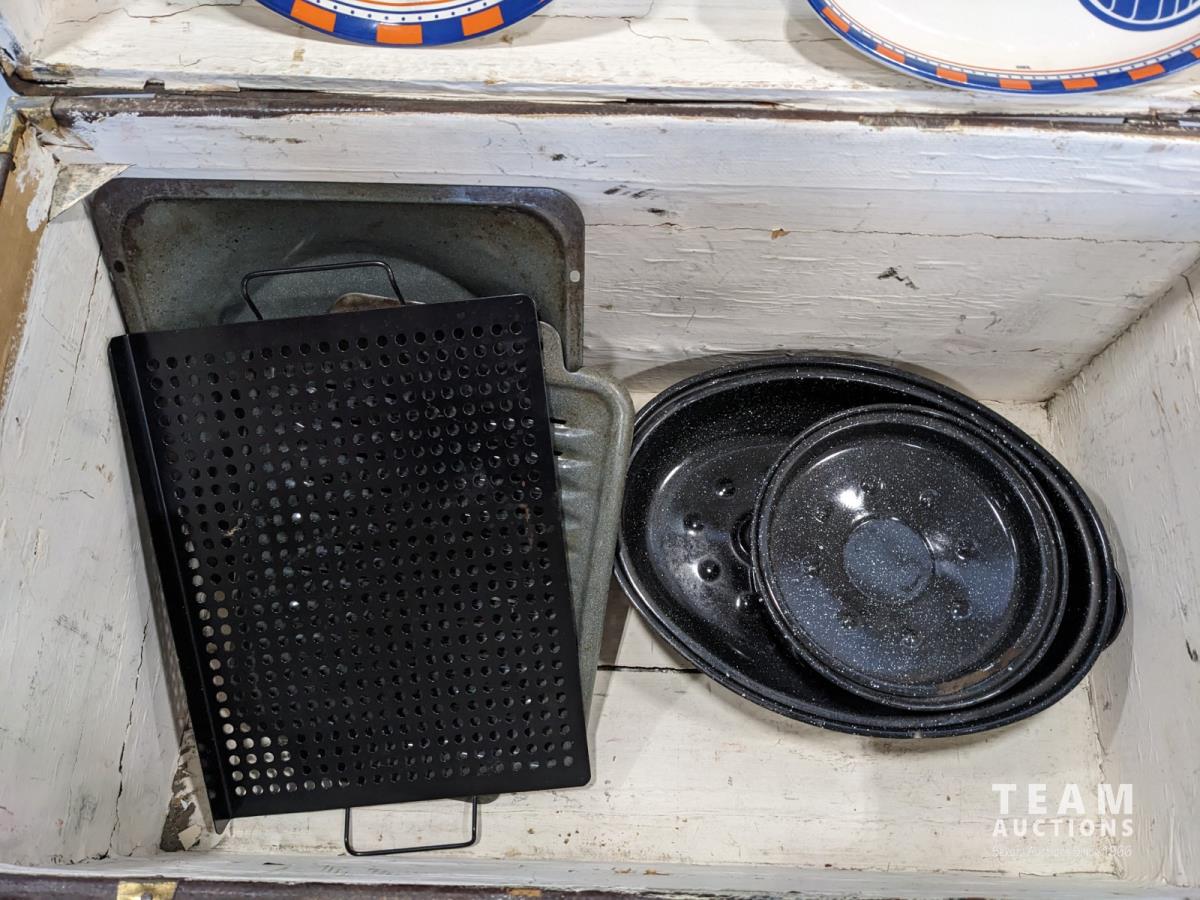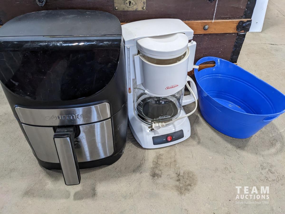 vintage trunk 32" W x 18" D x 22" H, Edmonton Oilers serving dishes, roasters, coffee pot, air fryer