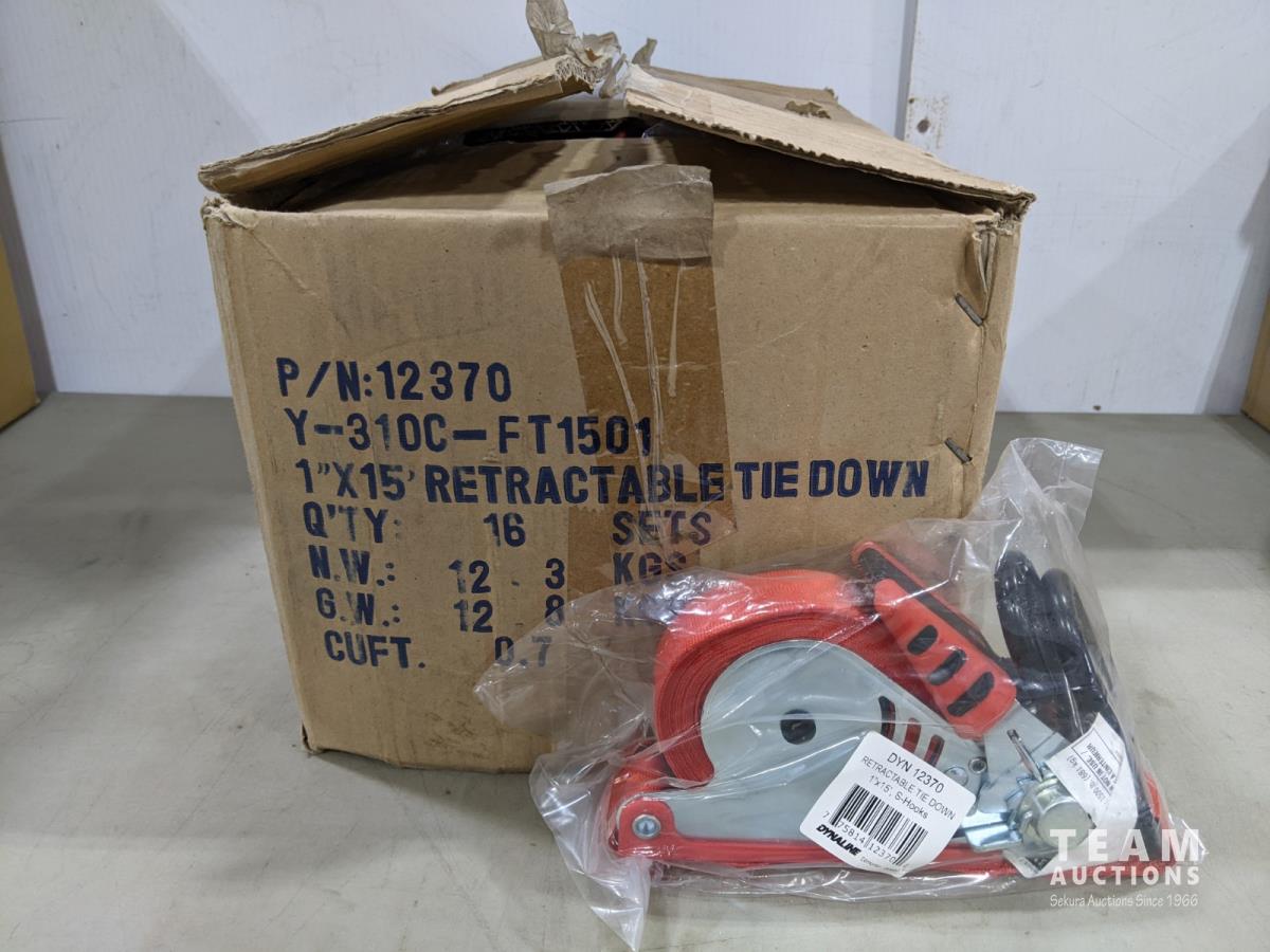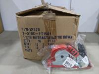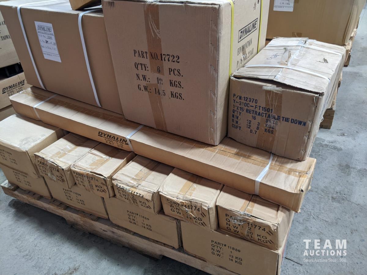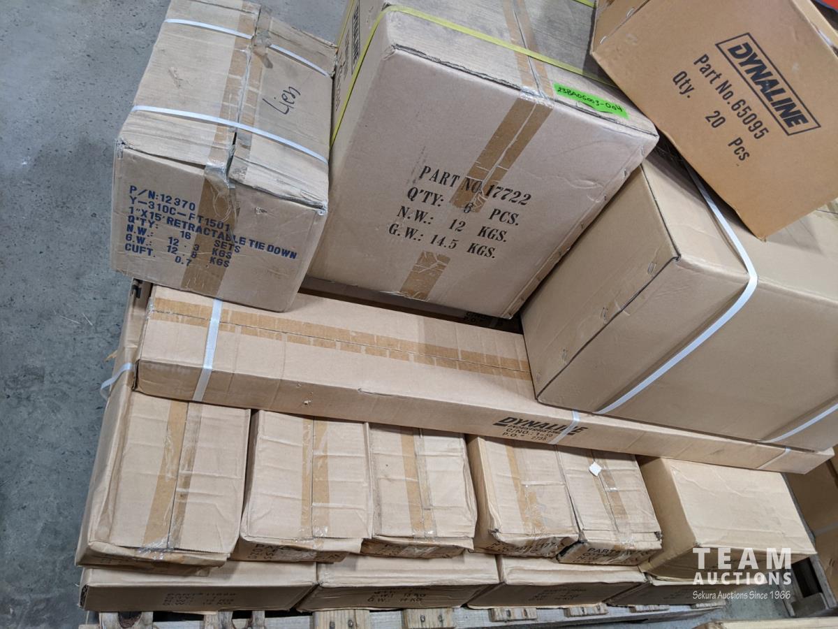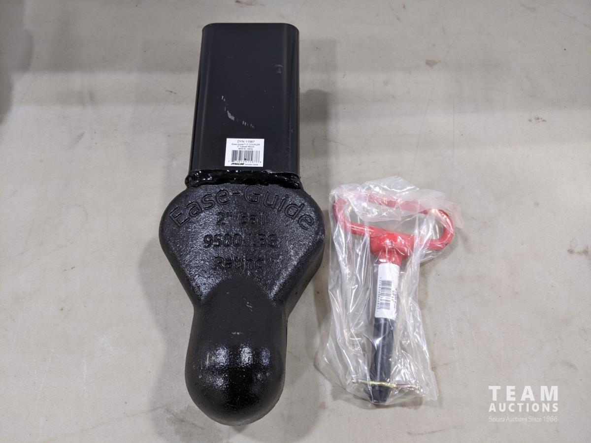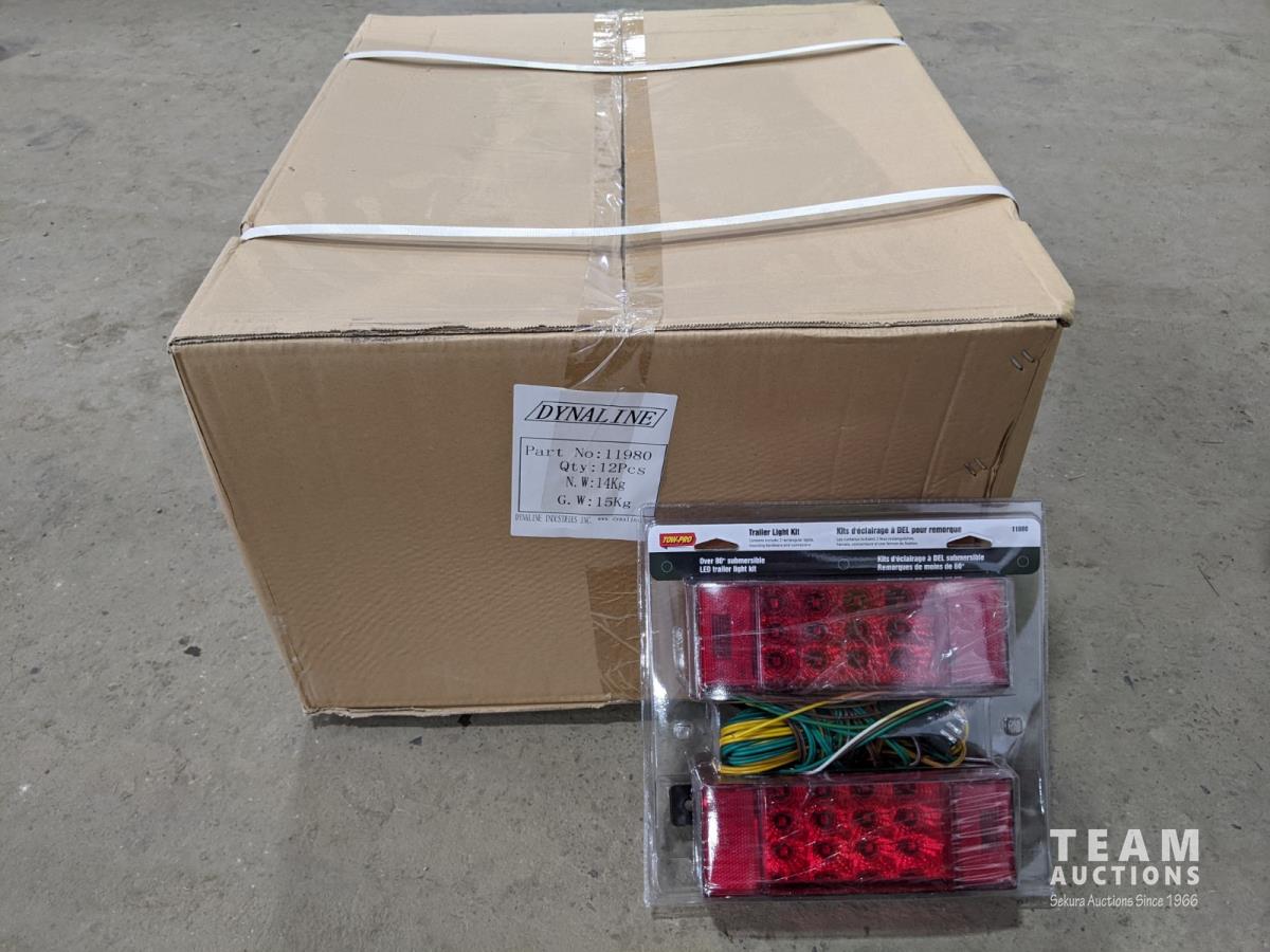 (12) Trailer light packages, (6) mirror extensions, (20±) 3/8 inch x 6 ft security cables, (5) adjustable tow bars, (10) 36 inch receiver tubes, (6) 48 inch receiver tubes, (16) 1 inch x 15 ft retractable tie down, (3) Ease-Guide 2-5/16 inch coupler