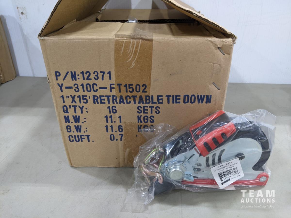 (12) trailer lights, (6) extended mirrors, (20) 3/8 inch x 6 ft security cable, (5) adjustable town bars, (10) 36 inch receiver tubes, (6) 48 inch receiver tubes, (8) 1 inch x 15 ft retractable tie downs