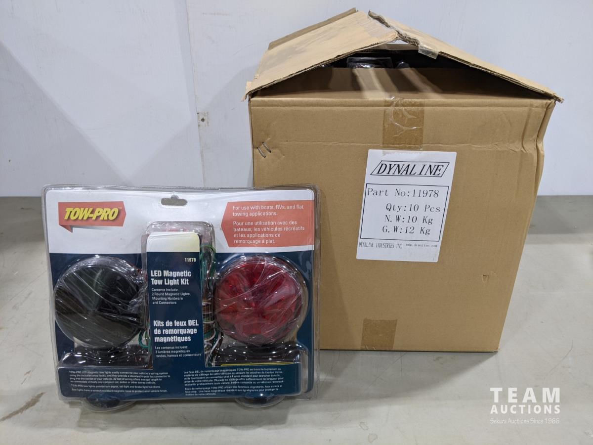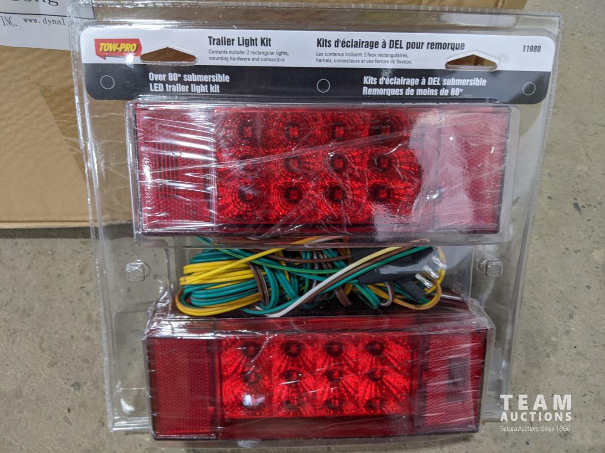 (5) adjustable tow hitches, (20) 3/8 inch x 6 ft security cables, (1) portable 12v winch, (80) foldable funnels, (10) magnetic tow light kits, (6) trailer light kits