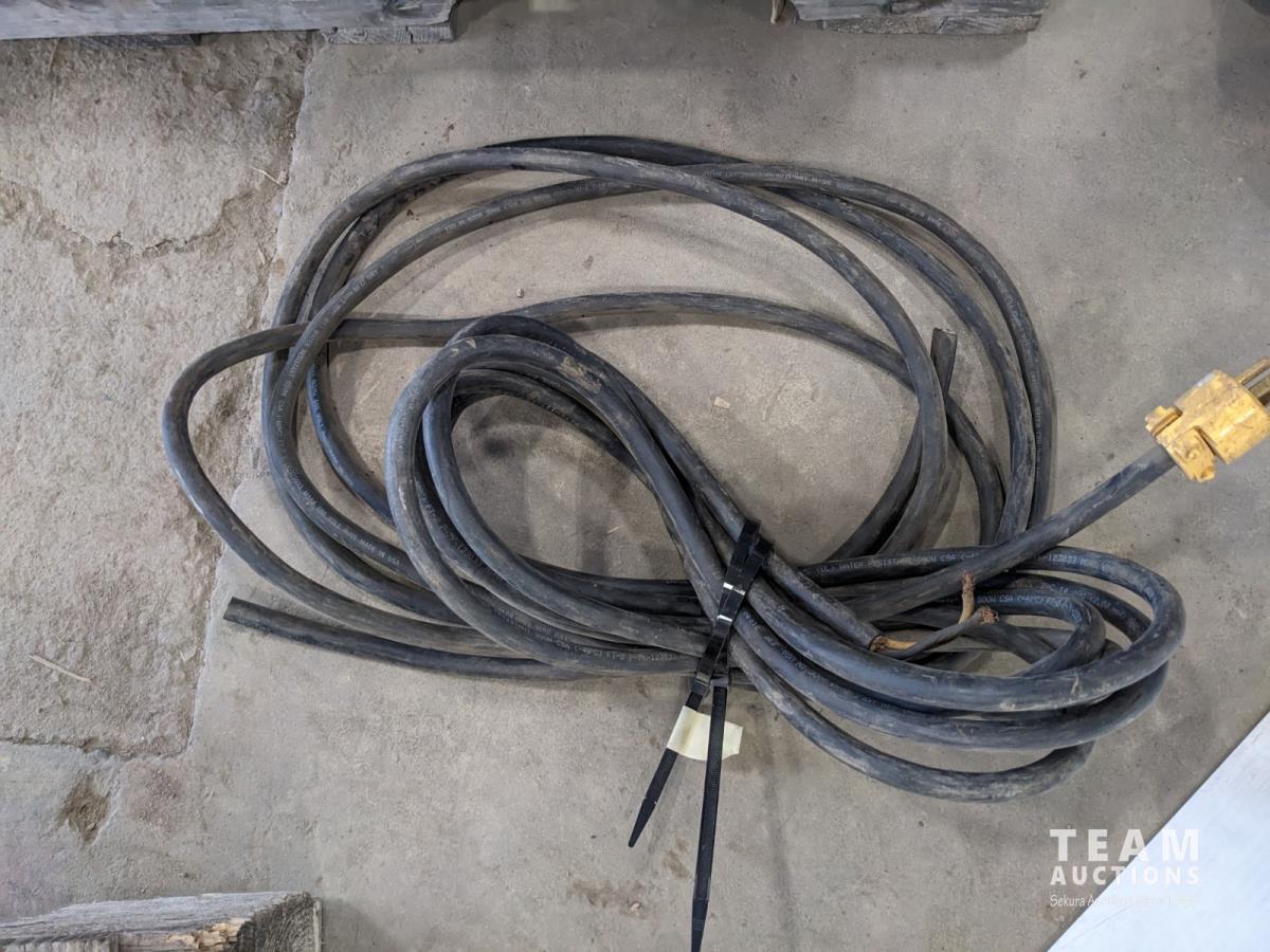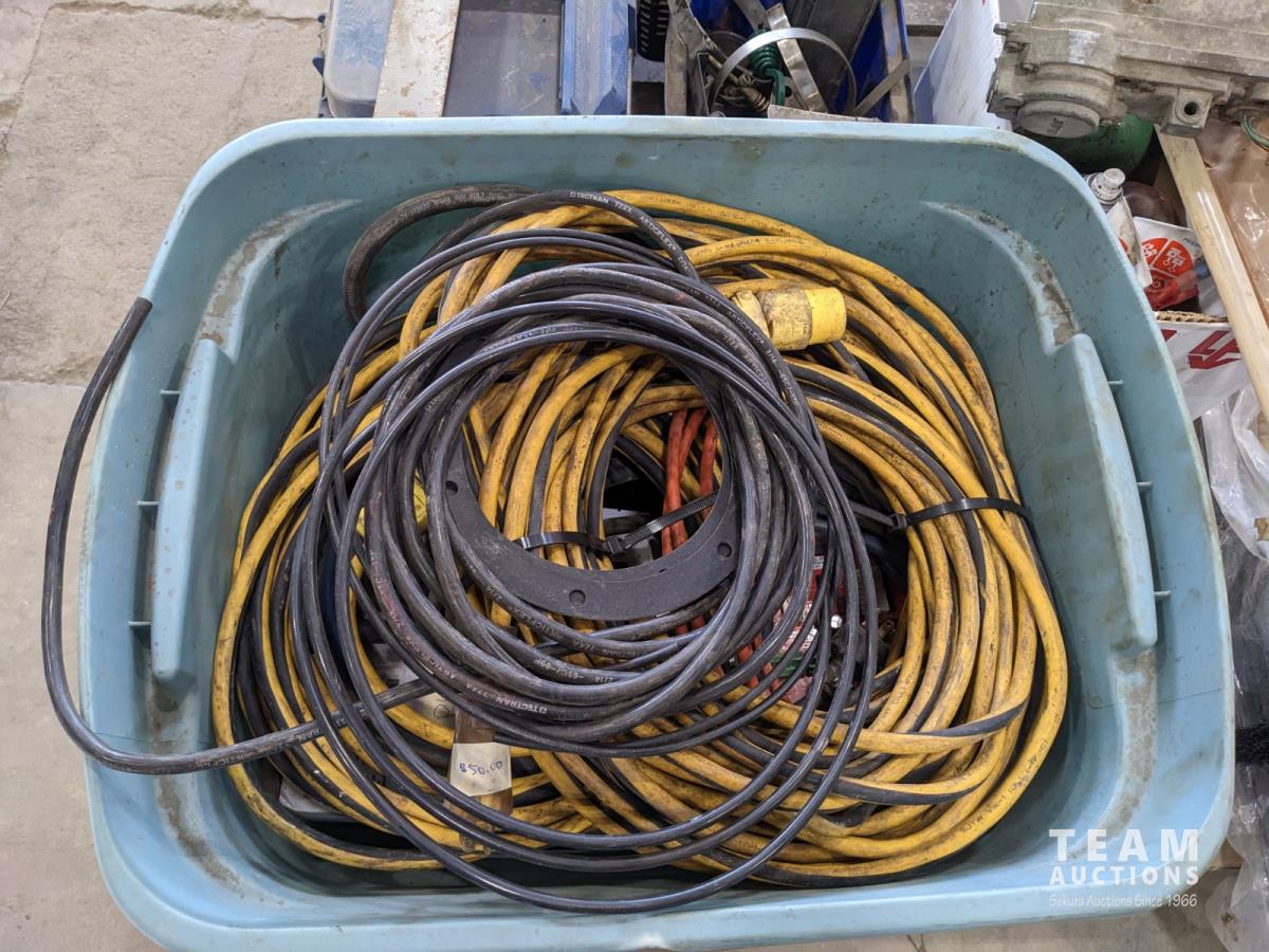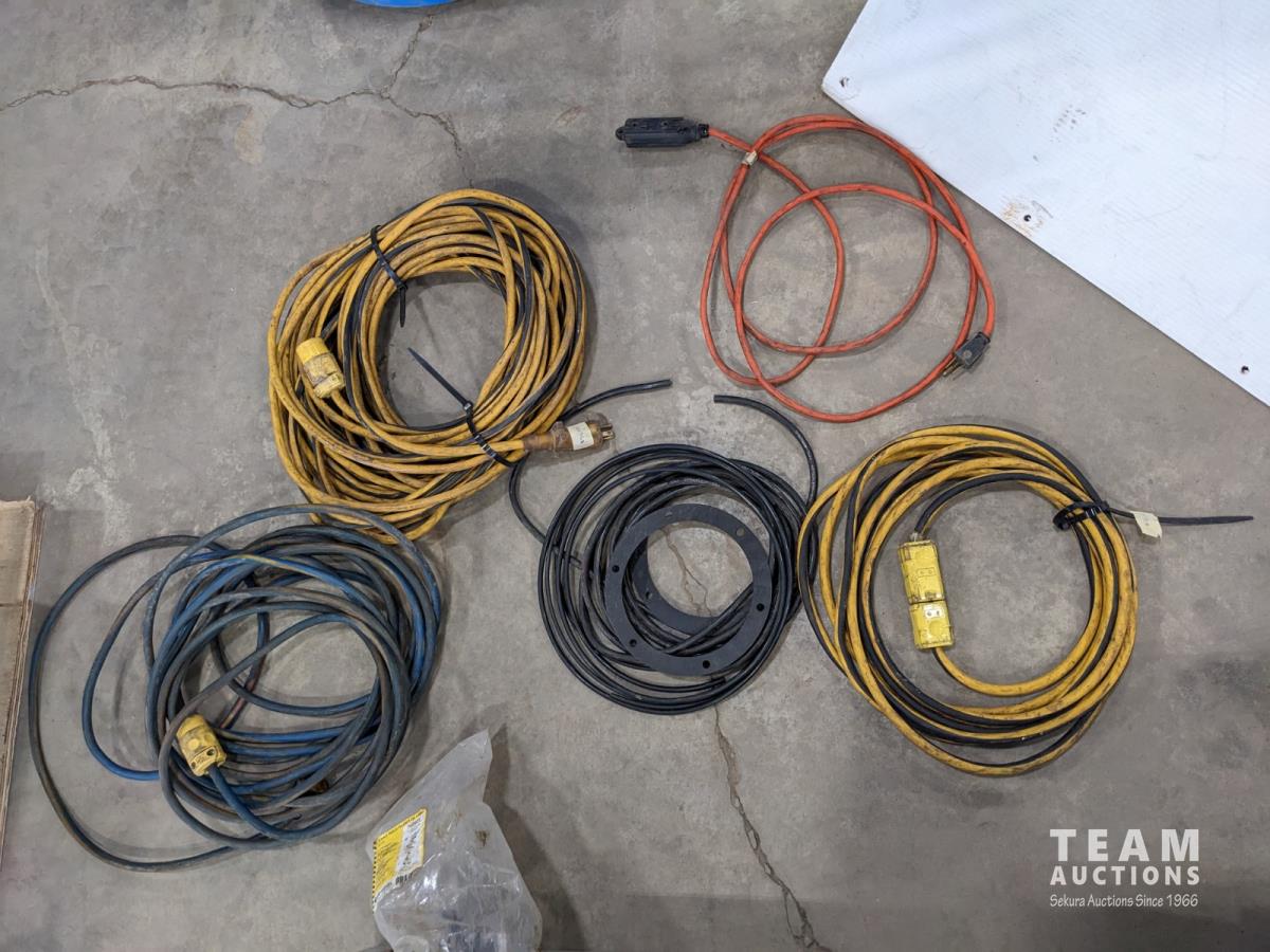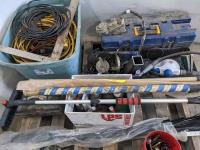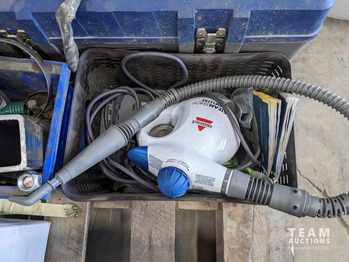 Extension cords, brazing rods, gear puller set, 4 ft zip ties, tubes of grease, tool box, square, Bissell steamer, angle grinder guards