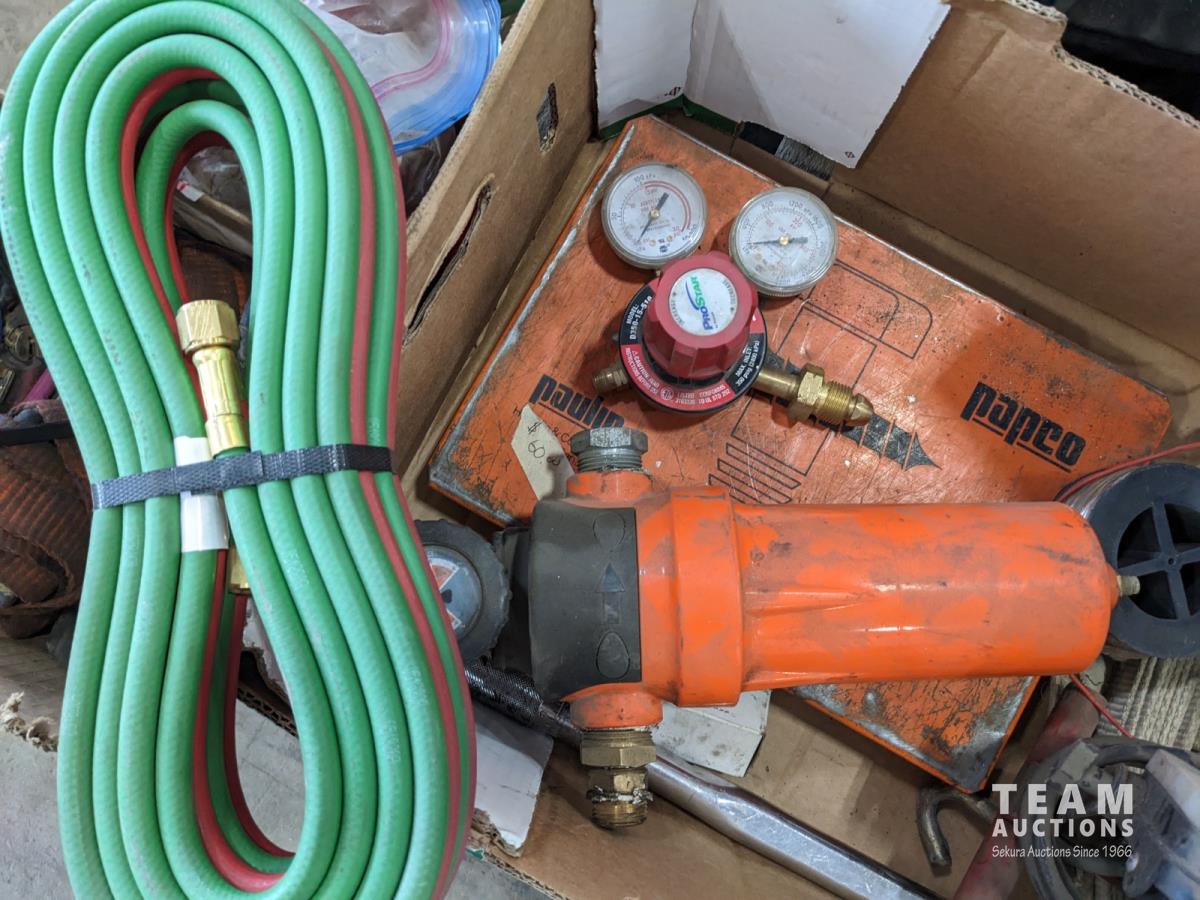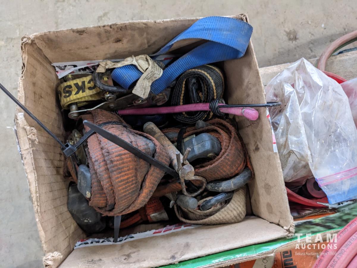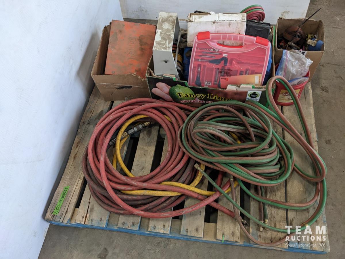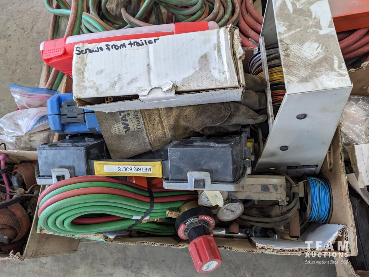 Wiring supplies, case of roll pins, qty of air hoses, (2) oxy/acetylene hose sets, acetylene gauge, qty of ratchet strap, assorted bolts