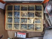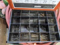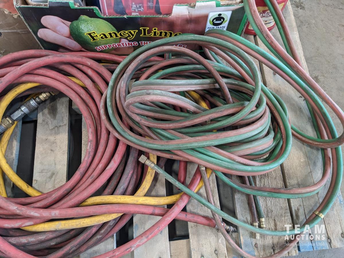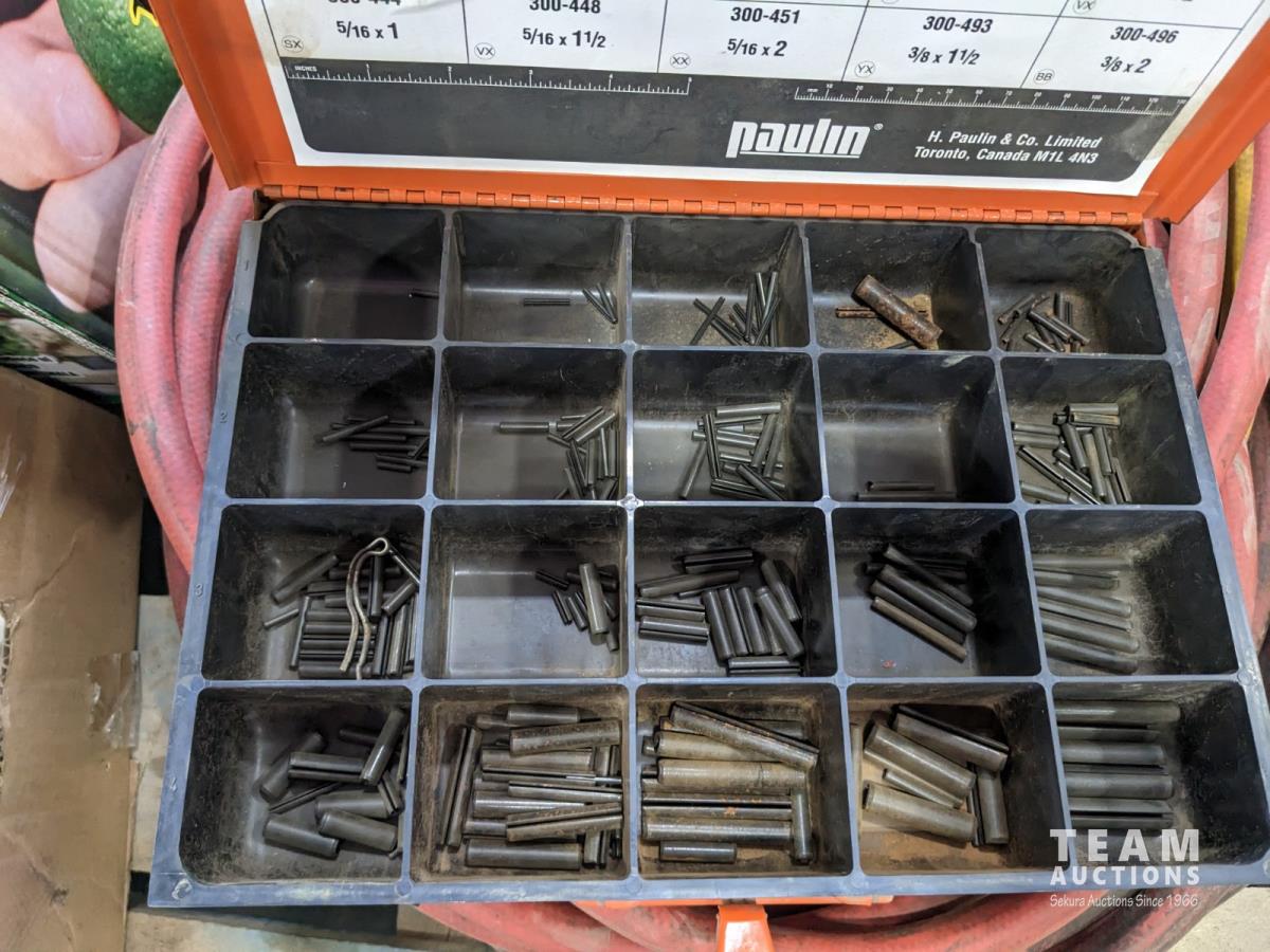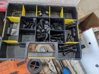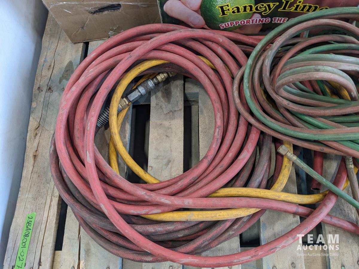 Wiring supplies, case of roll pins, qty of air hoses, (2) oxy/acetylene hose sets, acetylene gauge, qty of ratchet strap, assorted bolts