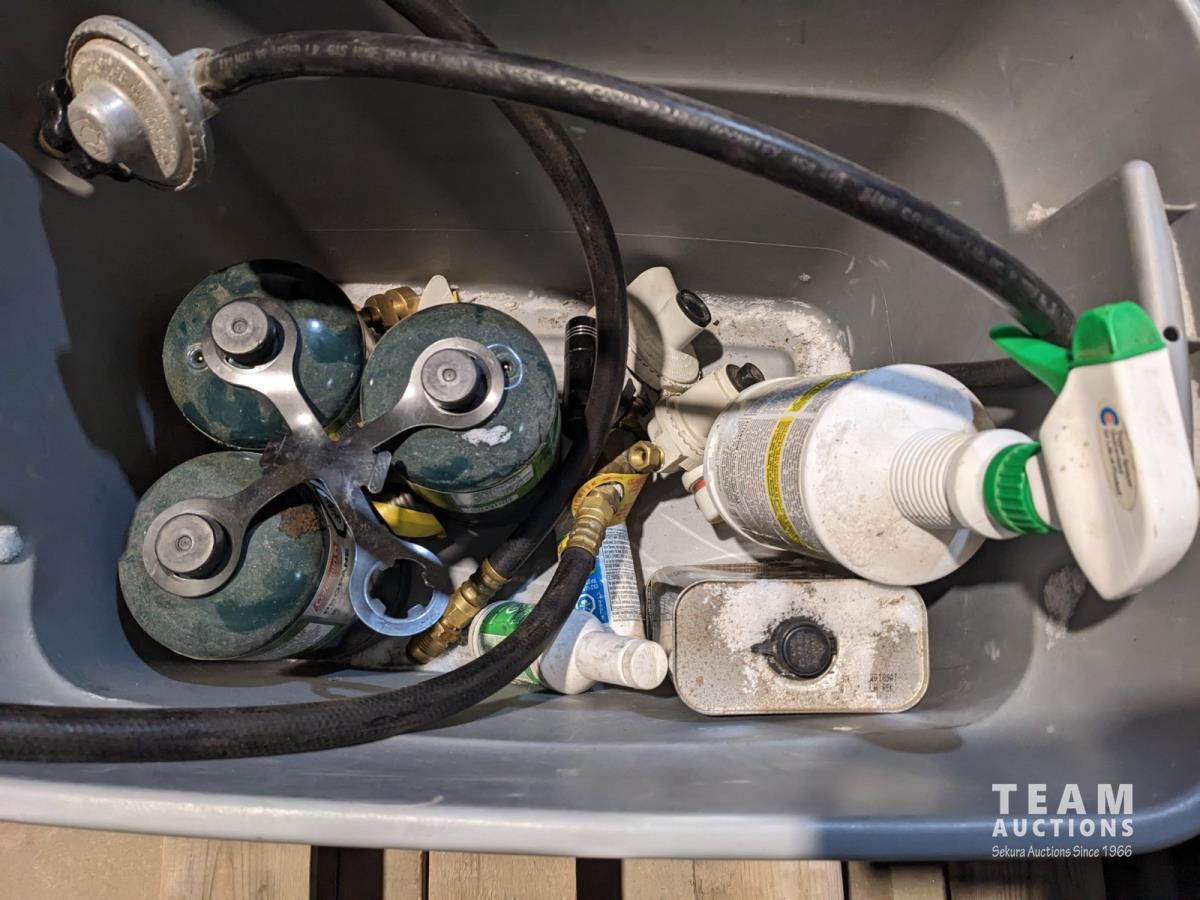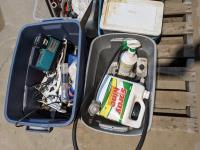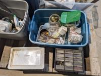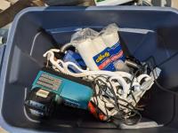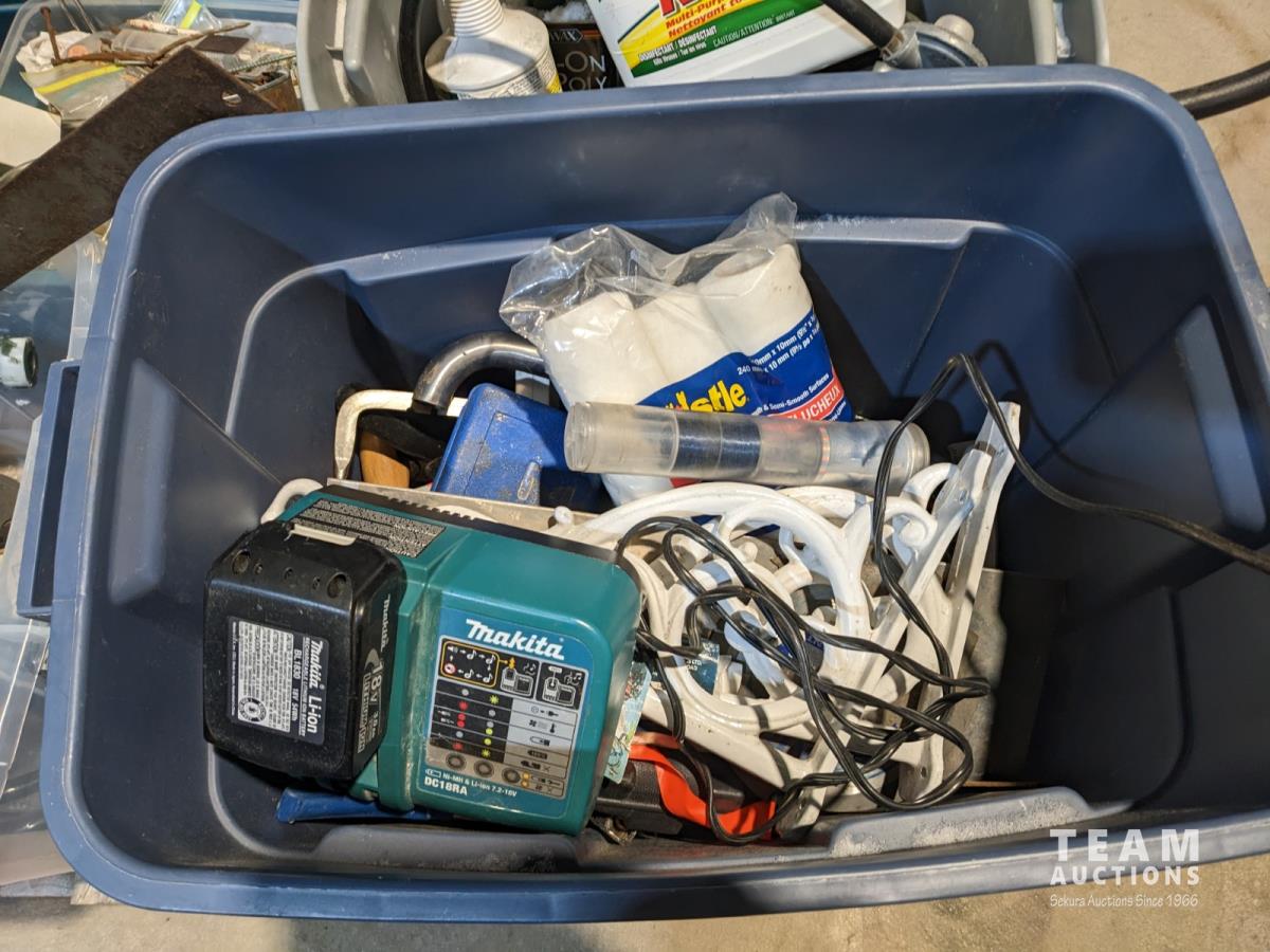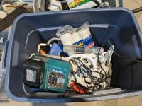 Makita battery and charger, parts bin, propane hose with regulator, screws and bolts
