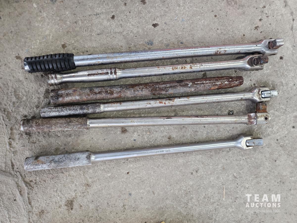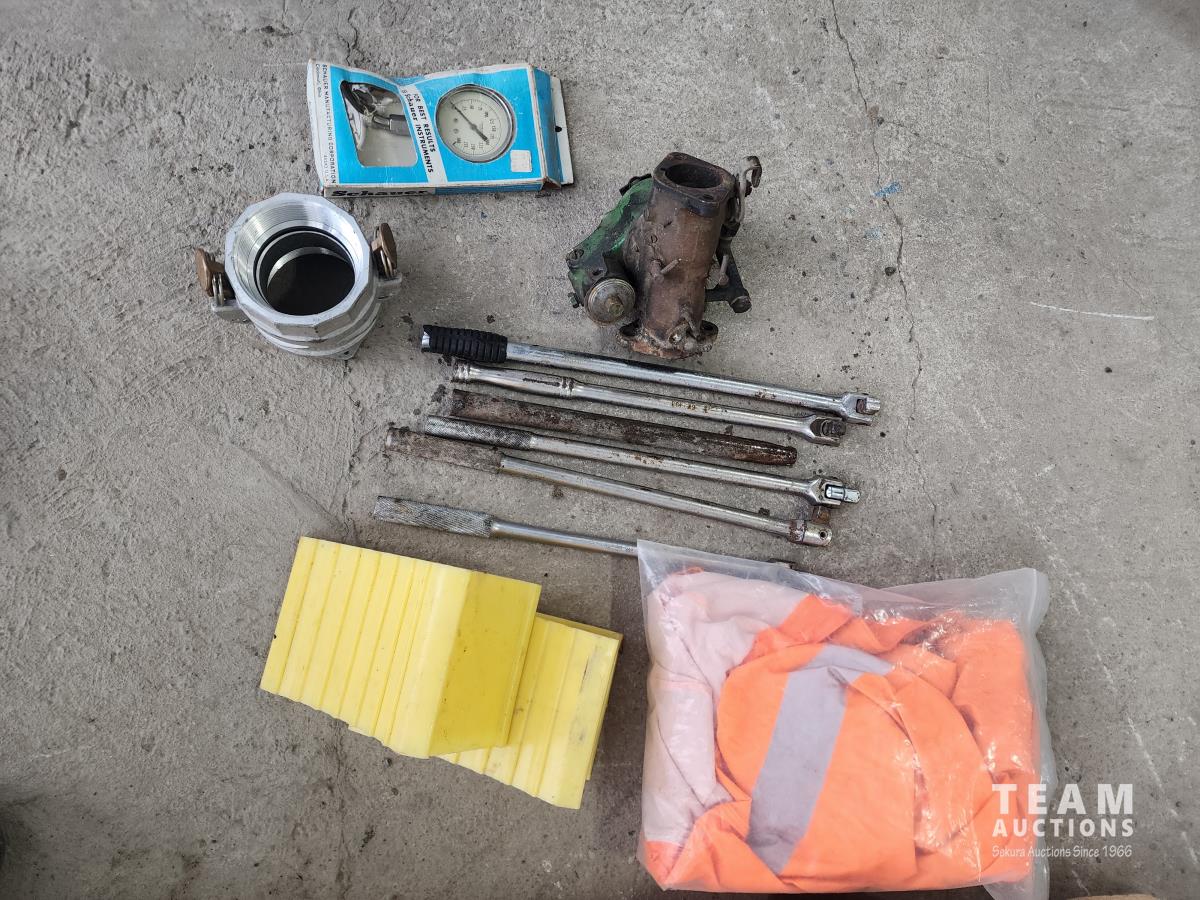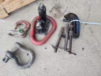 Cam lock, tire chocks, Schauer gauge, breaker bars, Toyota filters, c-clamps, bottle jack, clevis