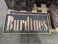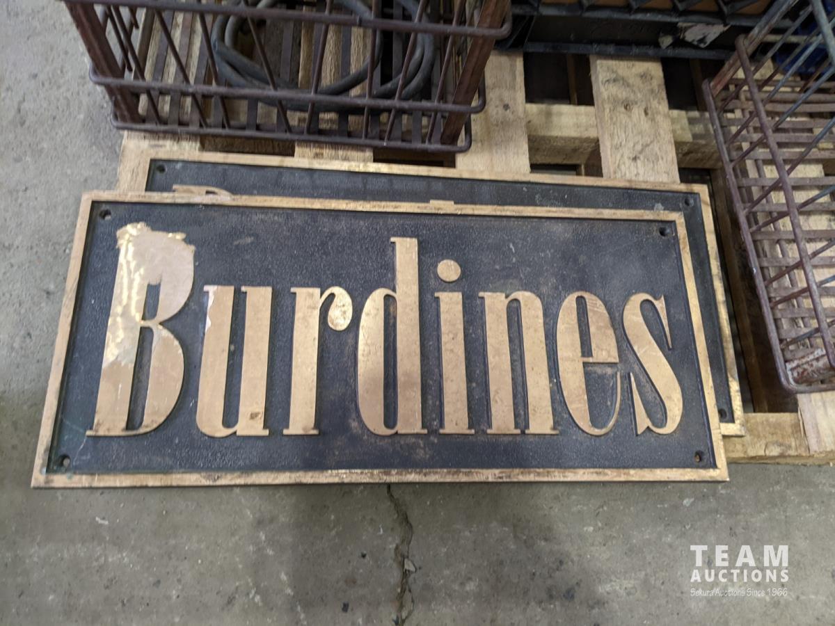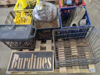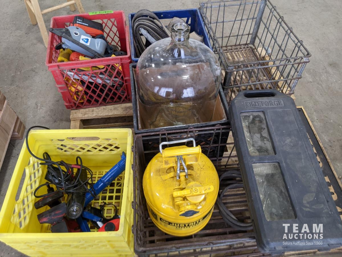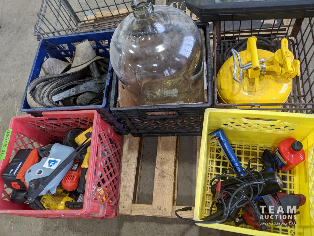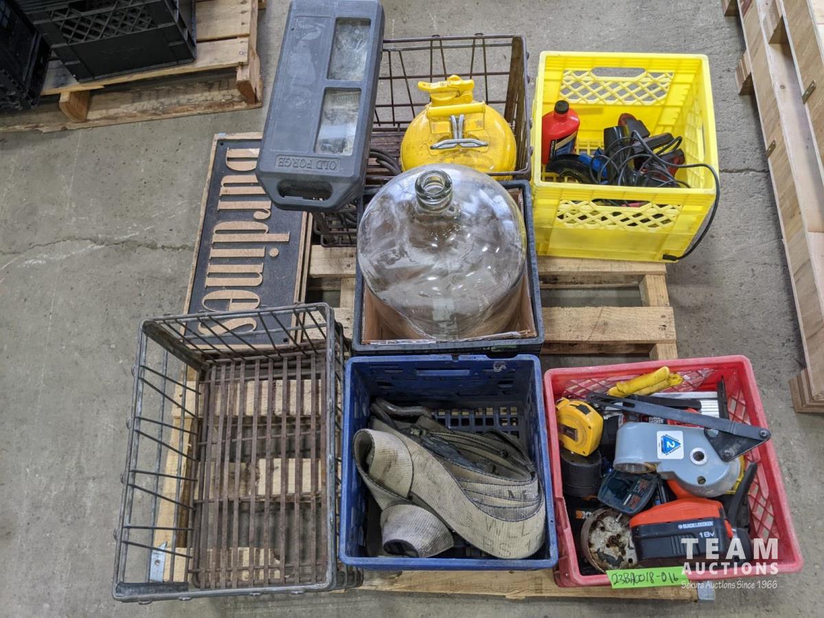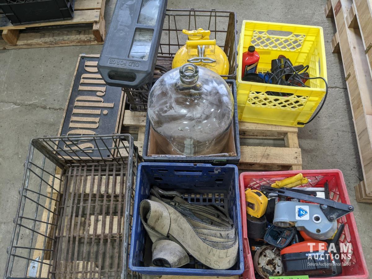 Cordless tools, ratchet strap, metal crate, glass jug, metal safety can, (2) solid brass signs