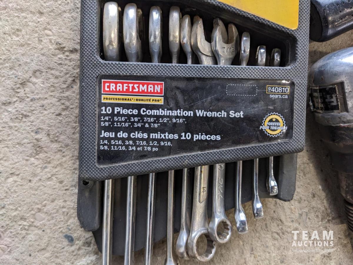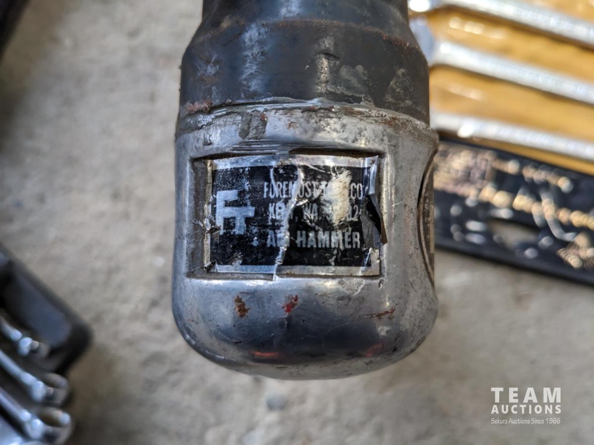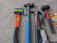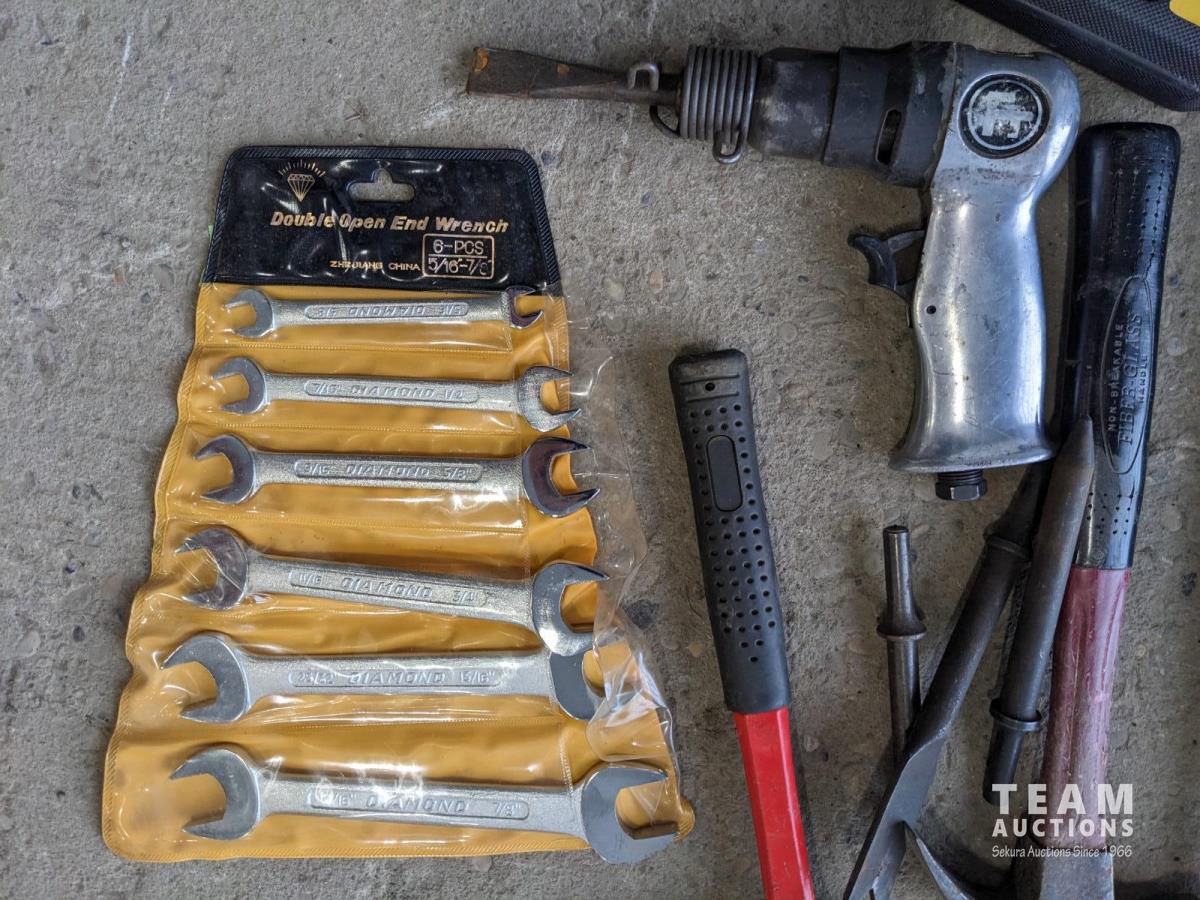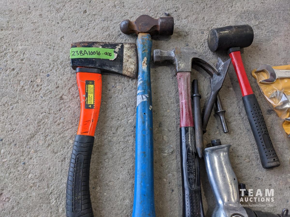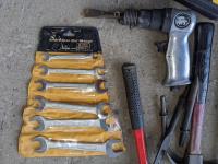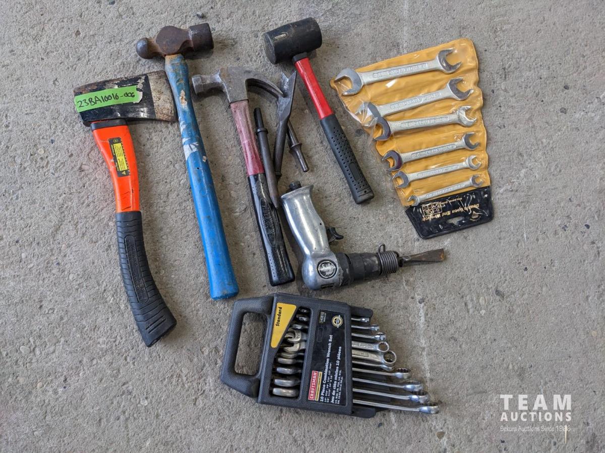 Hammers, hatchet, (2) wrench sets, air chisel with extra bits