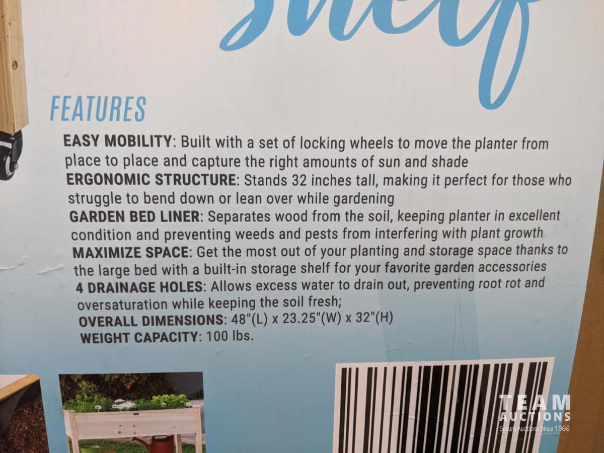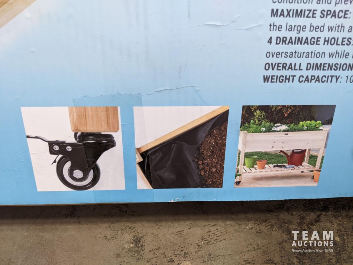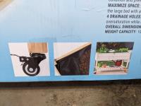 bottom shelf, locking wheels, 32" h, garden bed liner, drainage holes
