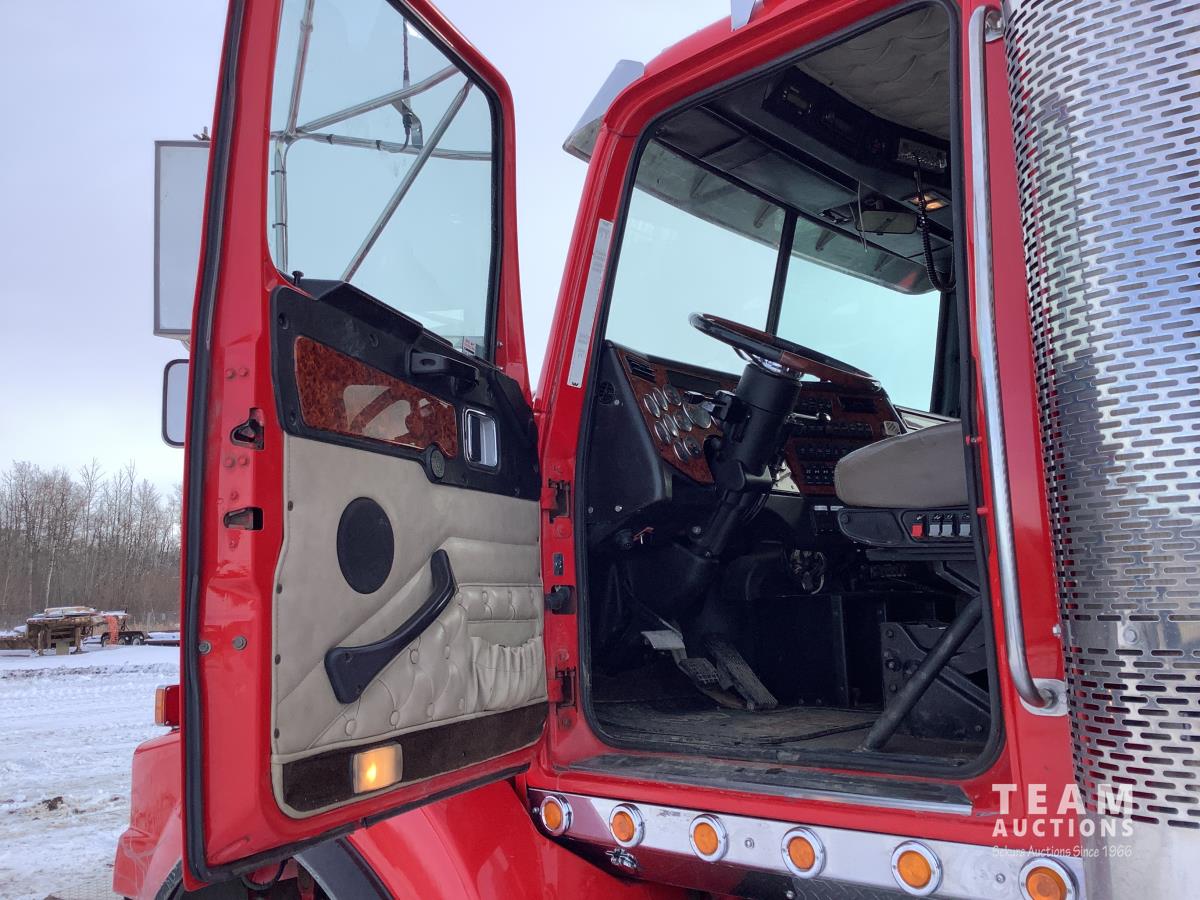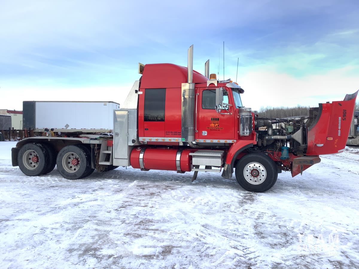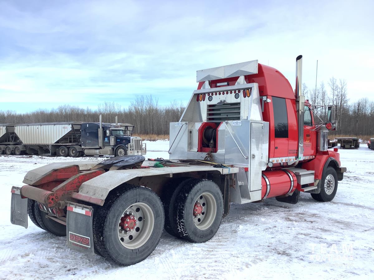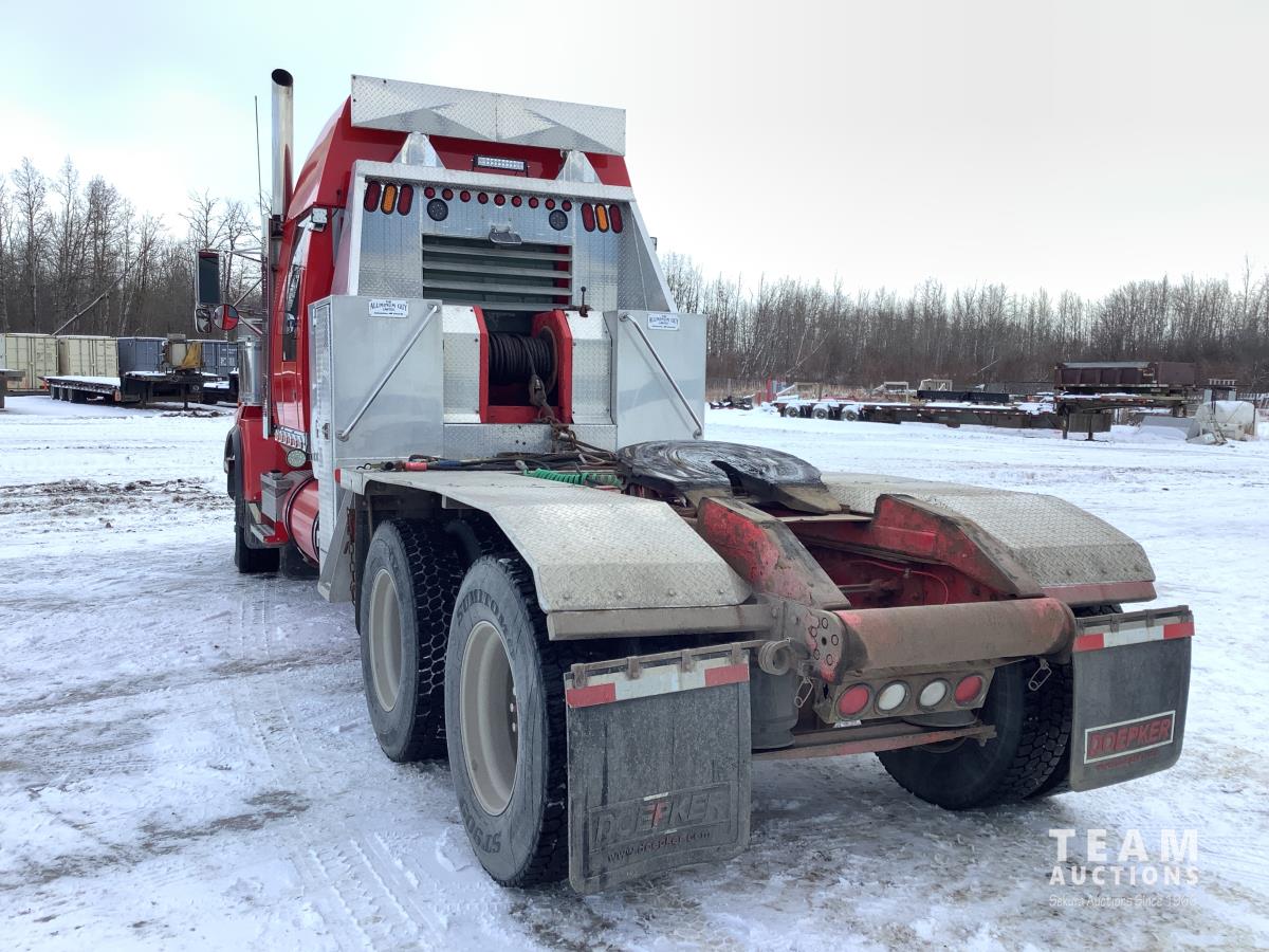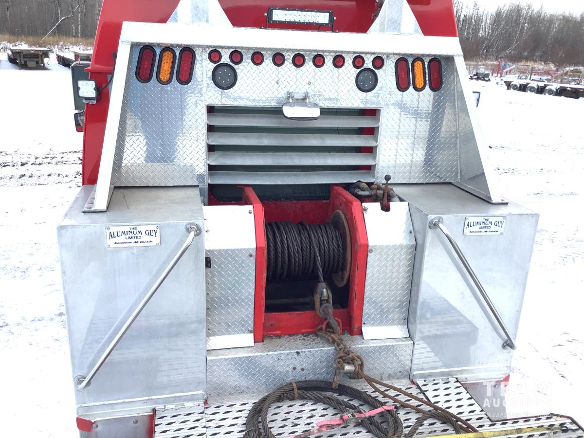 Detroit SERIES 60 515 HP Webasto diesel engine heater, engine brake, air suspension, 16,000 lb front axle, 46,000 lb rear axles, full lockers, 13 speed transmission with a Spicer 4 speed air shift auxiliary transmission, Brandon DP-50 hydraulic drive winch with the Alum Guy headache rack, air lift wide load sign, factory 10 wide cab mirrors, side cabinets, steps, decking, full rear fenders, rear live roll, all aluminum wheels, 385/65R22.5 front tires, 11R24.5 rear tires