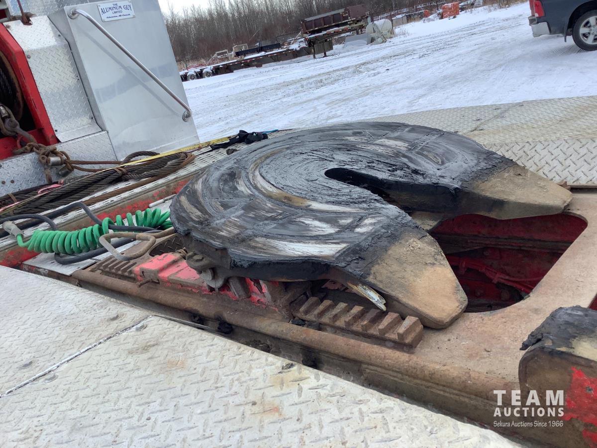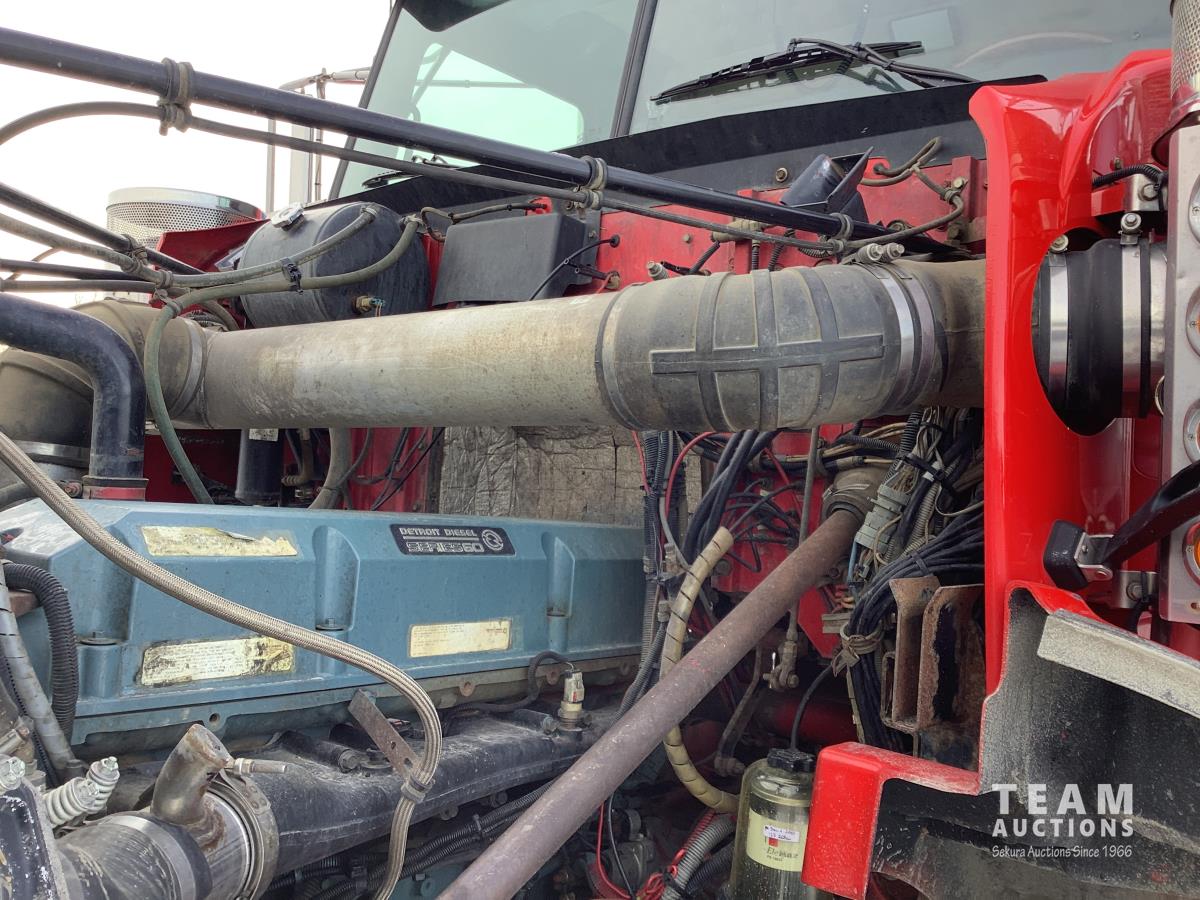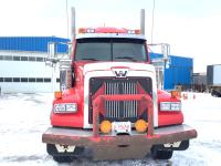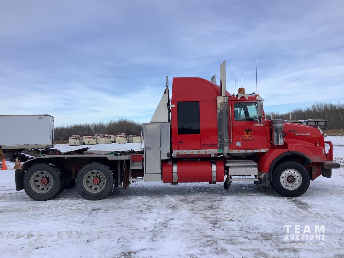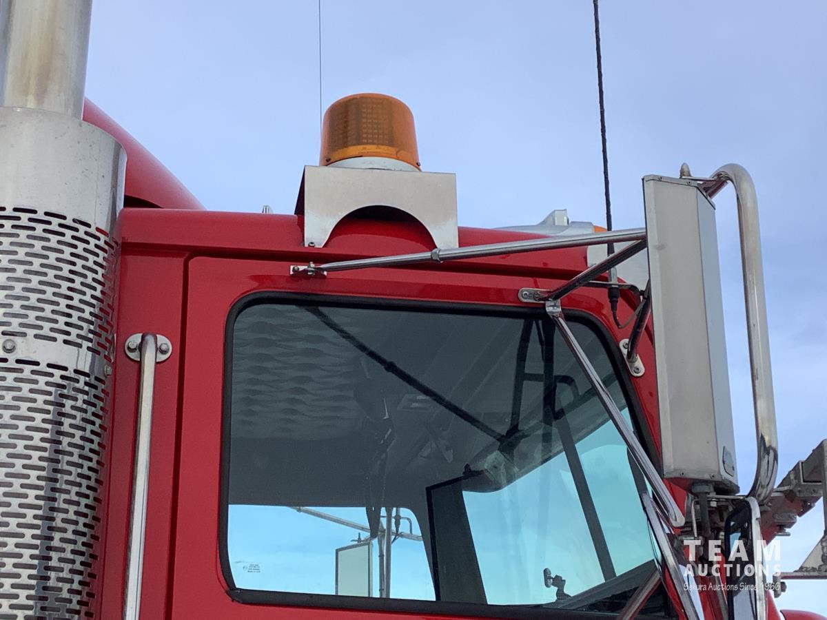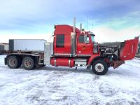 Detroit SERIES 60 515 HP Webasto diesel engine heater, engine brake, air suspension, 16,000 lb front axle, 46,000 lb rear axles, full lockers, 13 speed transmission with a Spicer 4 speed air shift auxiliary transmission, Brandon DP-50 hydraulic drive winch with the Alum Guy headache rack, air lift wide load sign, factory 10 wide cab mirrors, side cabinets, steps, decking, full rear fenders, rear live roll, all aluminum wheels, 385/65R22.5 front tires, 11R24.5 rear tires