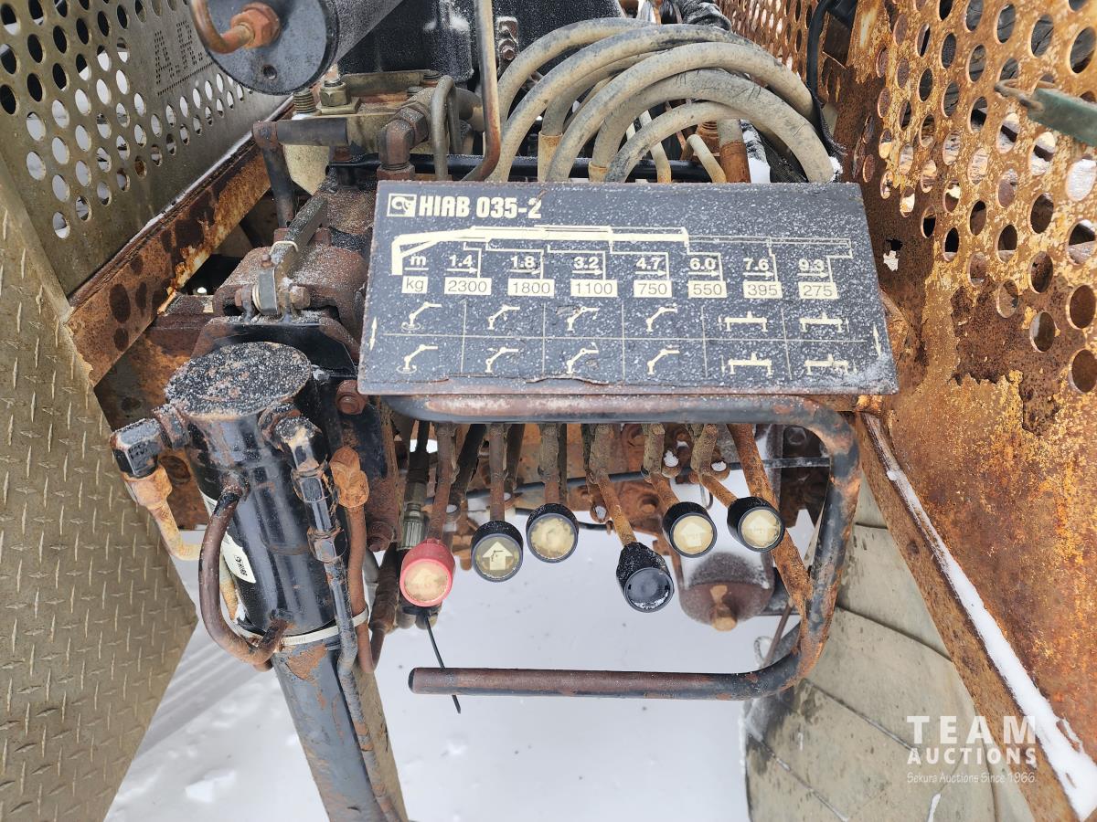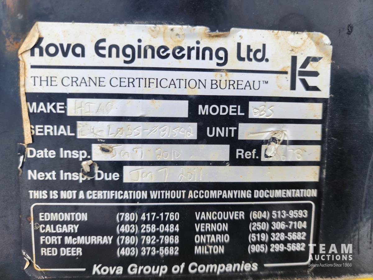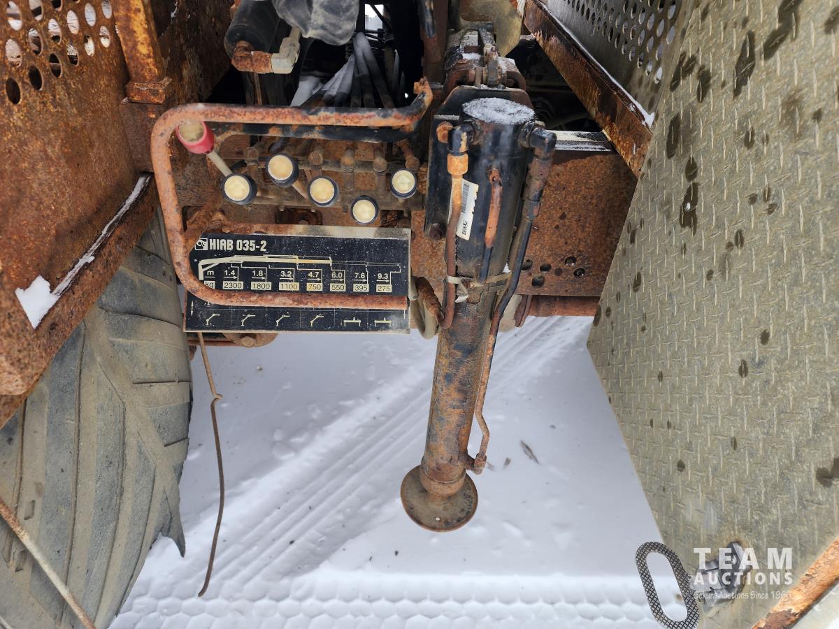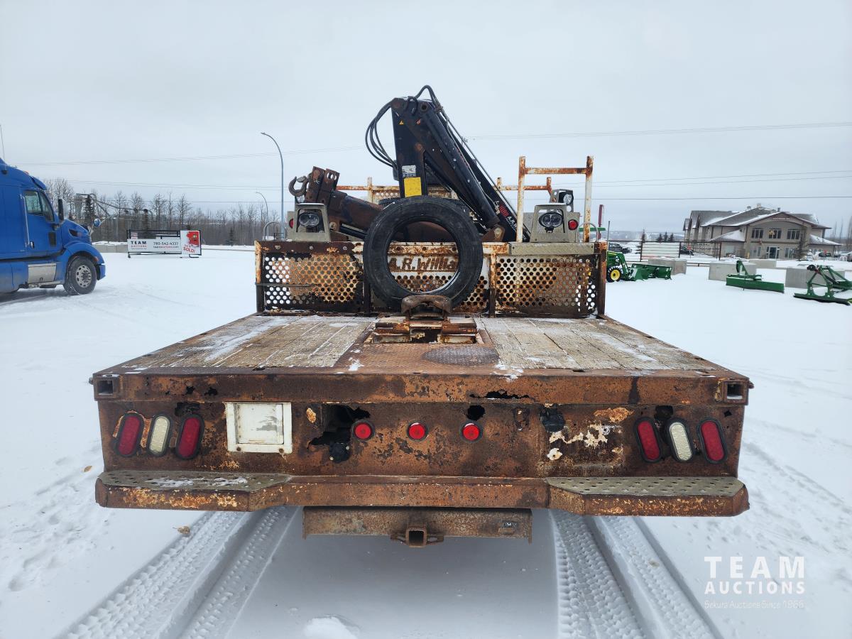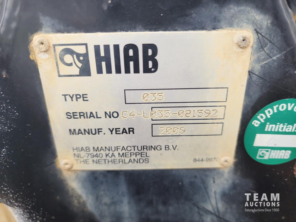6.8 L V10 gas engine, automatic transmission, A/C, cruise control, 6 ft deck, Hiab 035 2 section knuckle crane, outriggers, diff lock, tool boxes, 5th wheel hitch, 225/70R19.5 tires