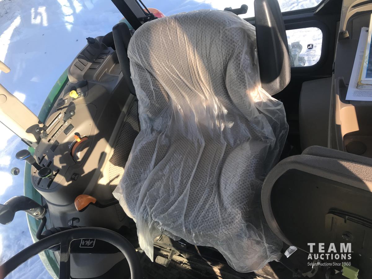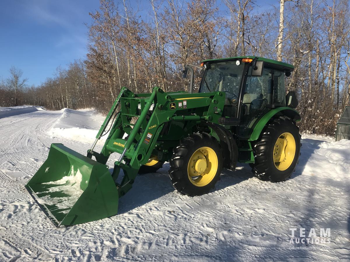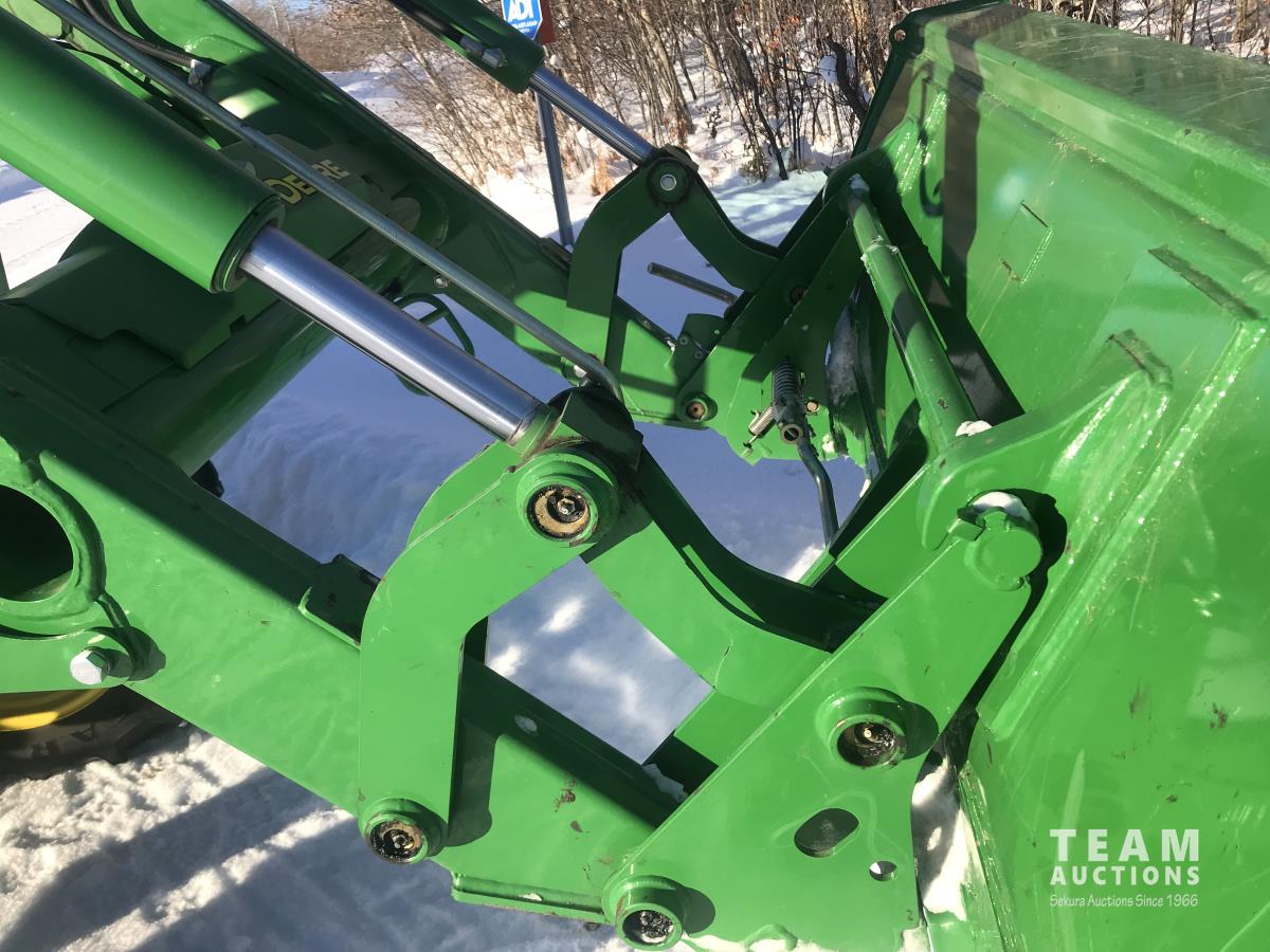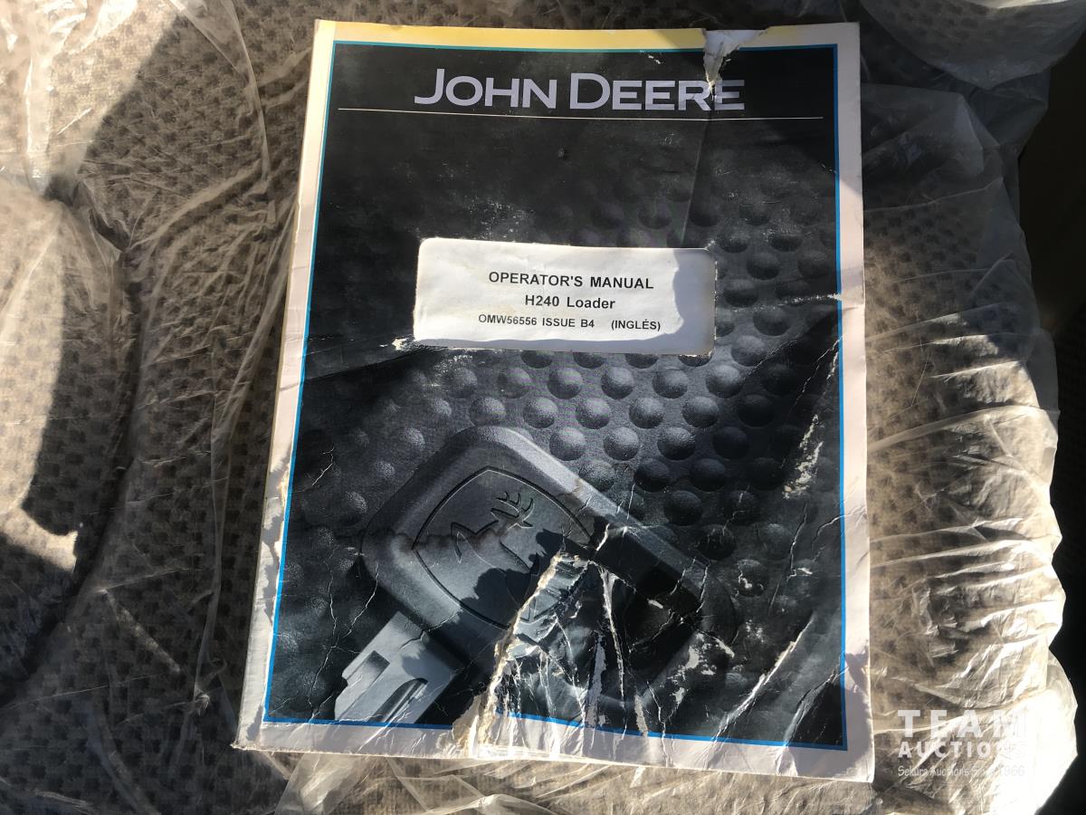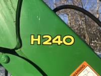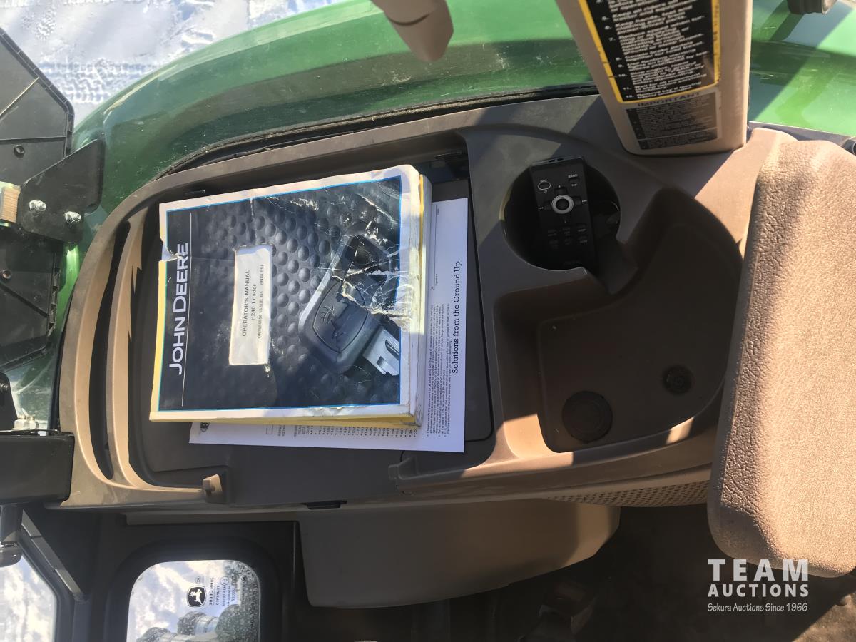 John Deere H240 loader, Q/A, bucket, 85 HP, engine, 70 PTO HP, null, left hand reverser, joystick, A/C, radio, buddy seat, 3 point hitch, 2 rear hydraulic outlets, 18.40/30 rear tires, 12 speed partially synchronized transmission, wet clutch, blue tooth, (2) power points, optional 540E PTO, remote 3 PT hitch switch