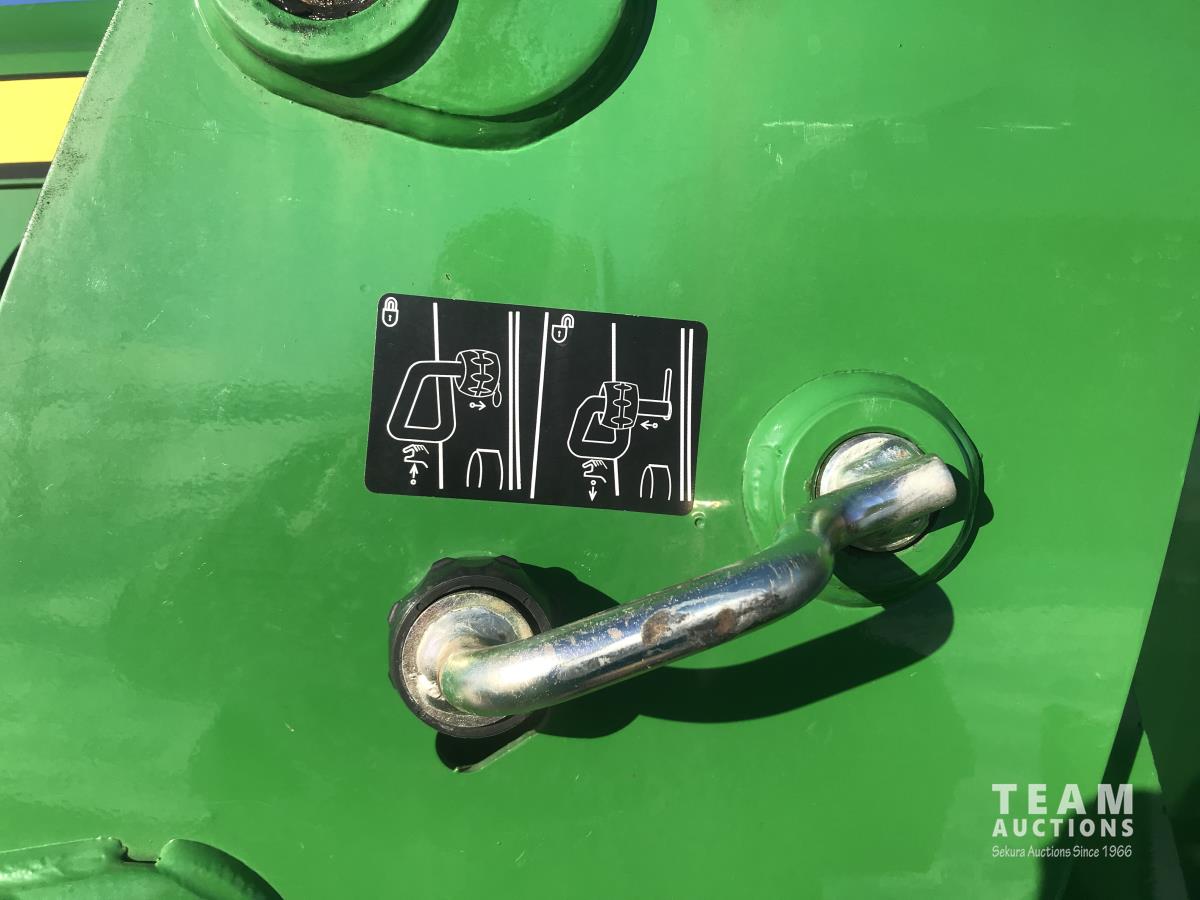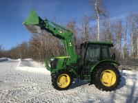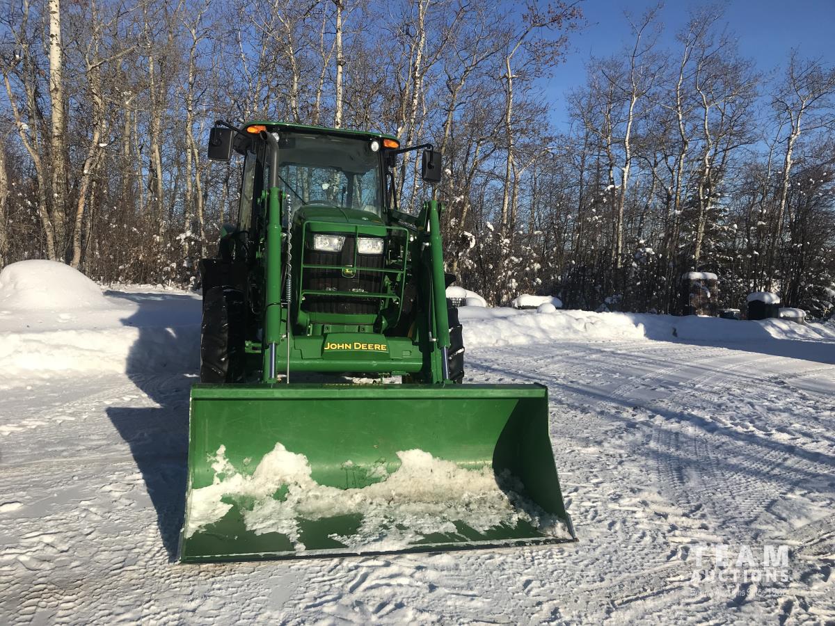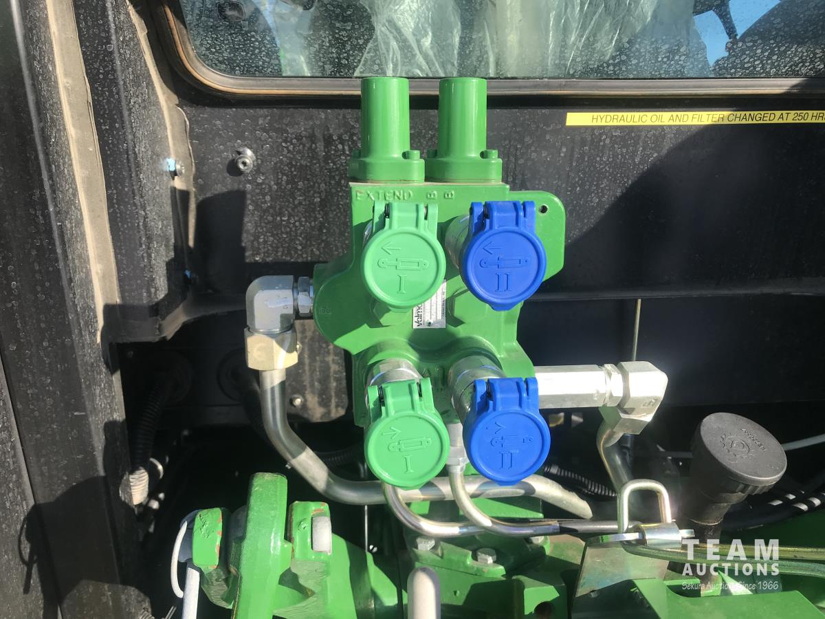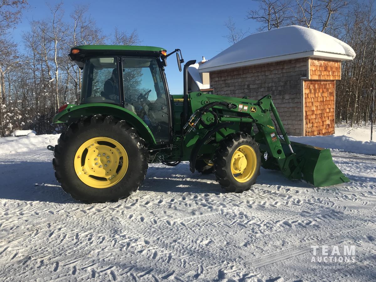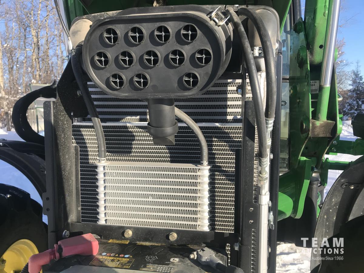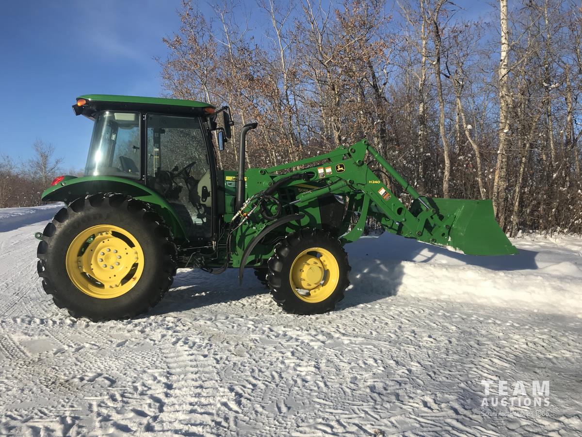 John Deere H240 loader, Q/A, bucket, 85 HP, engine, 70 PTO HP, null, left hand reverser, joystick, A/C, radio, buddy seat, 3 point hitch, 2 rear hydraulic outlets, 18.40/30 rear tires, 12 speed partially synchronized transmission, wet clutch, blue tooth, (2) power points, optional 540E PTO, remote 3 PT hitch switch