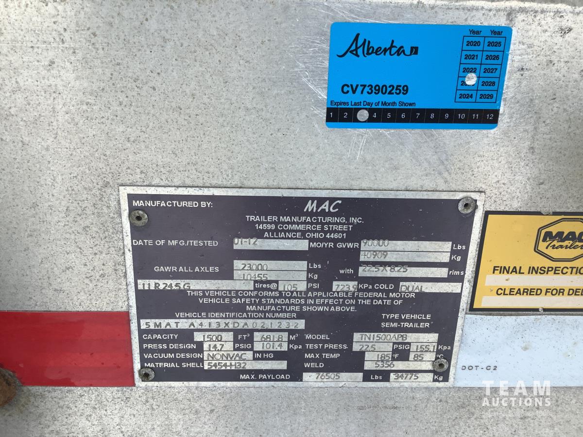 200 2013 Mac TN1500APB TRI/A 1500 Cft TRI/A Aluminum Pneumatic Bulk Trailer