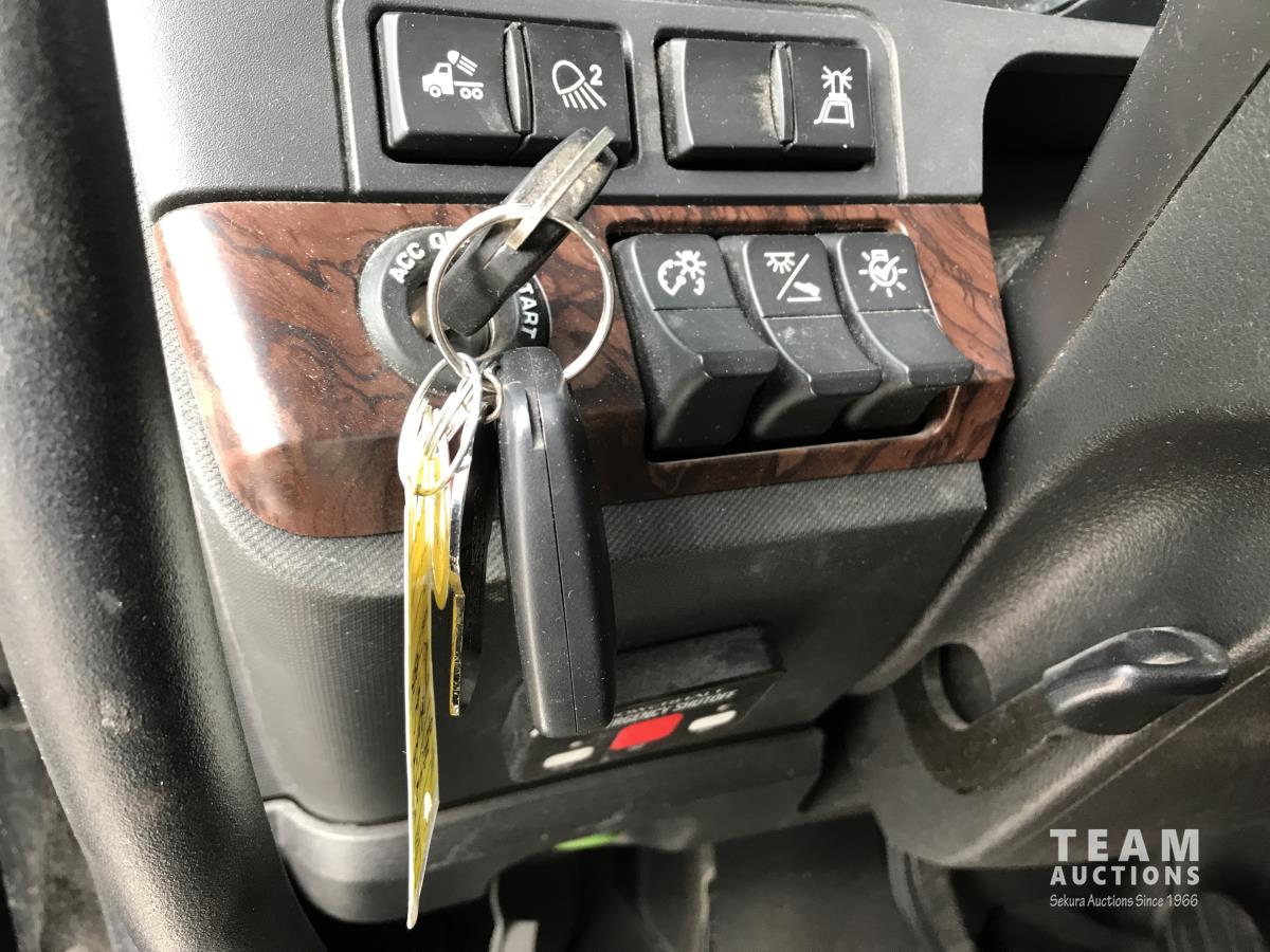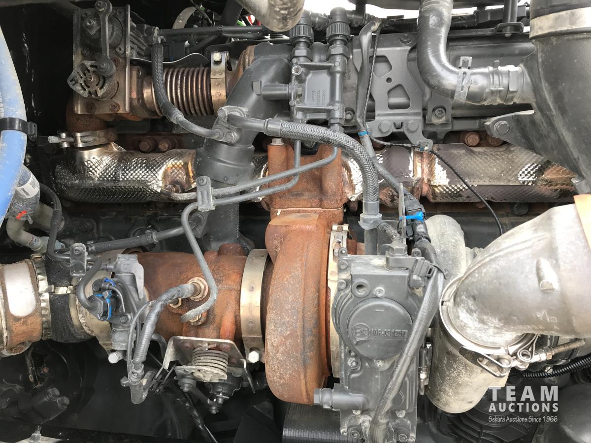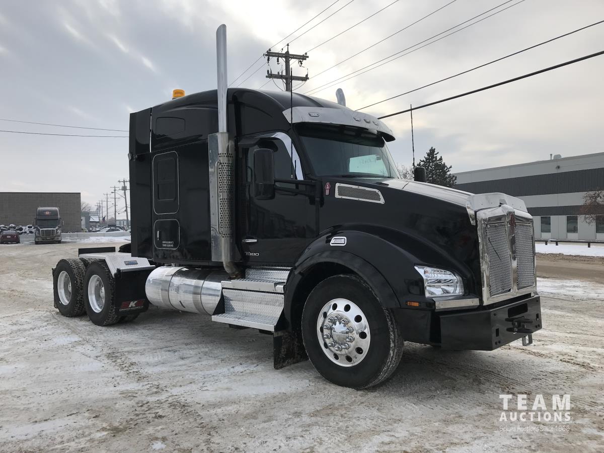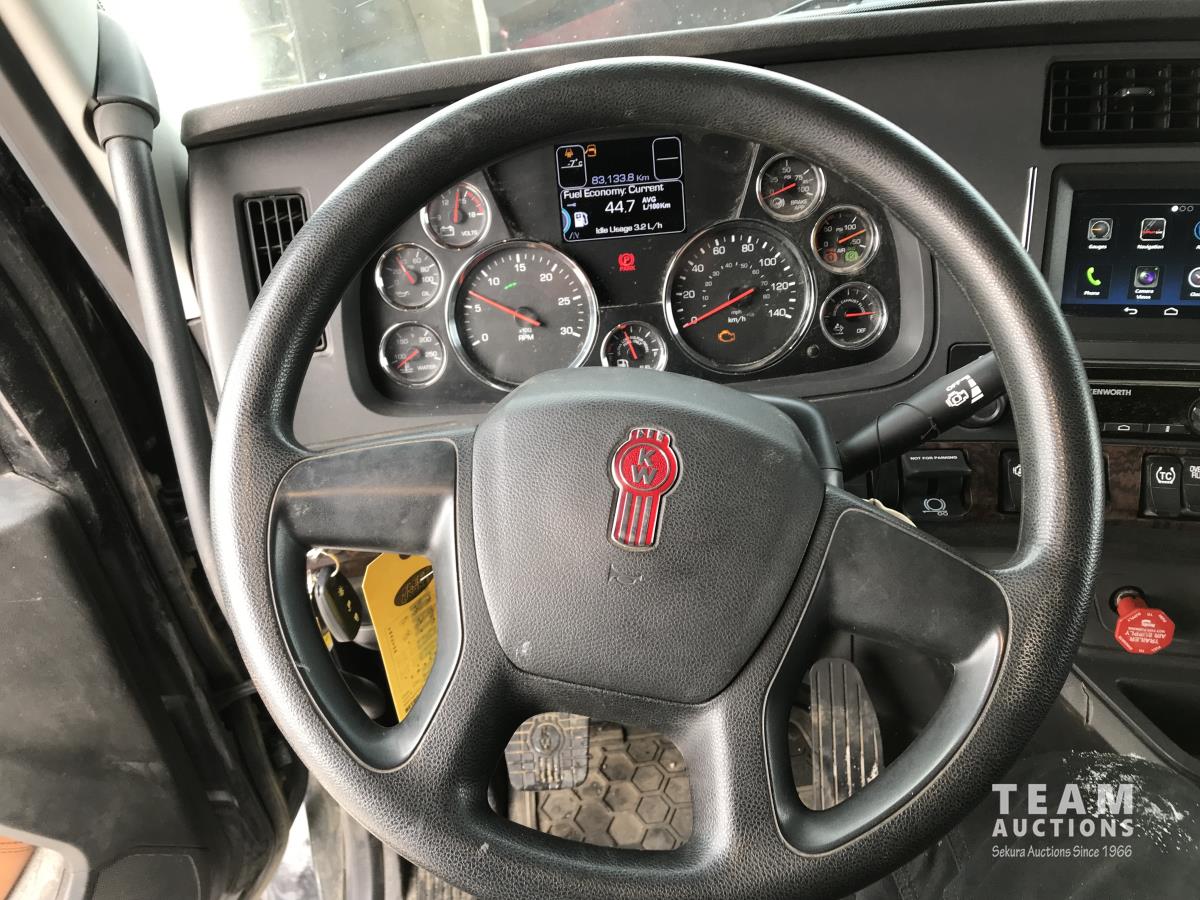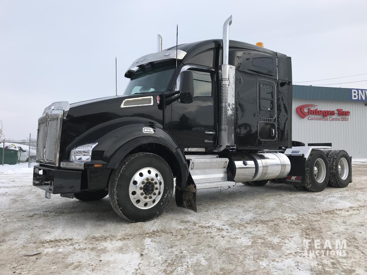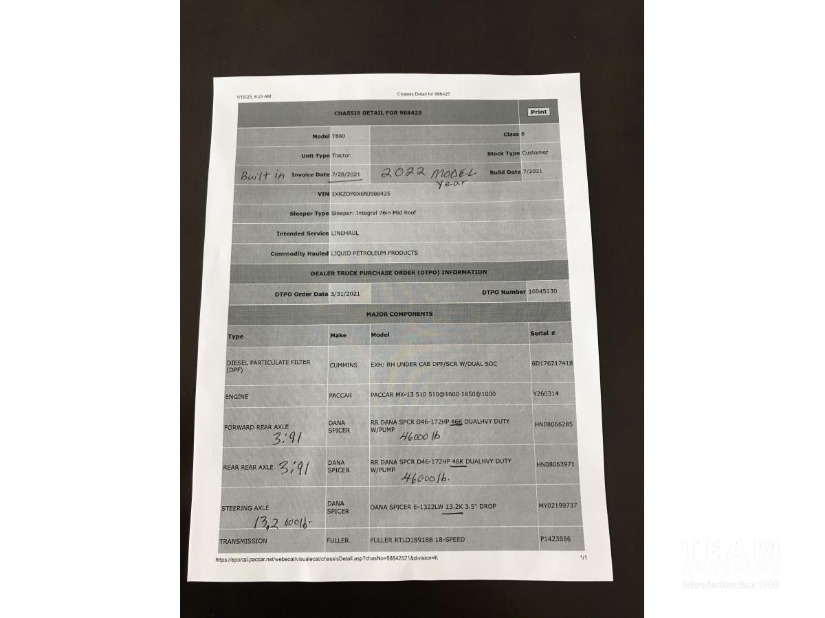 Paccar M-13 6 cylinder 510 HP Eaton Fuller 18 speed manual transmission, integral 72 inch Integral mid rise 76", sleeper, A/C, leather interior, air ride driver seat, 13,000 lb front axle, 46,000 lb rear axles, full lockers, 3.91 ratio, heavy duty driveline, engine and oil pan heater, key fob for door locks, cooler, Holland 5th wheel, PTO, fluid pump, remote greaser for front end, full front windshield privacy curtain, (2) battery shut off switches, on frame boosting terminal,, 11R24.5 tires