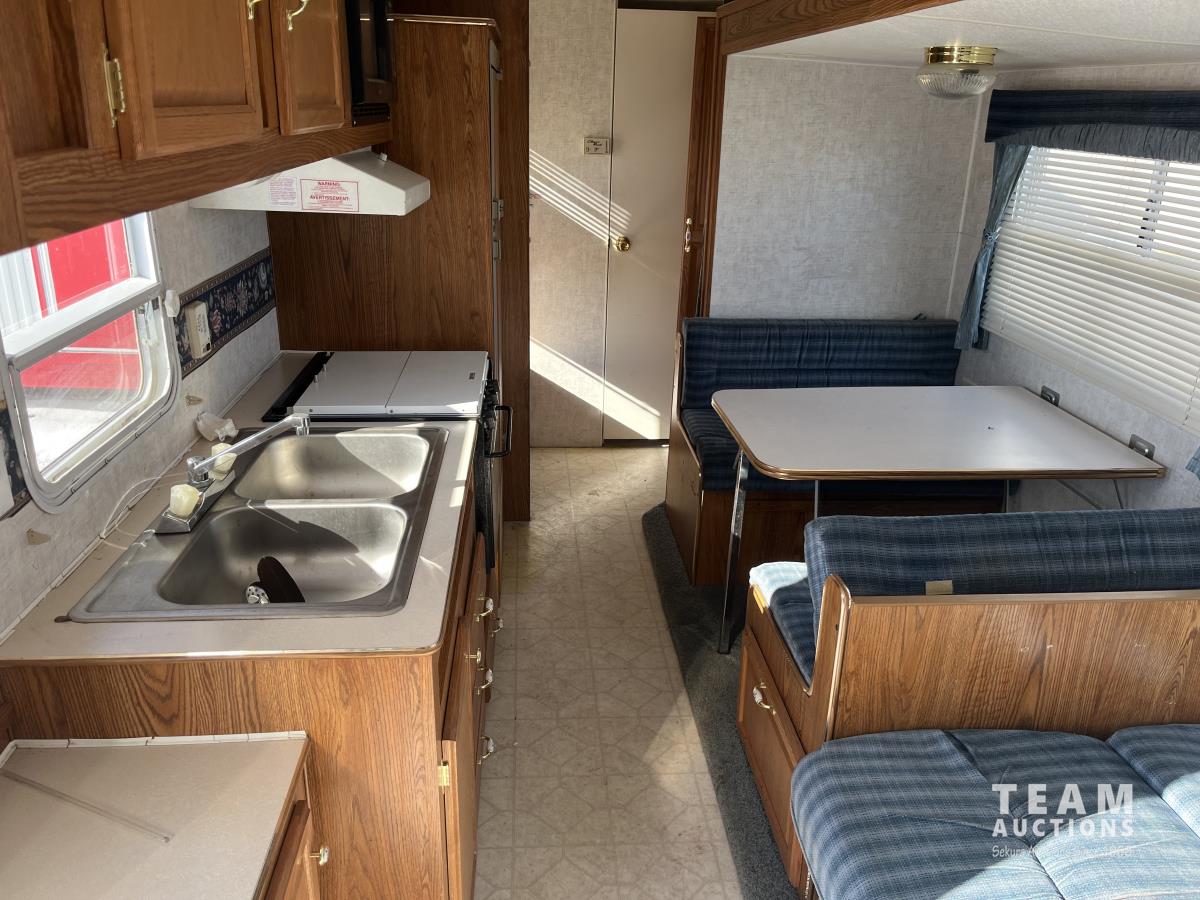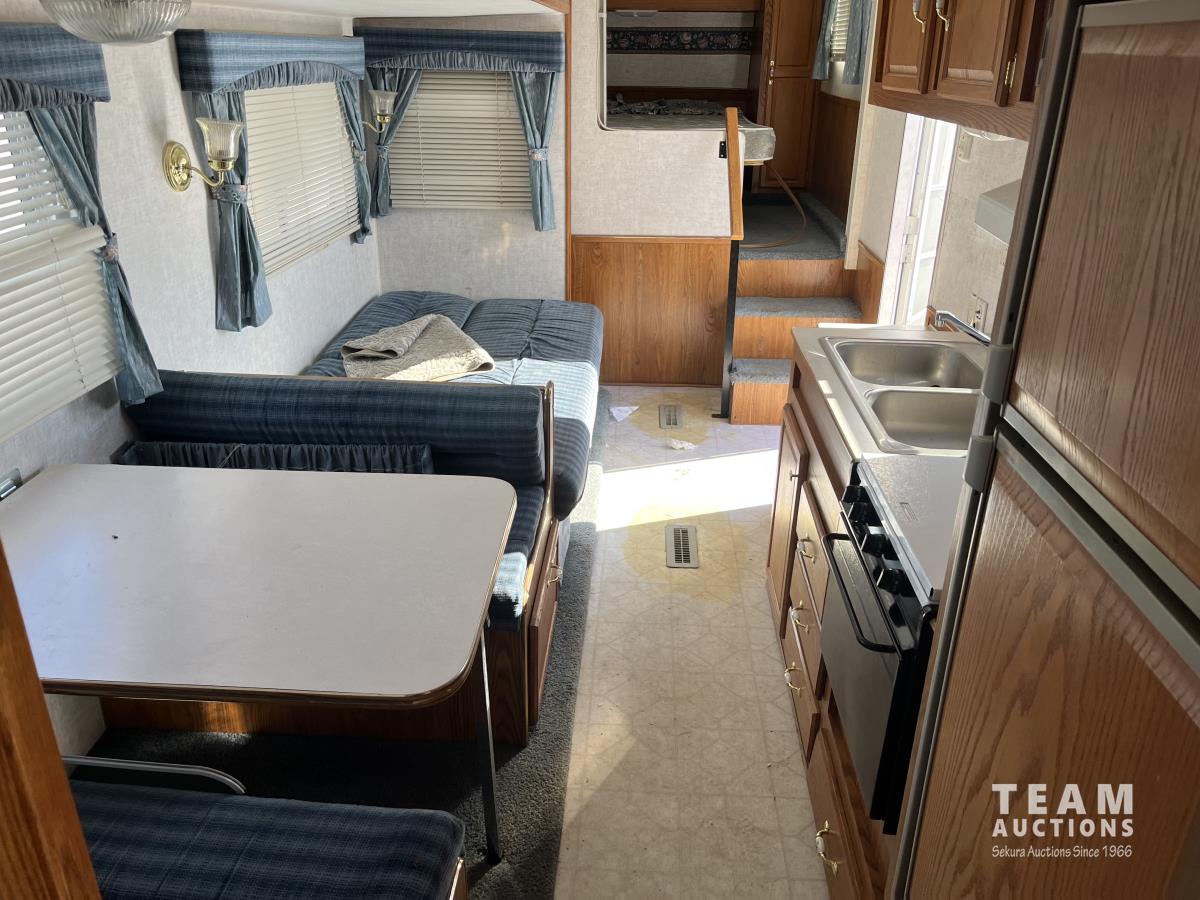 (1) power slide, awning, A/C, rear bunks, 225/75R15, rear corner damage