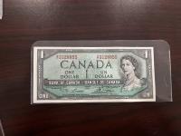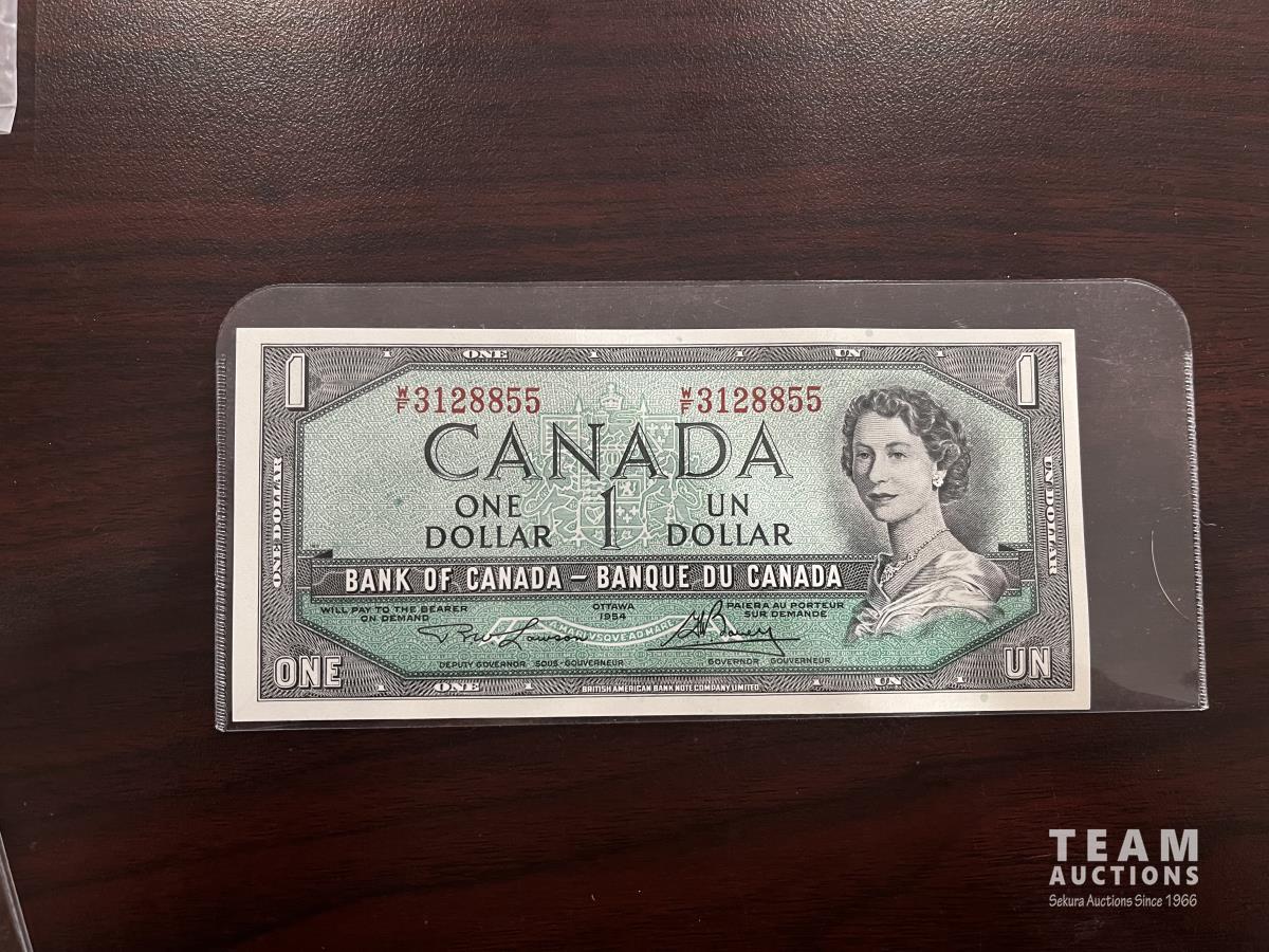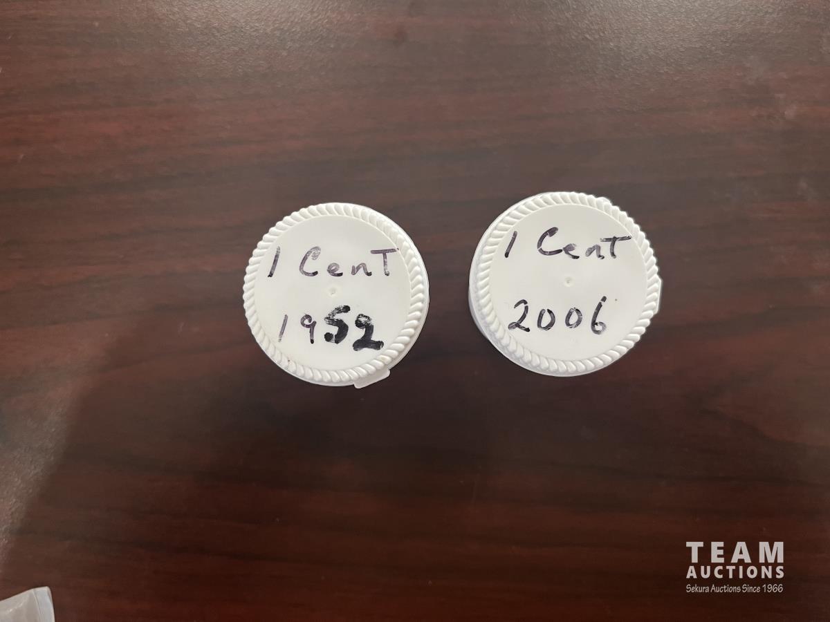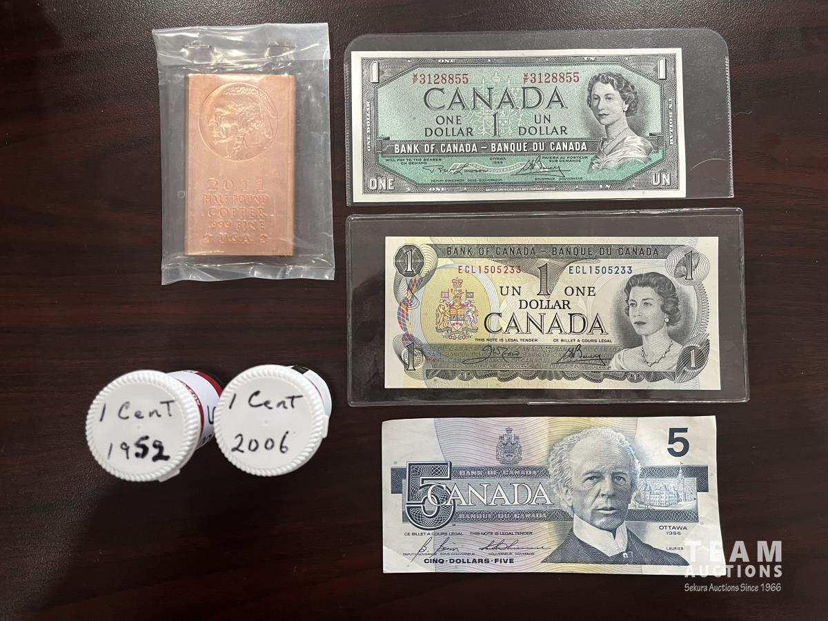 (1) 1954 One Dollar Bill, (1) 1973 One Dollar Bill, (1) 1986 Five Dollar Bill, 2011 Half Pound Copper, Qty of 1952 1 Cents, Qty of 2006 1 Cents