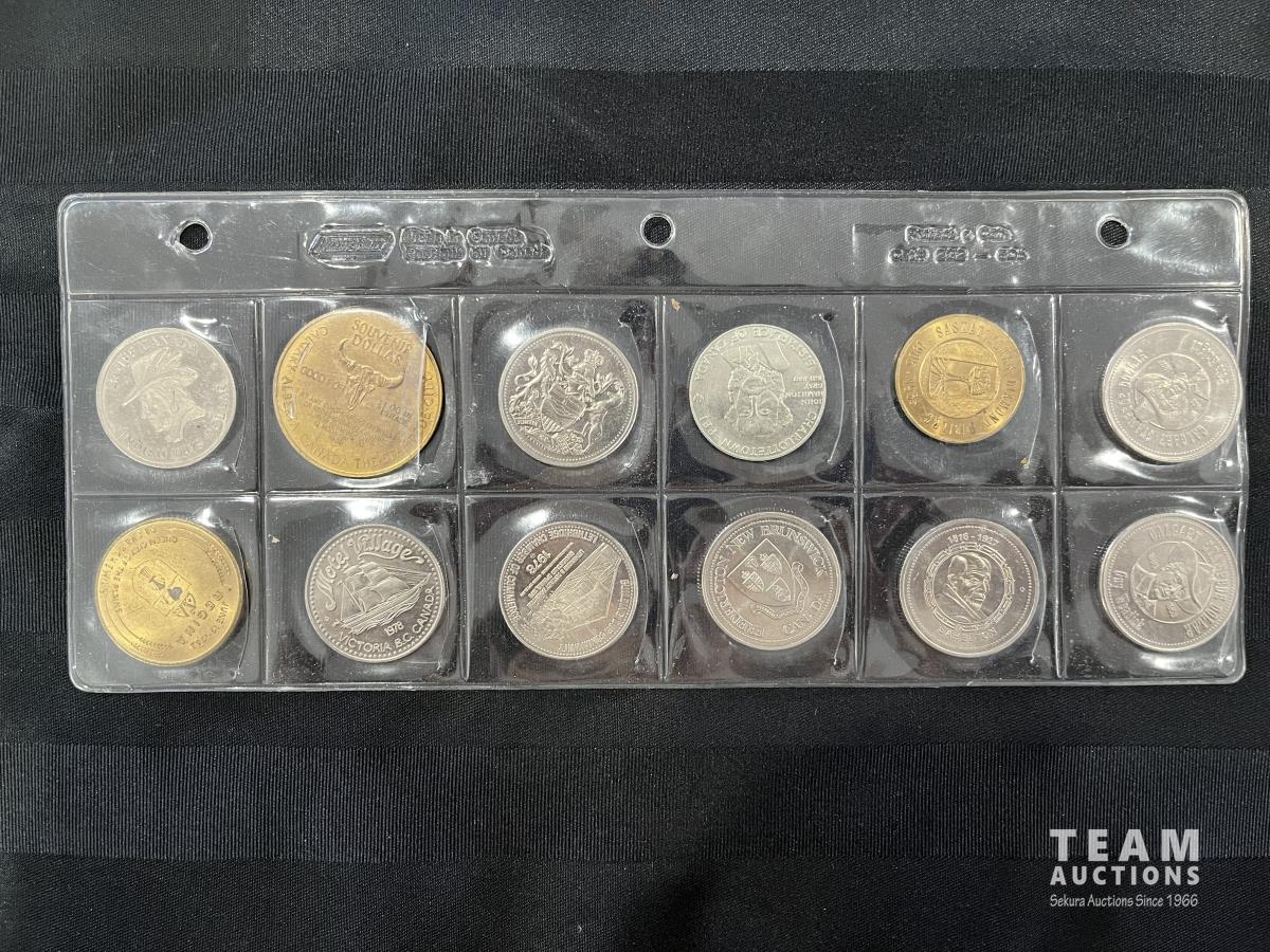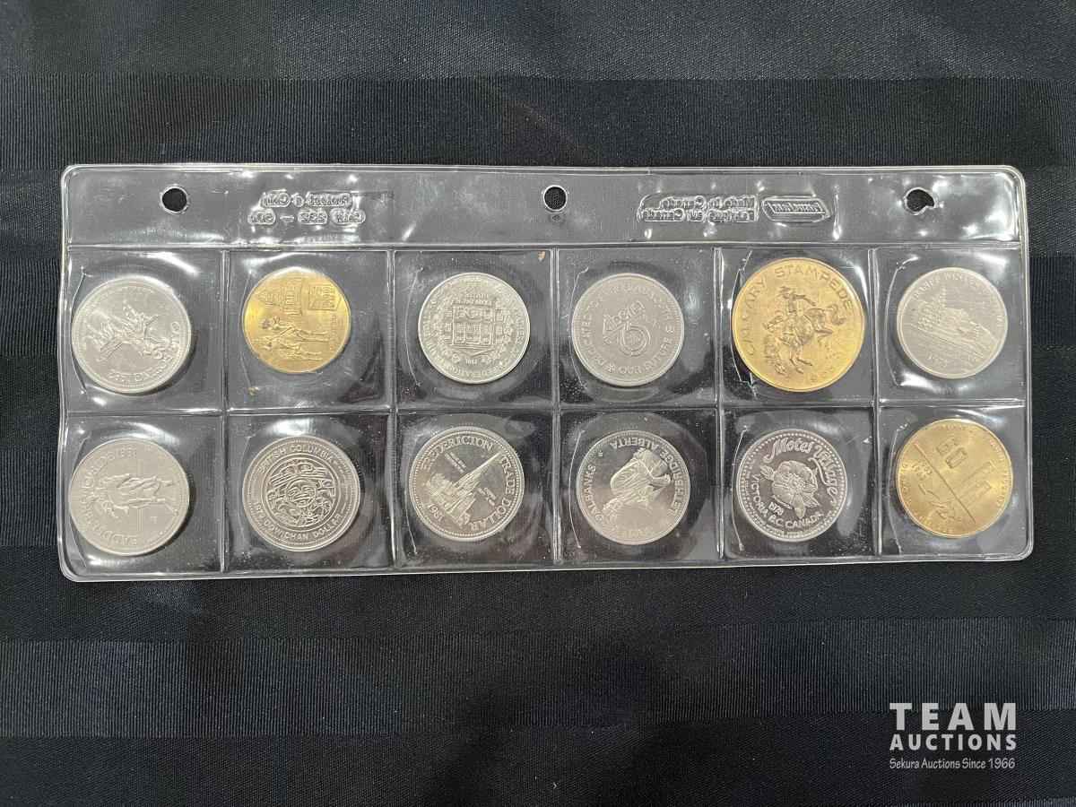 1975 Banff Winter Festival Coin, 1965 Calgary Stampede Souvenir Dollar, 1905-1980 Alberta Dedication to Youth Coin, 1981 Father of Confederation Trade Dollar, 1905-1965 Saskatchewan Diamond Jubilee Coin, 1982 Pete Knight Calgary Stampede Dollar, 1963 Regina Saskatchewan Diamond Jubilee Coin, 1978 Motel Village Victoria BC Coin, 1978 Lethbridge & District Exhibition Grandstand Opening Dollar, 1981 New Brunswick Fredericton Trade Dollar, 1979 British Columbia Cowichan Dollar, 1981 Guy Weadick Calgary Stampede Dollar