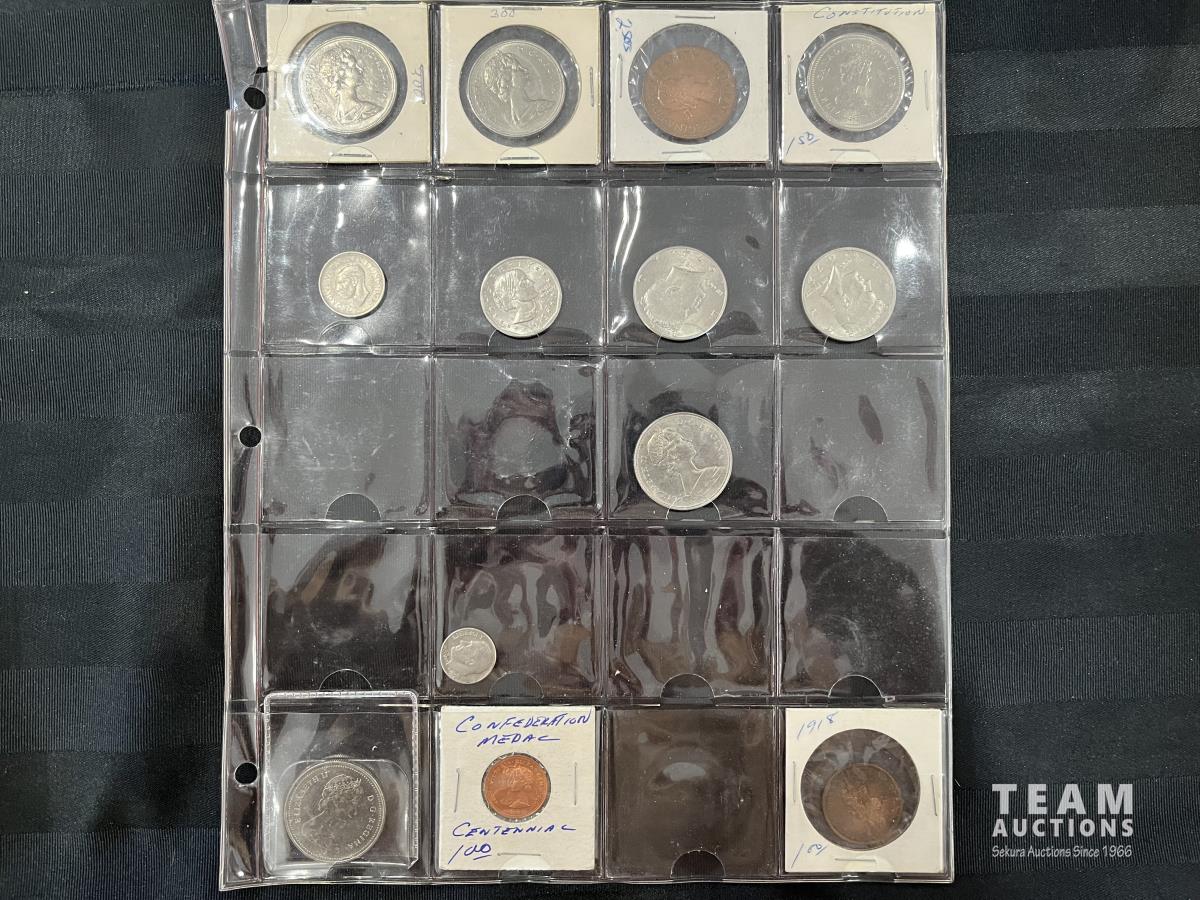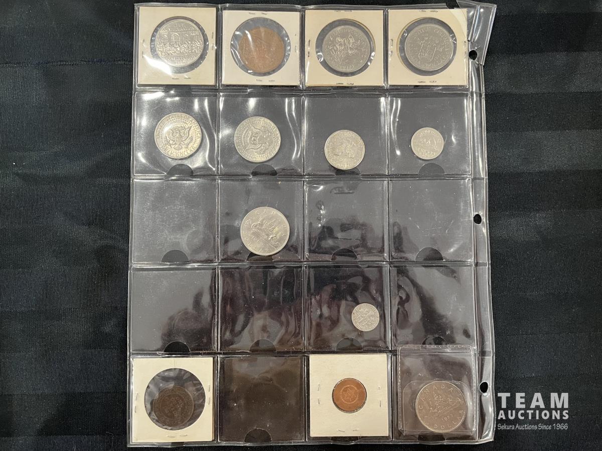 1871-1971 BC Canadian Dollar, 1870-1970 Manitoba Canadian Dollar, 1967 One Penny, 1982 Canadian Dollar, 1942 Canadian Nickel, 1979 United States of America One Dollar, 1974 United States of America Half Dollar, 1972 United Stated of America Half Dollar, 1969 Canadian Dollar, 1976 United States of America Dime, 1983 Canadian Dollar, 1867-1967 Confederation Metal Coin, 1918 Canadian One Cent Coin