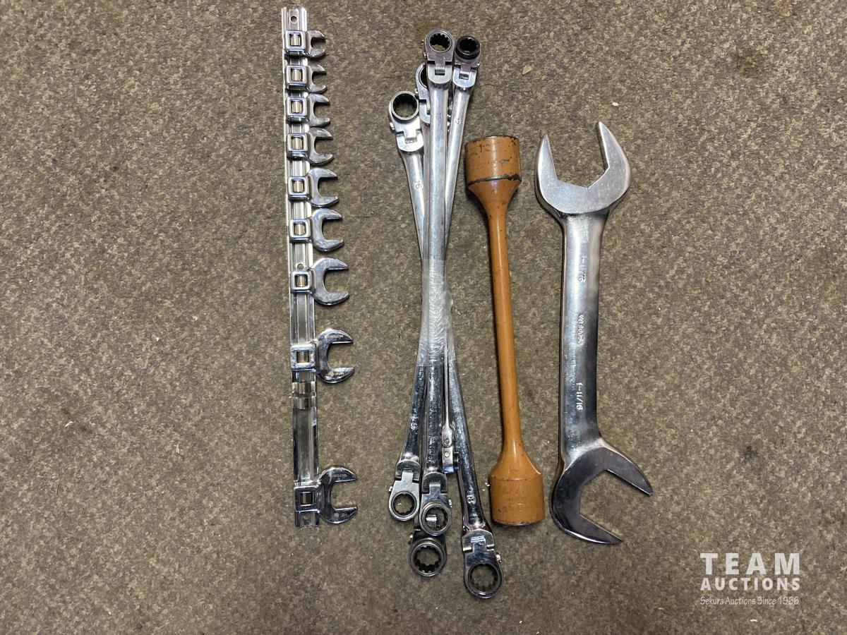 (5) ratchet wrenches, (9) crows feet, torque socket, combination wrench