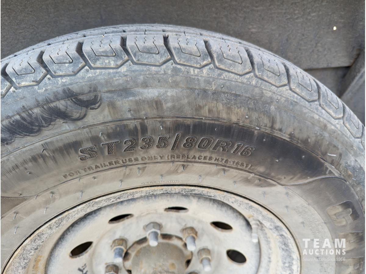 Ball hitch, 6 ft 10 inch box width, 26 inch side wall height, roll tarp, electric brakes, spring suspension, 7,000 lb axles, 235/80R16 tires