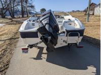 Mercury 120 HP 4 cylinder, two stroke outboard. Tune up and service less than 25 hrs ago. Comes with spare prop, lines, bumpers and boat cover. Trailer is 1997 Escort. 373-13ST tires.