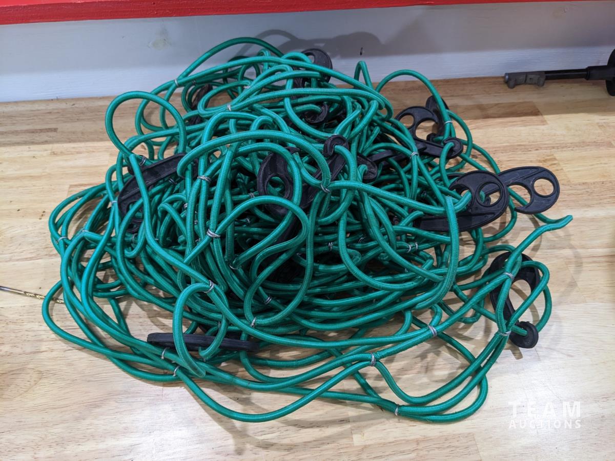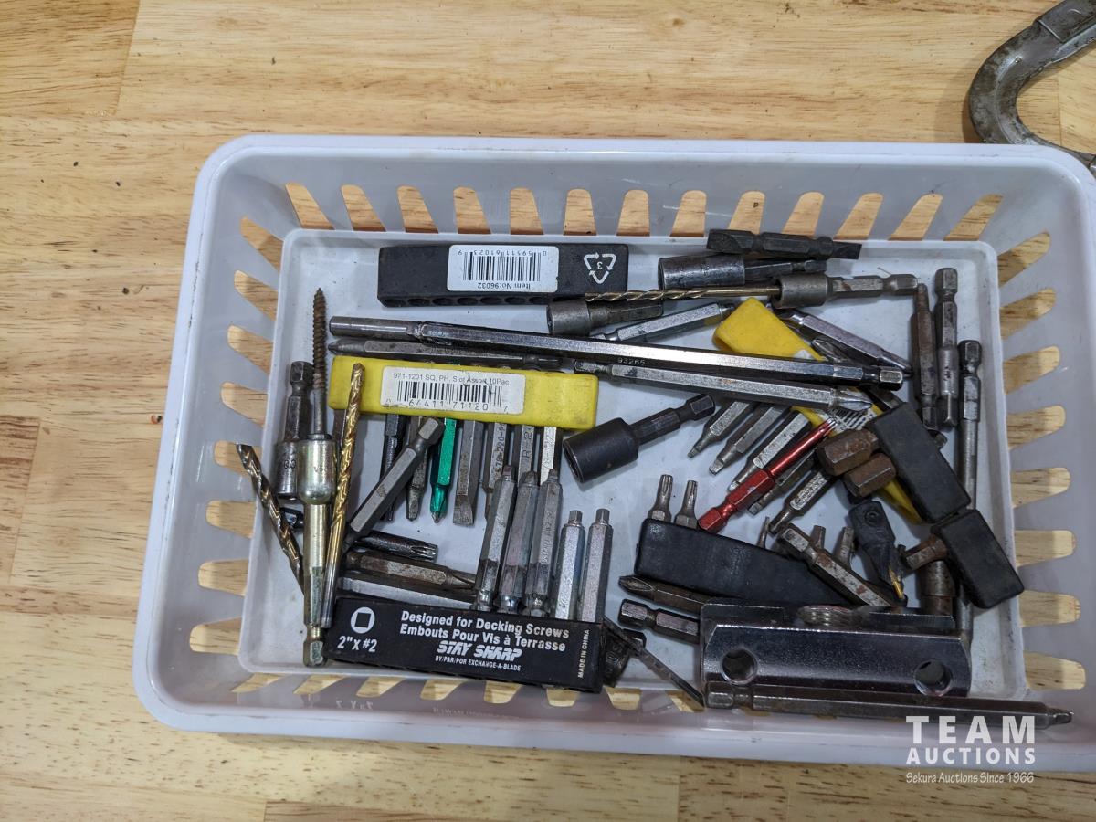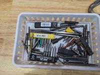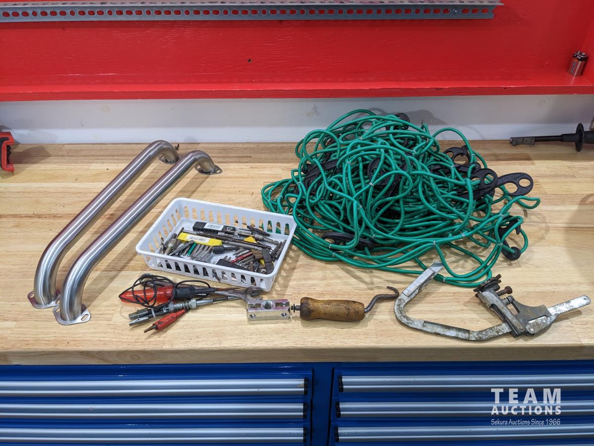 Assorted bits, test light, cargo net, (2) stainless handles and assorted tools