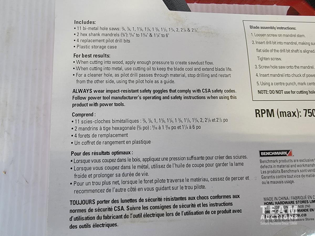 2197 Benchmark Bi-Metal Hole Saw set (Unused)
