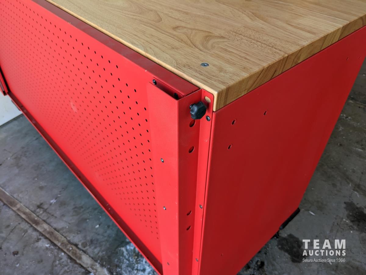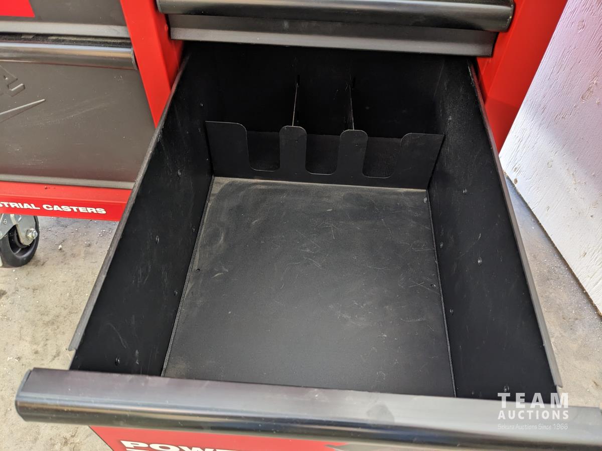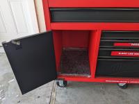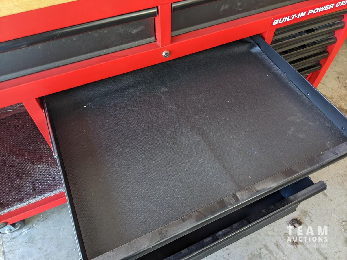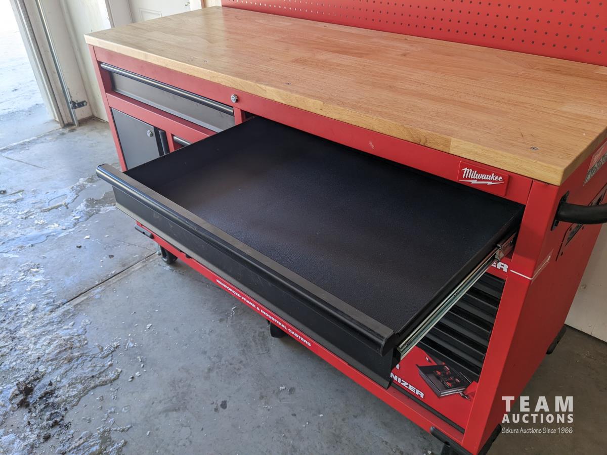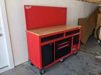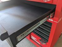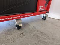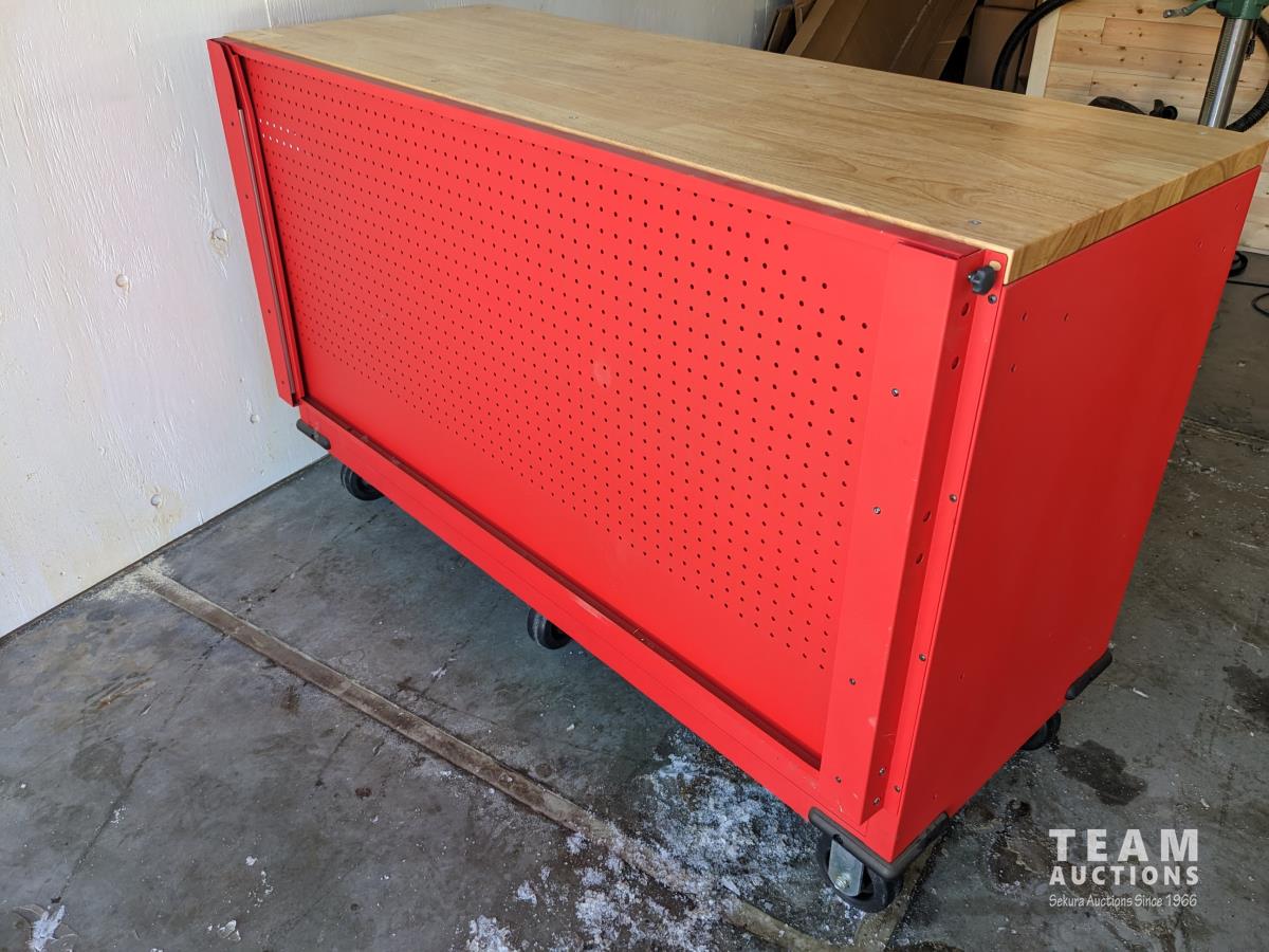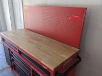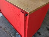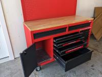 (11) drawers with ball bearing slides, (1) cabinet, (6) heavy casters (4) with brake, natural finish wood top, adjustable sliding tool peg board, 22 inch wide X 60 inch long X 38 inch high, locks with key