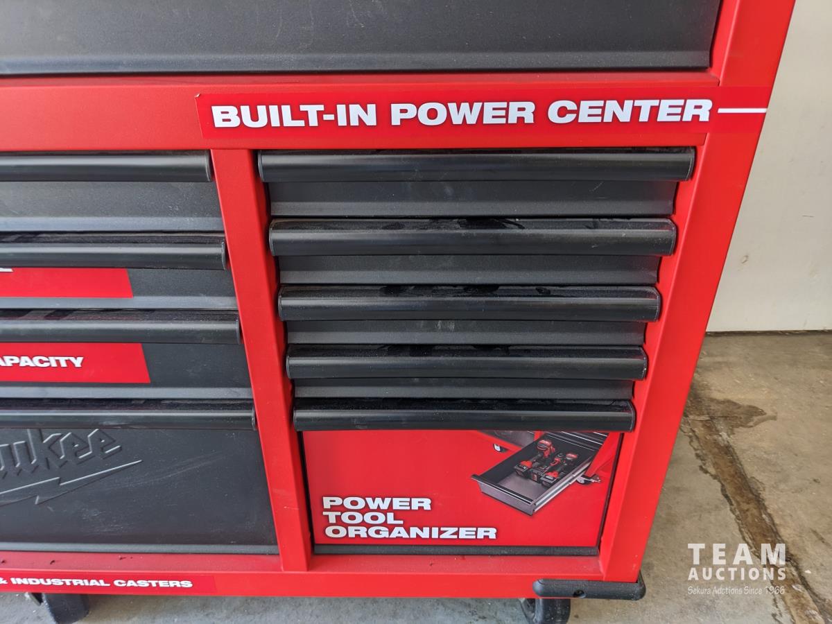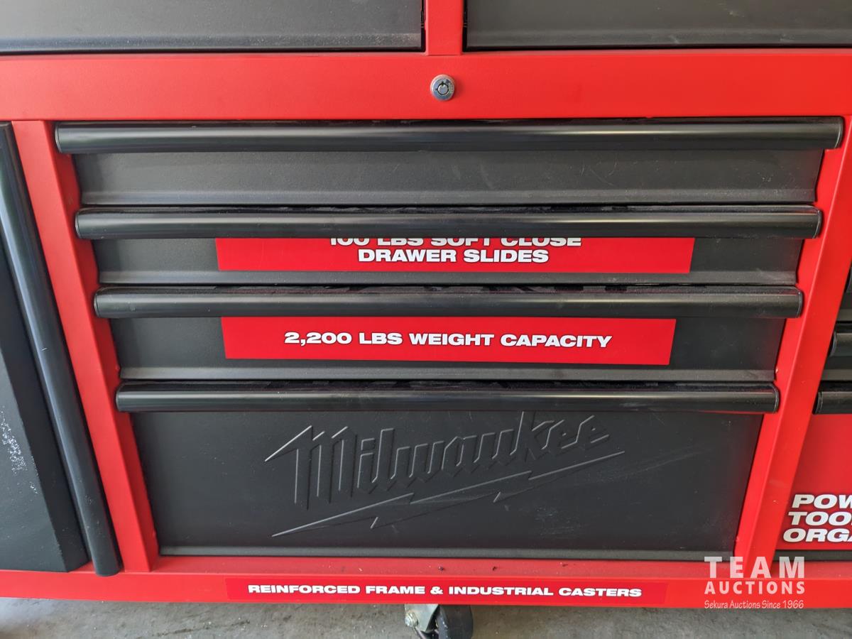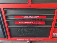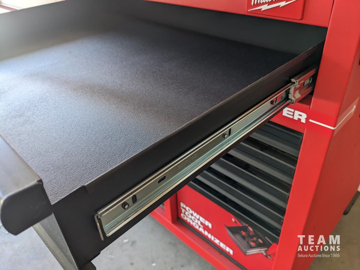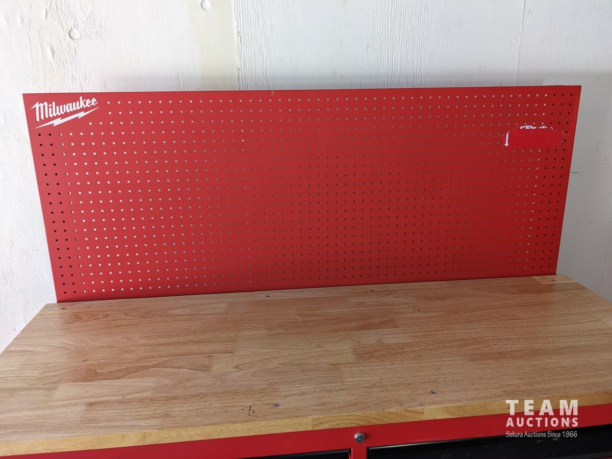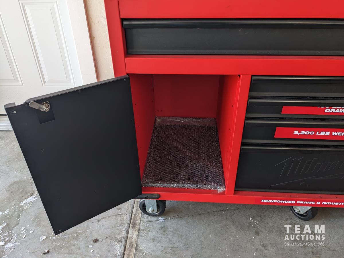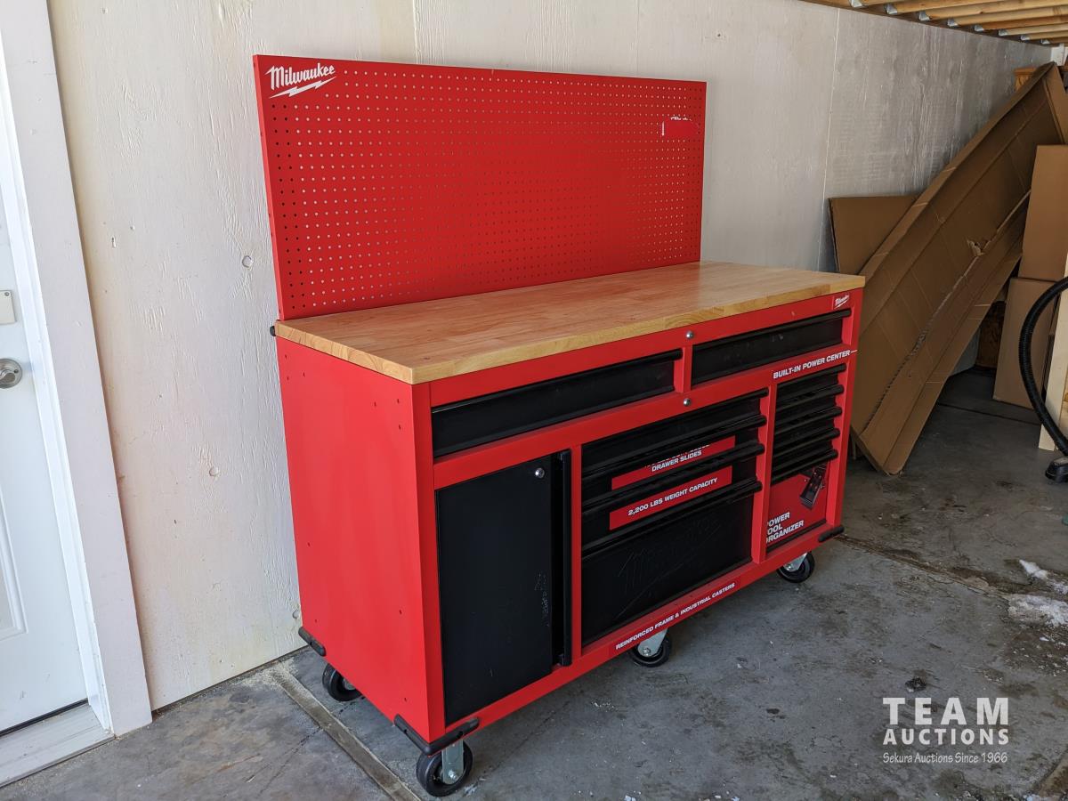 (11) drawers with ball bearing slides, (1) cabinet, (6) heavy casters (4) with brake, natural finish wood top, adjustable sliding tool peg board, 22 inch wide X 60 inch long X 38 inch high, locks with key
