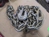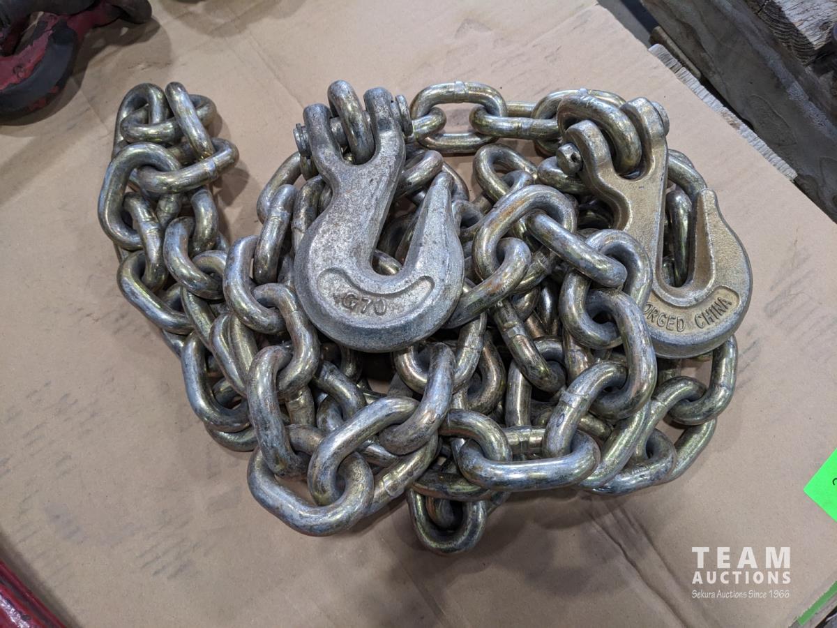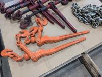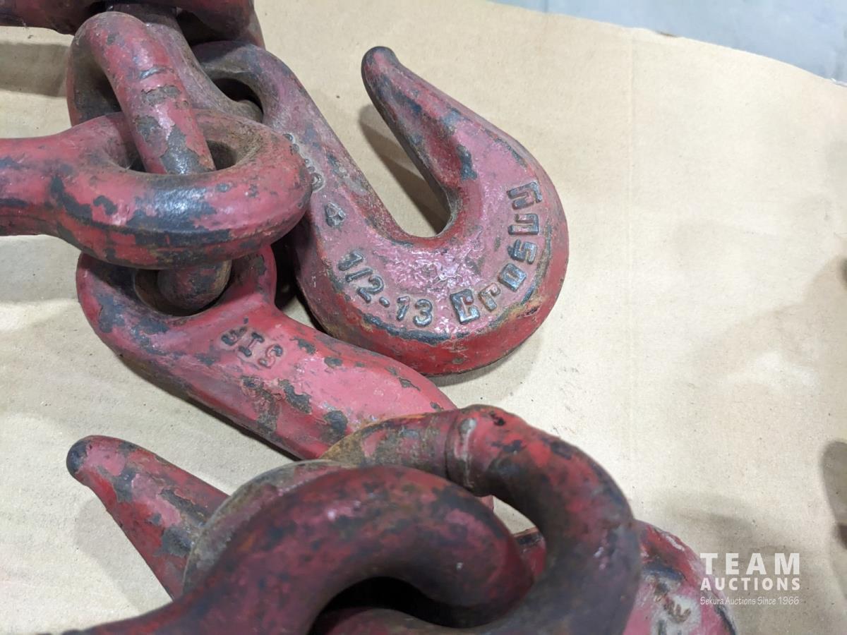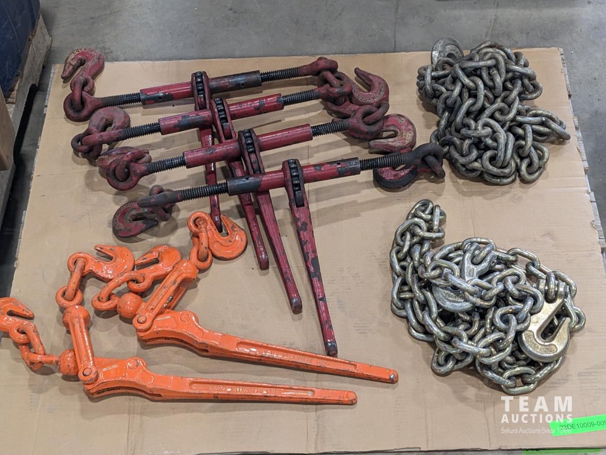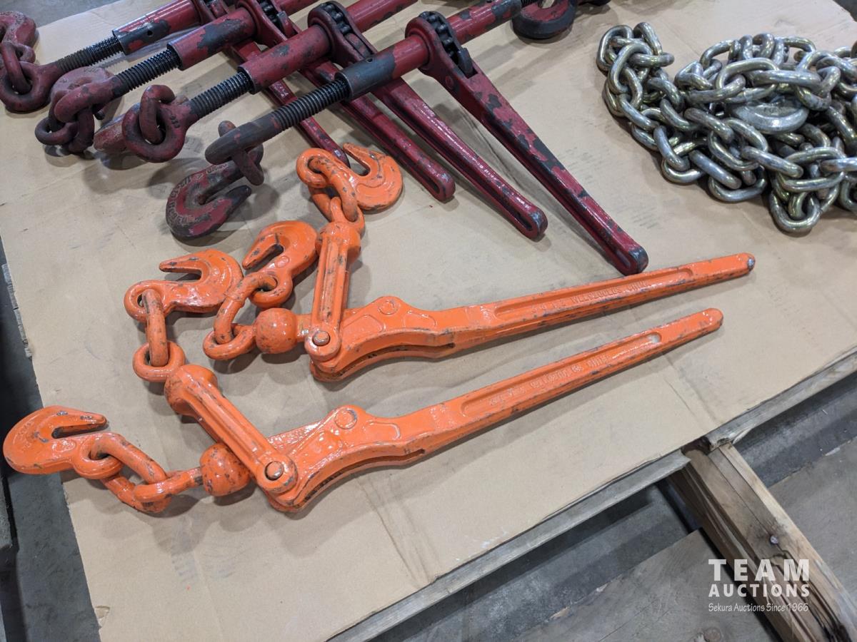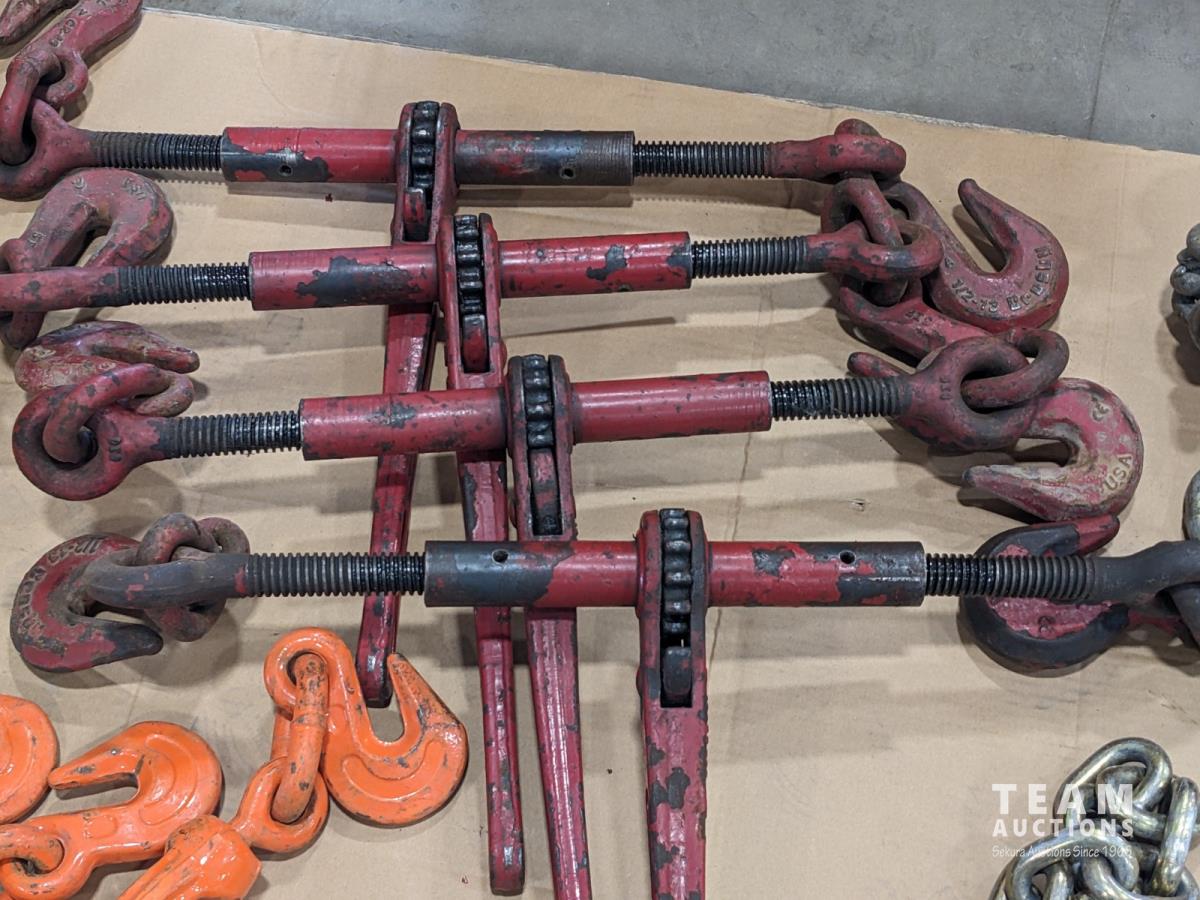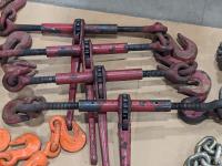 (4) Crosby USA 1/2 inch ratchet boomers, (2) WLL 3/8 inch - 1/2 inch load boomers and (2) 1/2 inch x12 ft GR70 chains