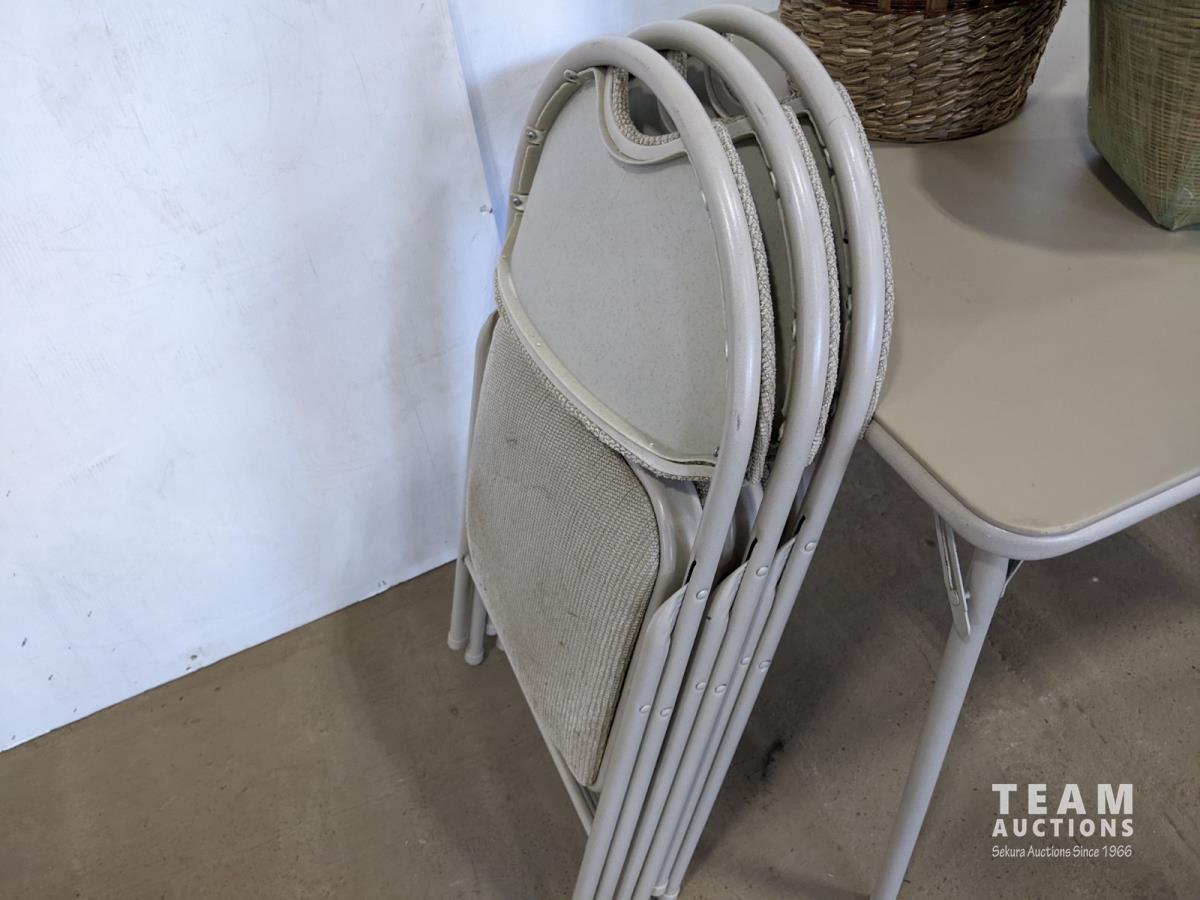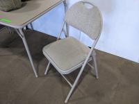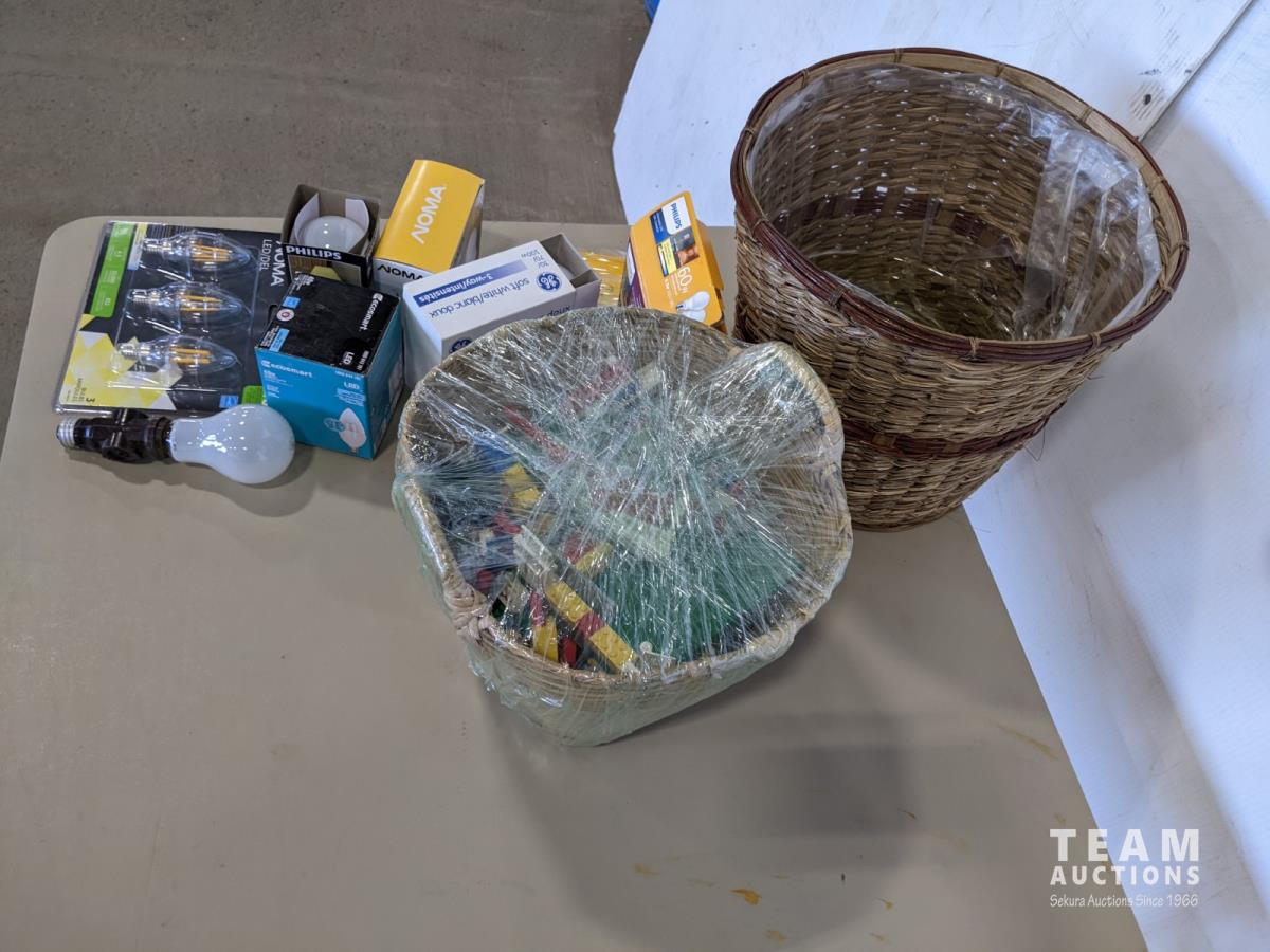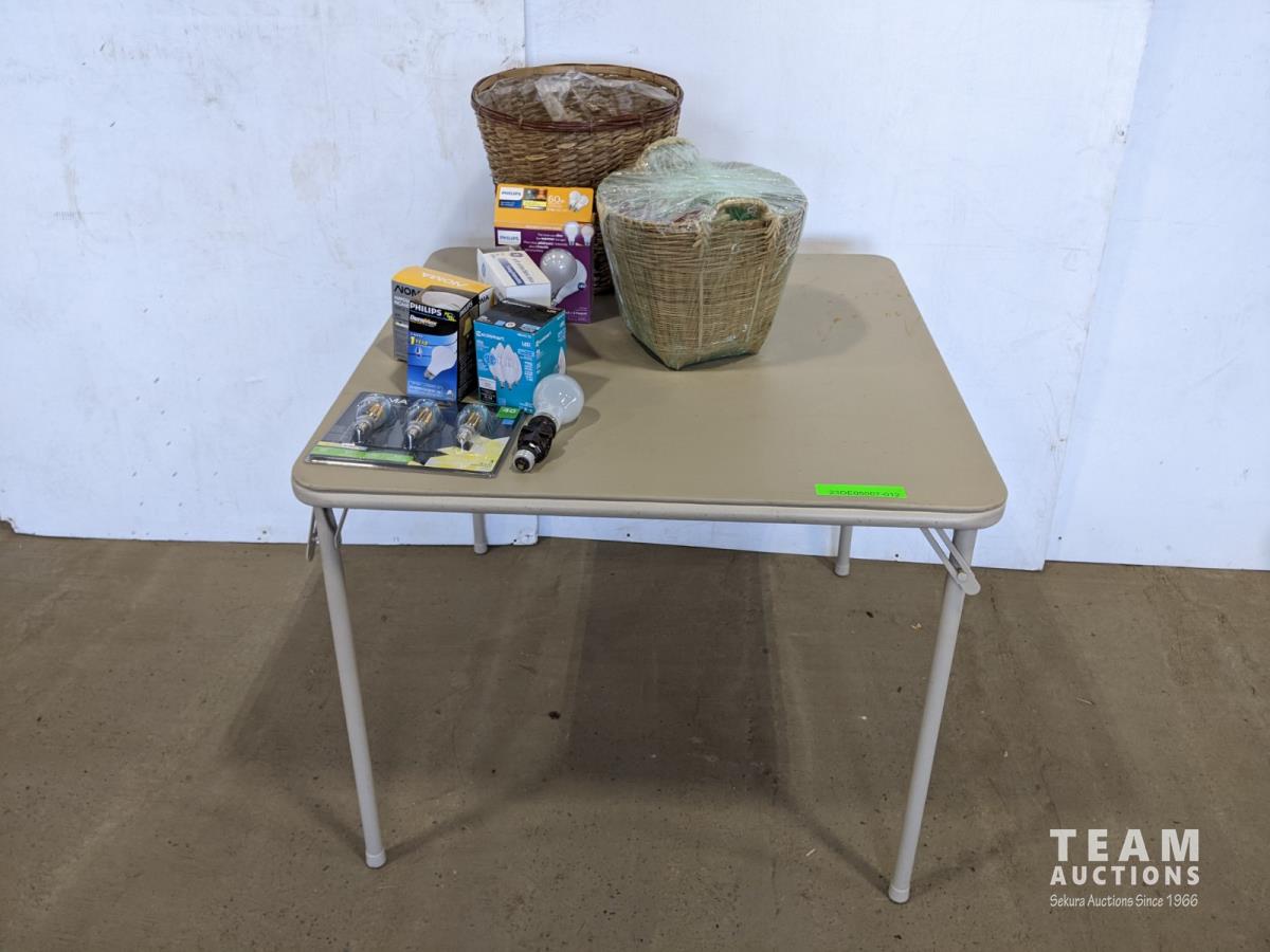 Folding table, basket of lego, qty of light bulbs and (4) folding chairs
