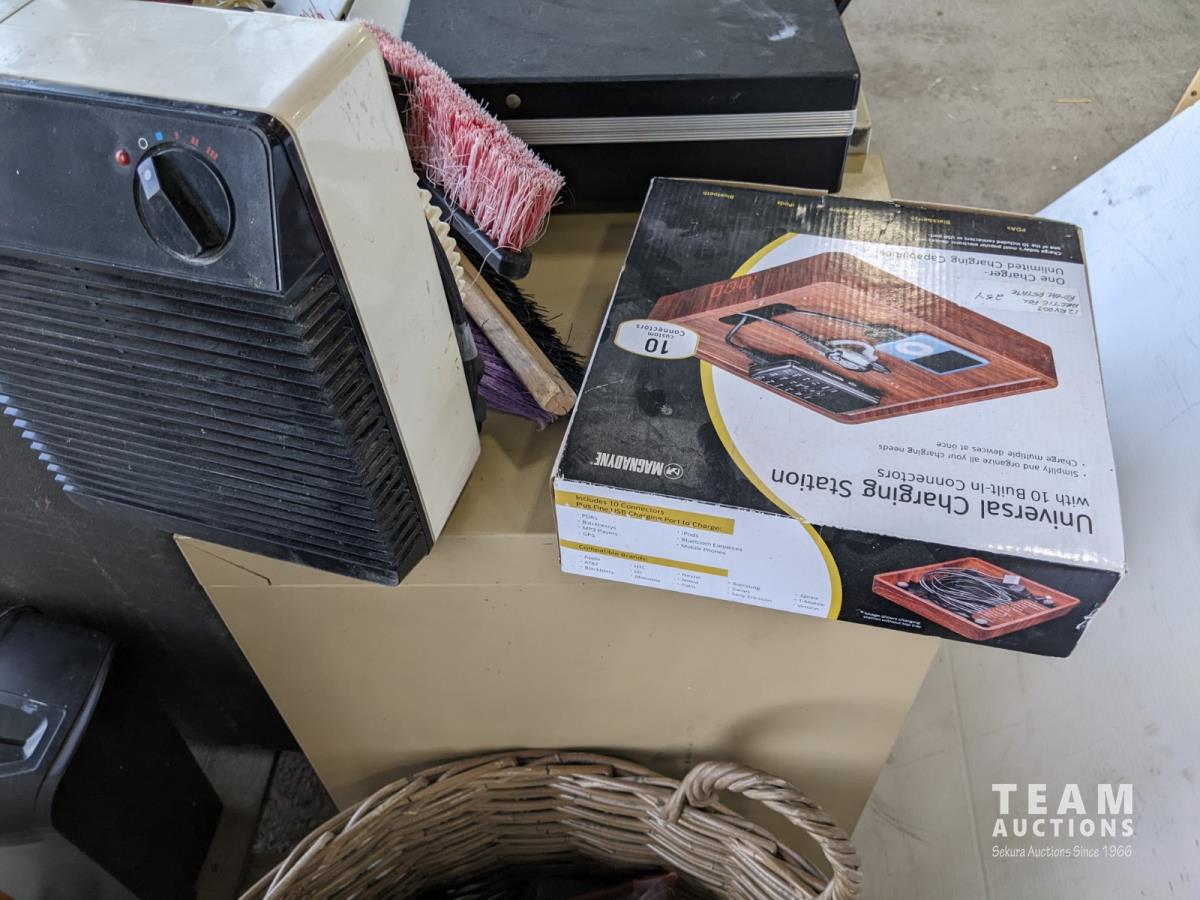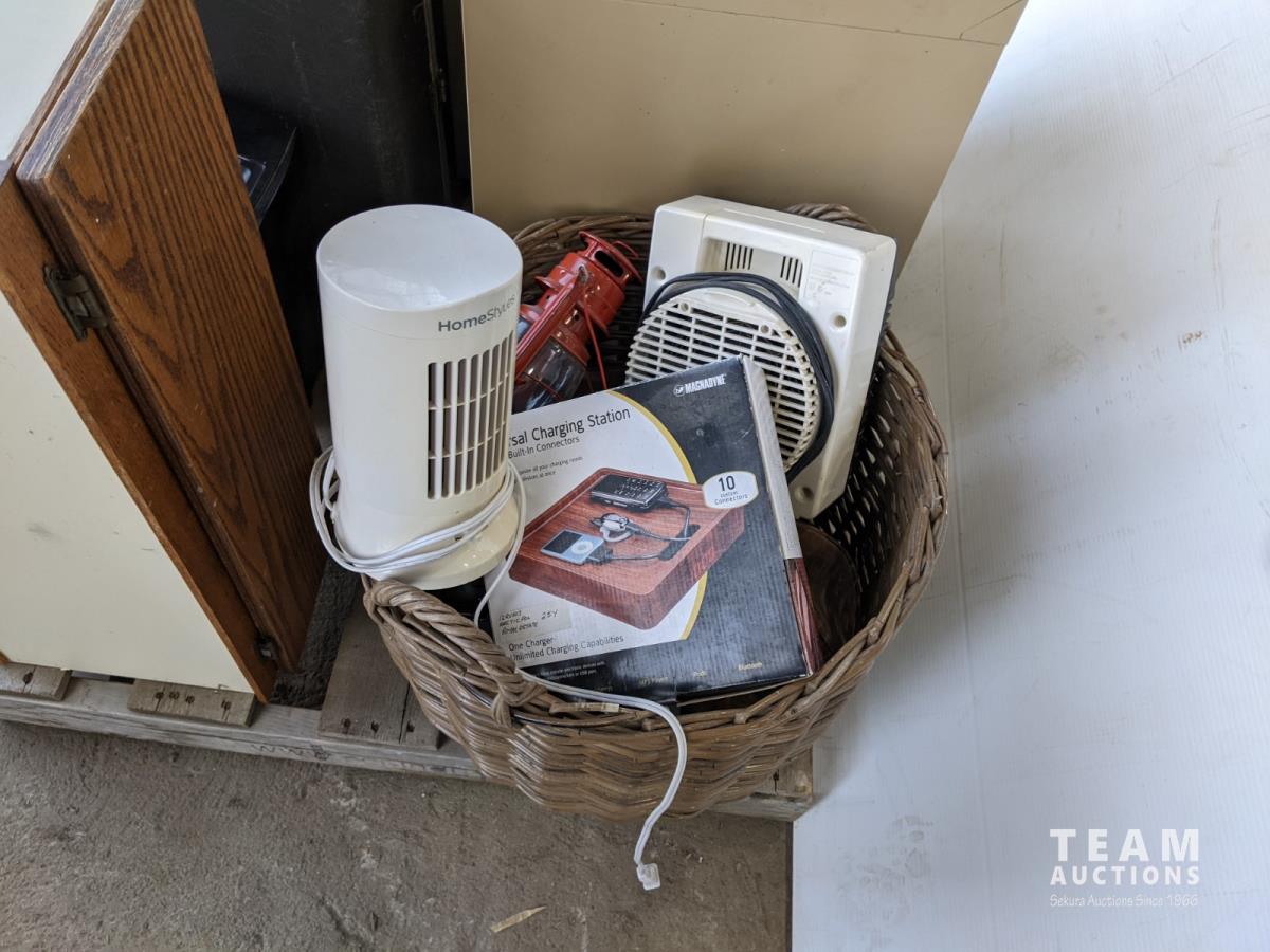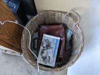 (3) filing cabinets, snow brushes, large wicker basket, vintage heaters