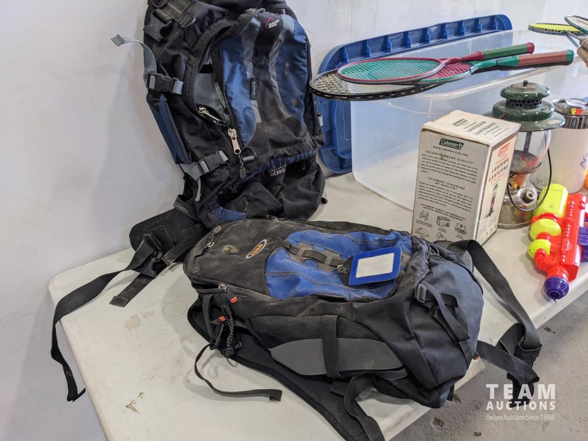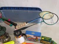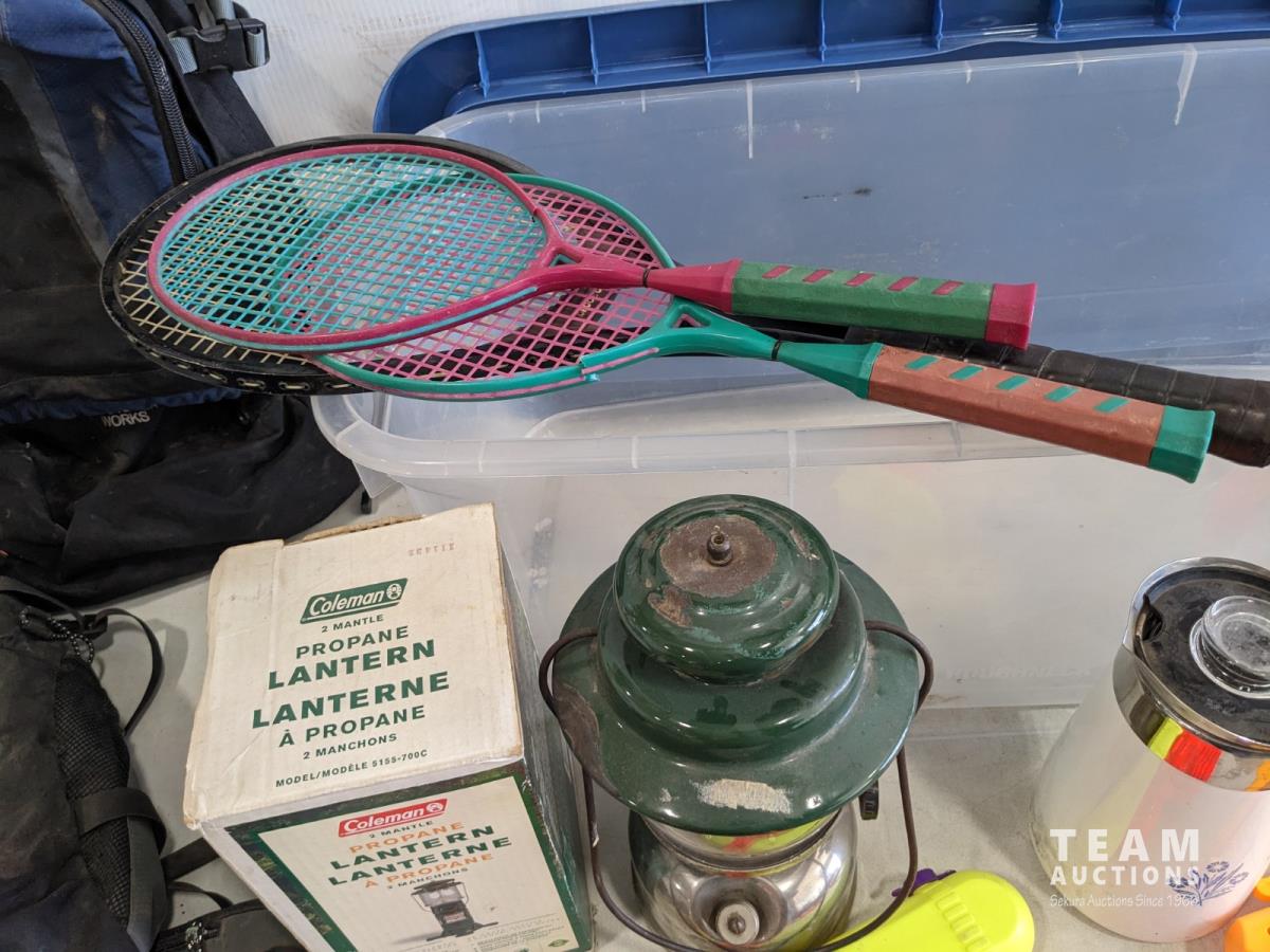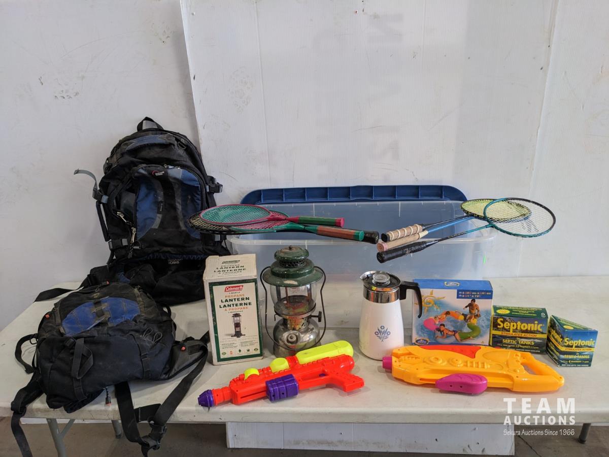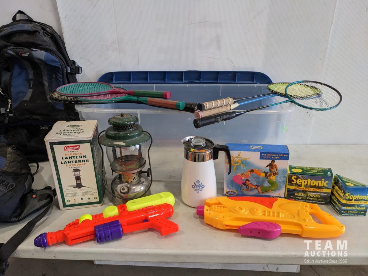 Coleman lantern, coffee pot, water toys, backpacks, badminton rackets