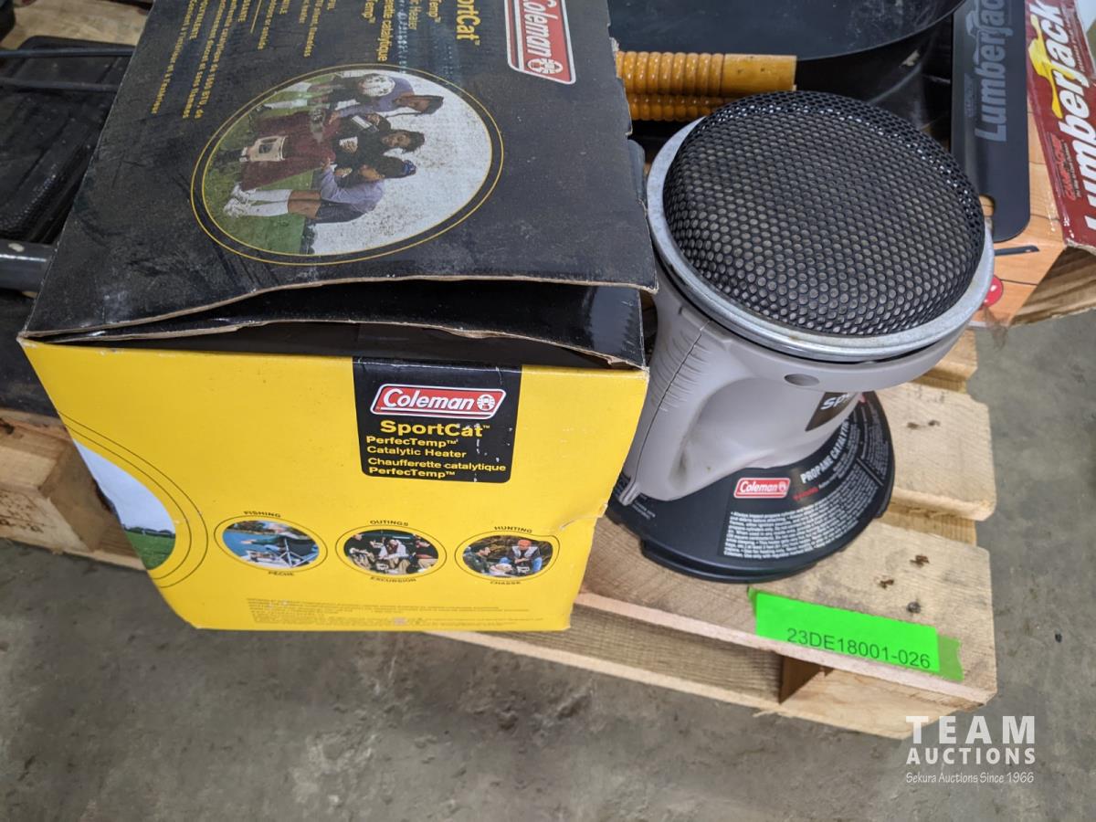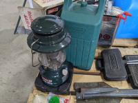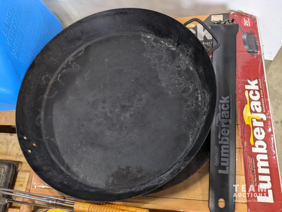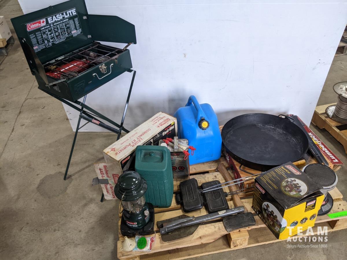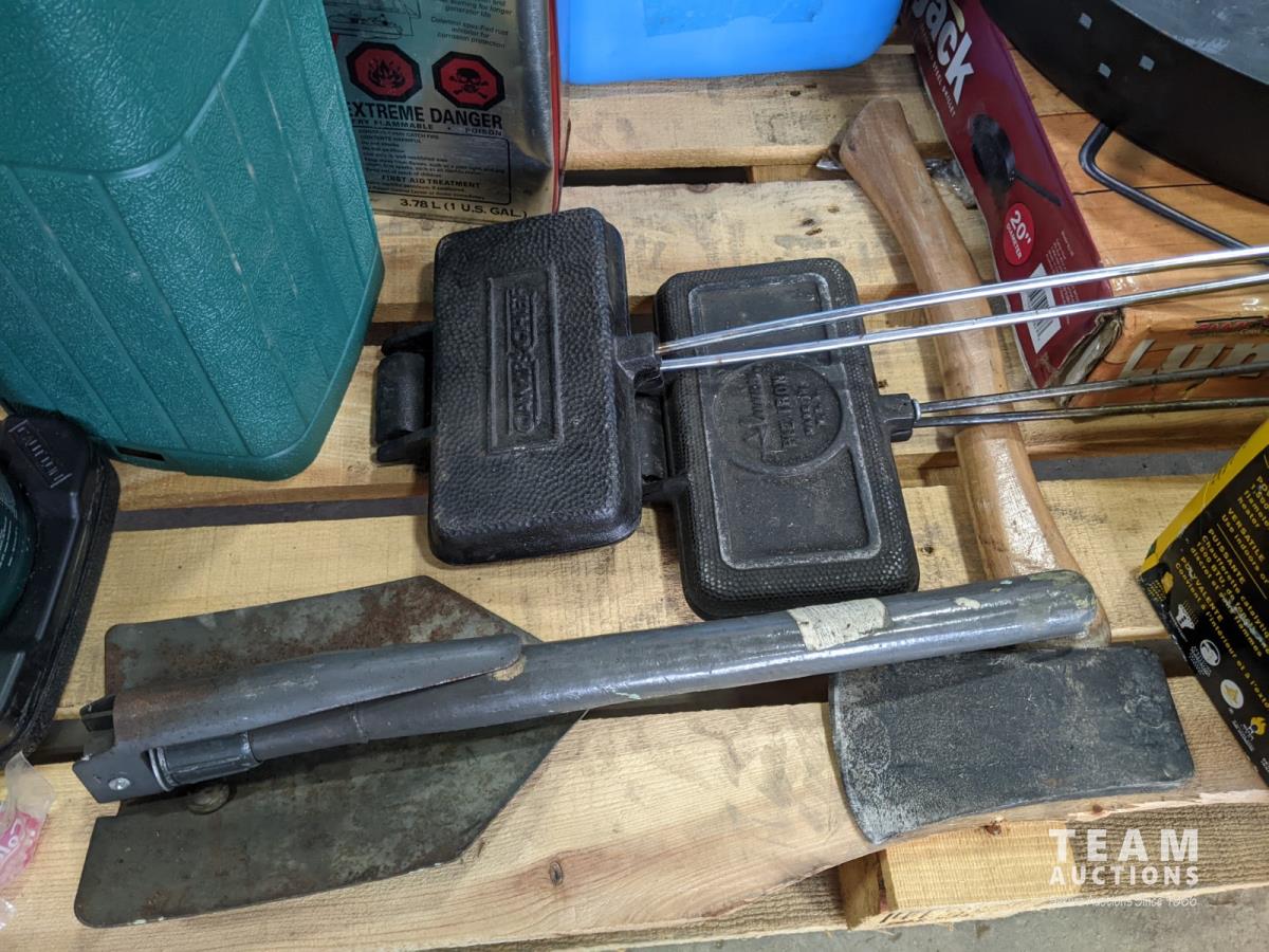 20 inch Lumberjack pan, Coleman catalytic heater, Coleman 2 burner camp stove with stand, Coleman lantern, pie irons, shovel, kerosene jerry can