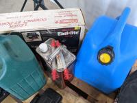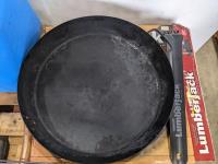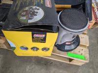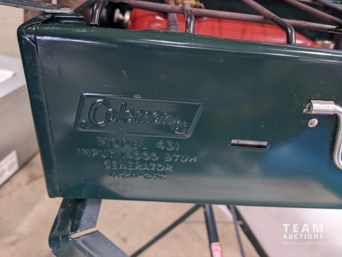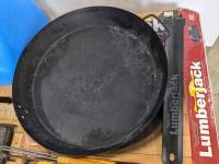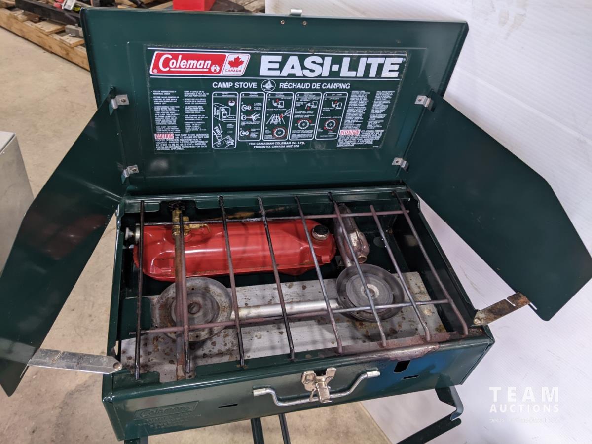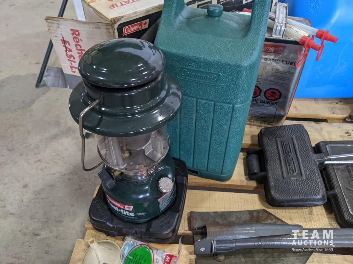 20 inch Lumberjack pan, Coleman catalytic heater, Coleman 2 burner camp stove with stand, Coleman lantern, pie irons, shovel, kerosene jerry can