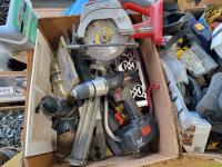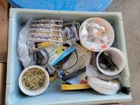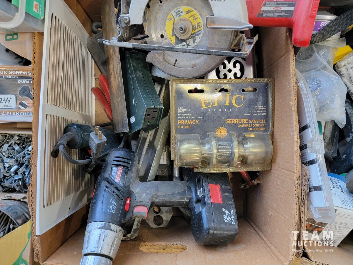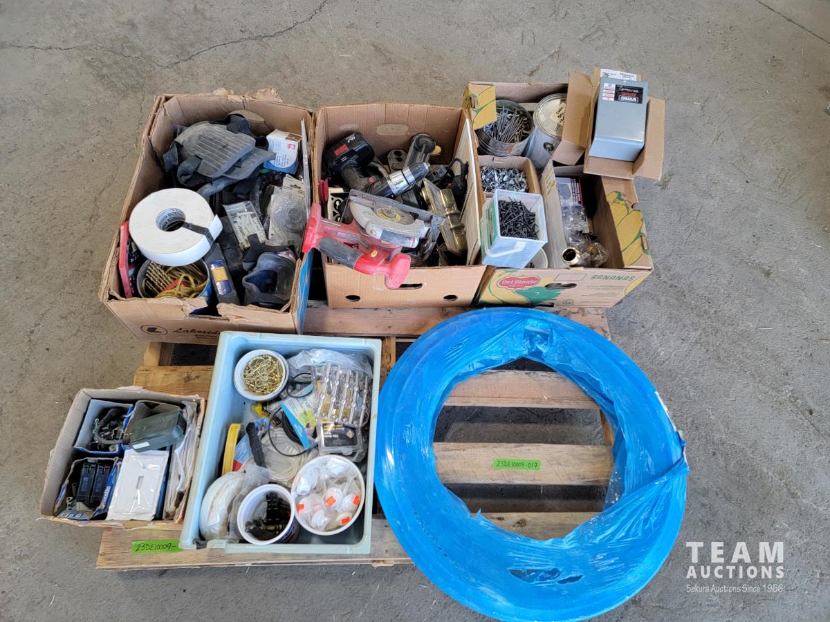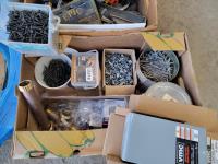 Assortment of nails and screws, 1/2 inch pex pipe, draws knobs, cabinet handles, light switch covers, saw and drill