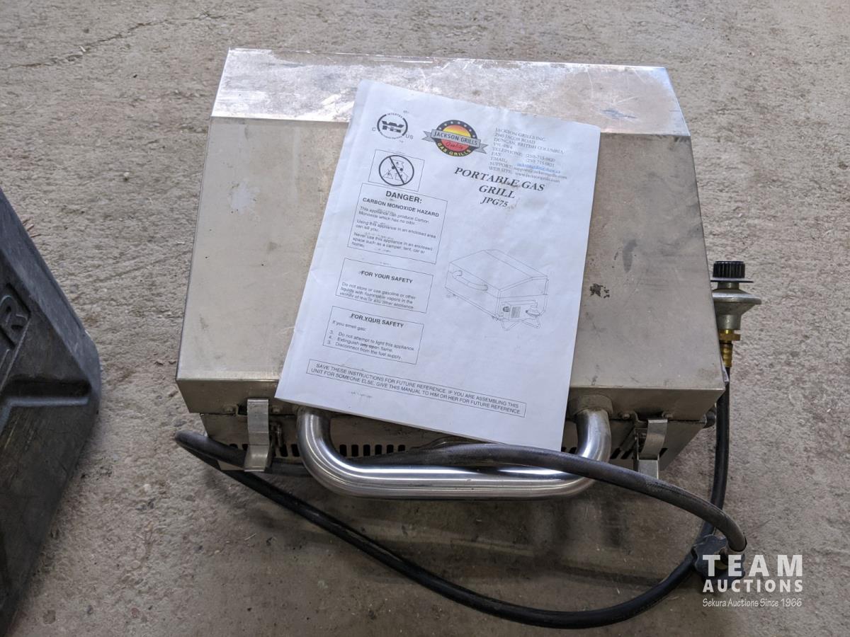 Jackson Grills portable grill, (2) water jugs, tiger torch, 26 ft propane hose