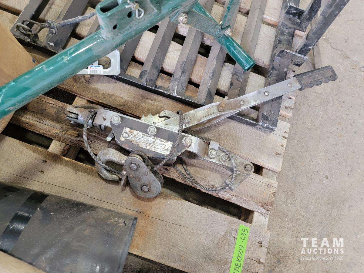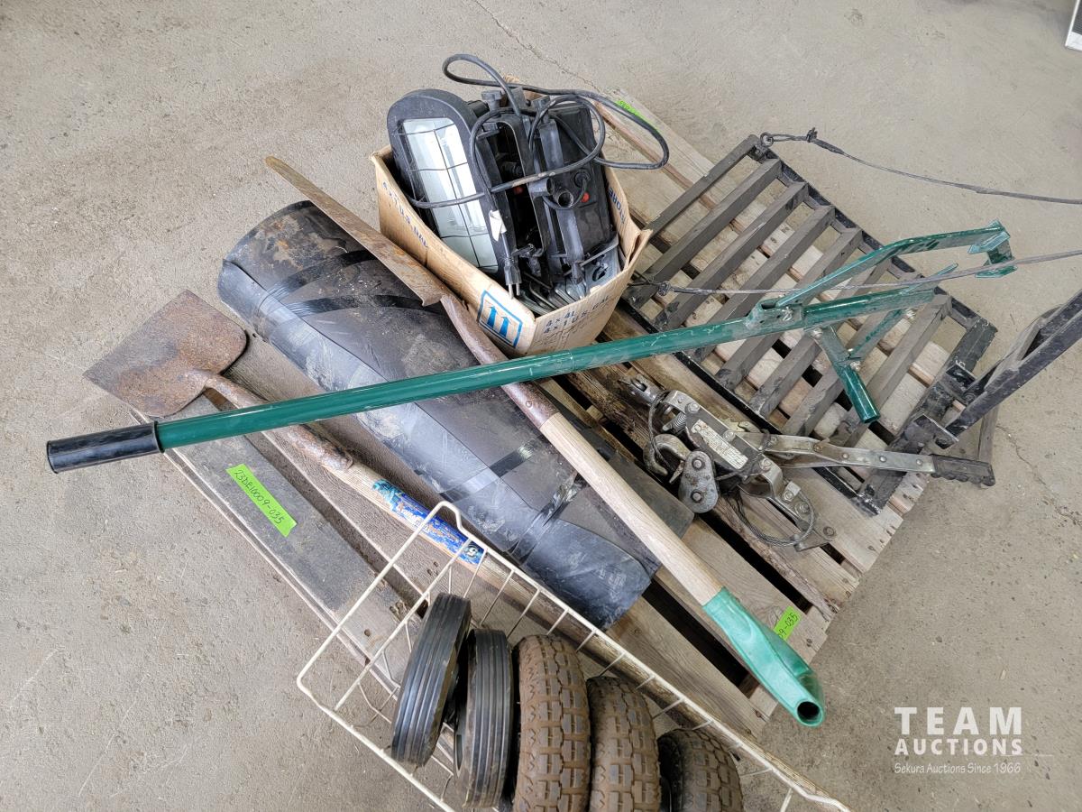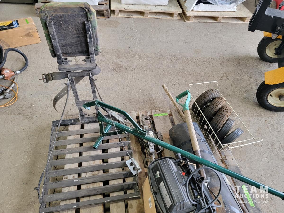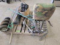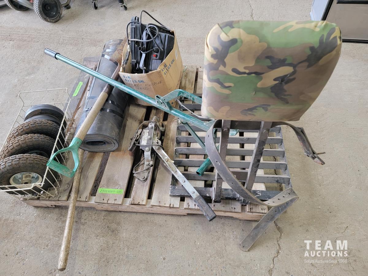 Tree stand, work lights, socket covers, ice scrapper, shovel, manual winch, small wheels