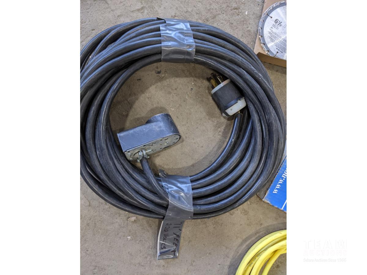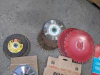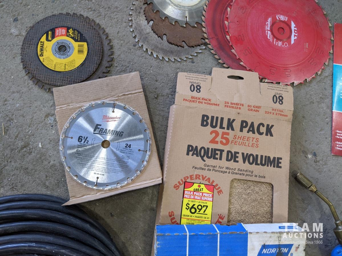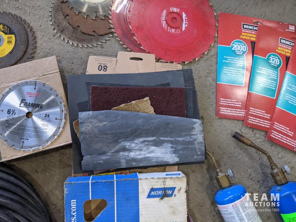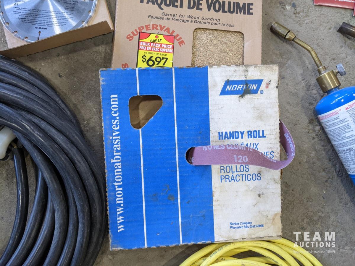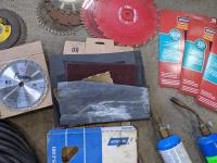 220 v extension cord, 110v extension cord, assorted saw blades, torches, sand paper