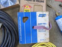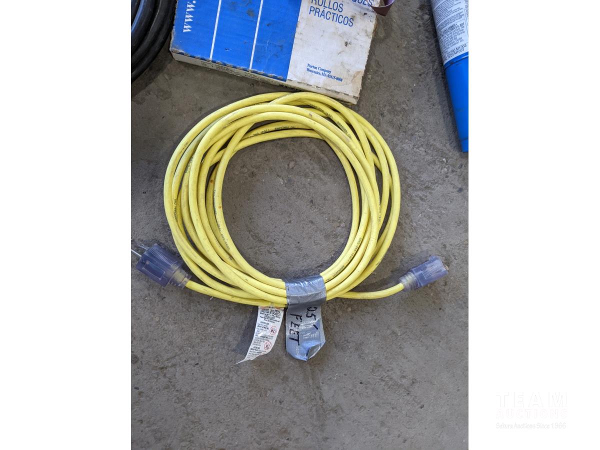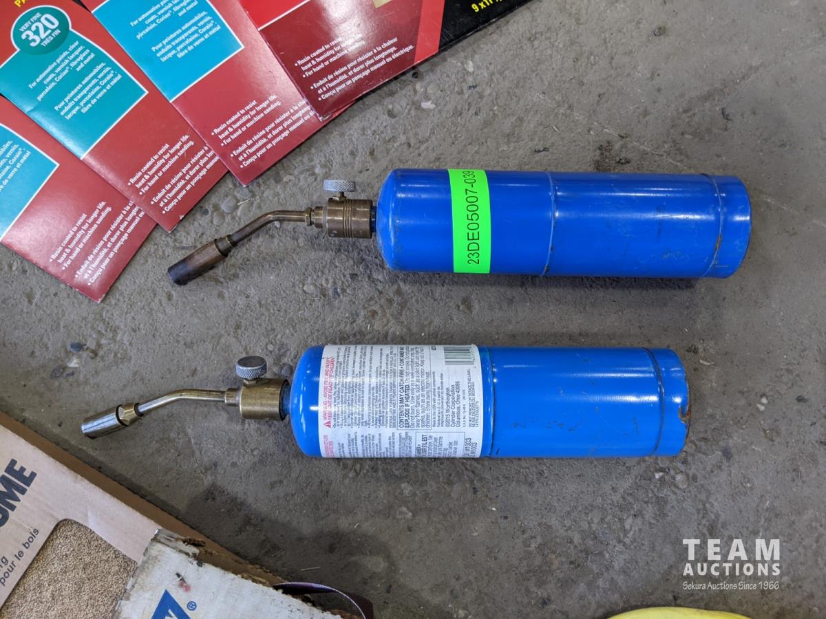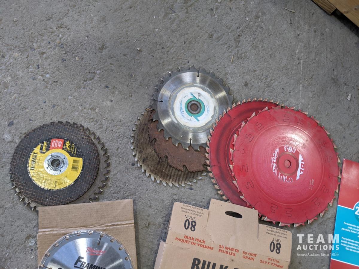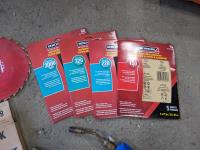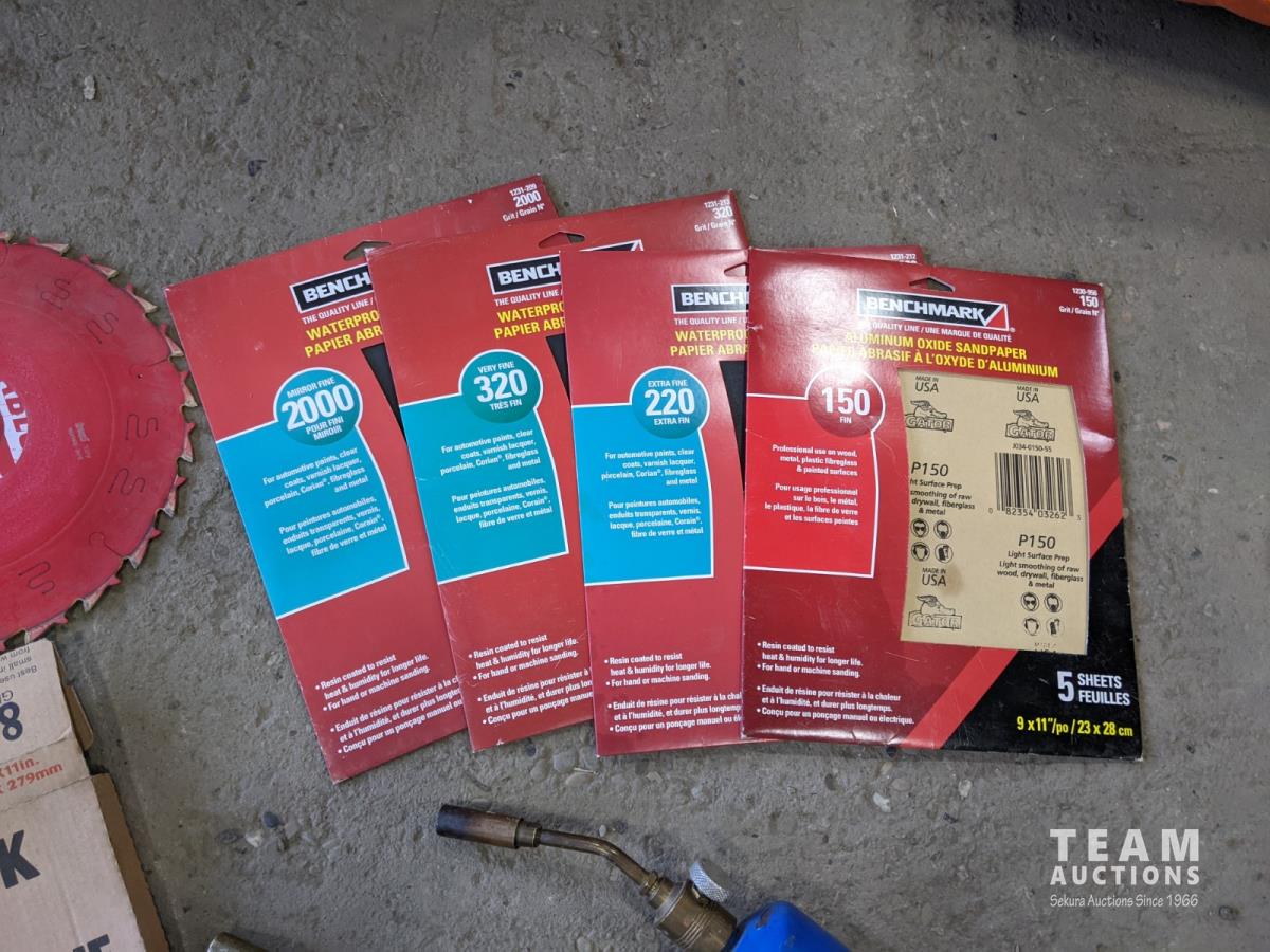 220 v extension cord, 110v extension cord, assorted saw blades, torches, sand paper