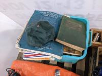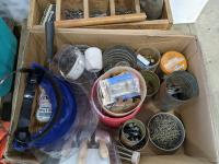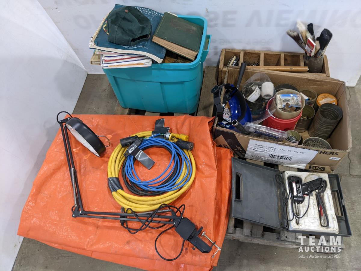 misc hardware and tools, nails, extension cords, desk work lamp, manuals and maps