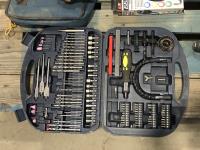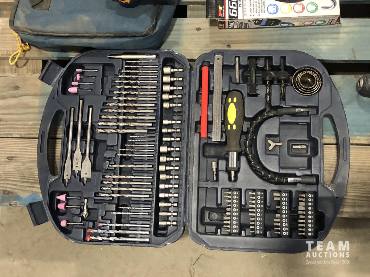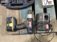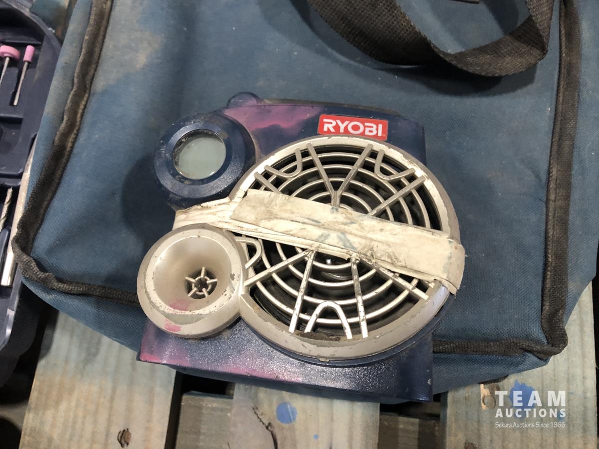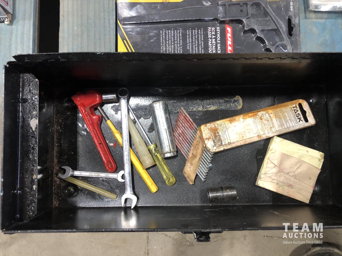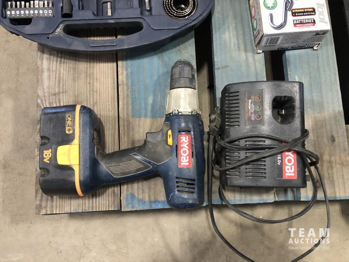 Ryobi radio and drill, tool box with assorted tools, driver, drill bit set, glue gun, hand scale