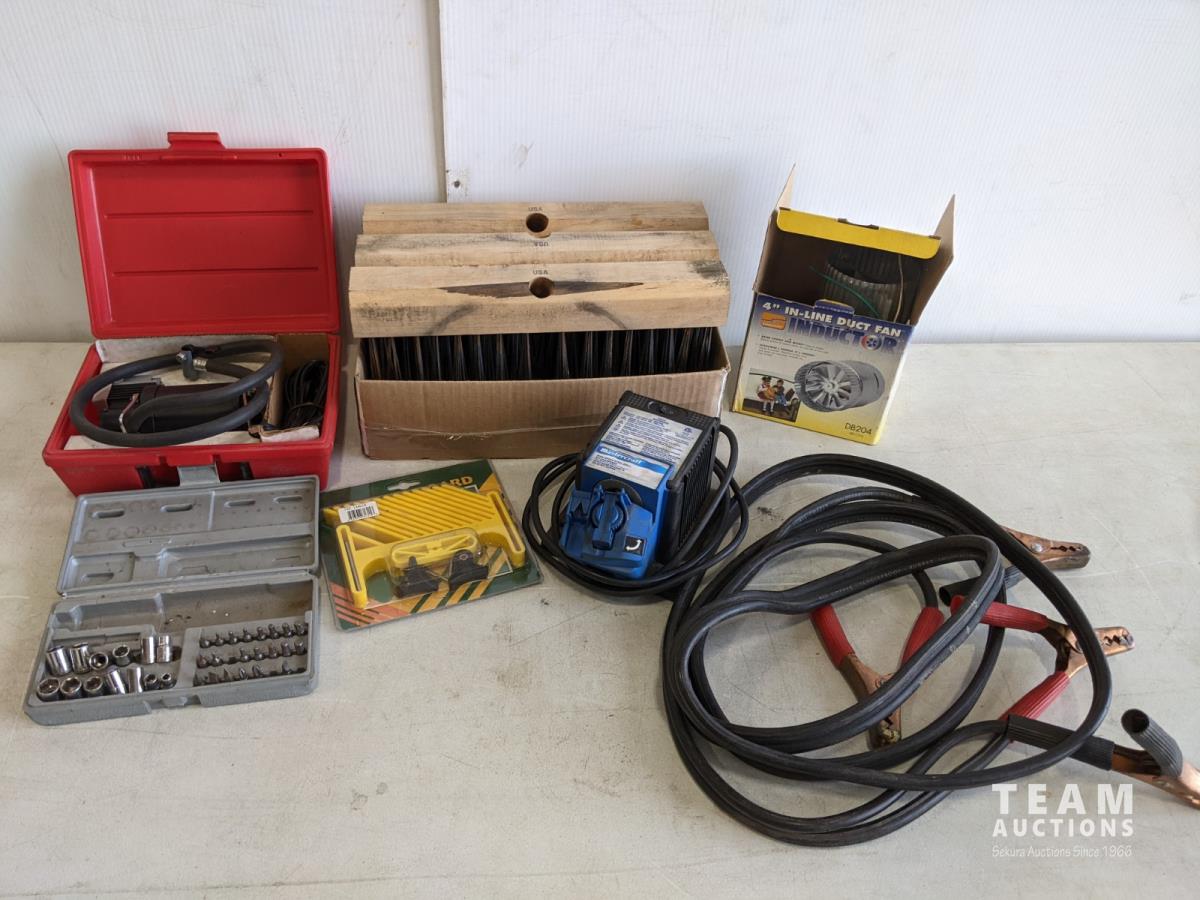 Wide broom heads, booster cables, sockets, air compressor fan, bit sharpener