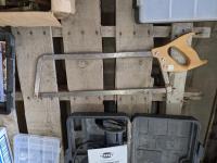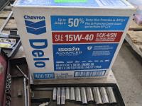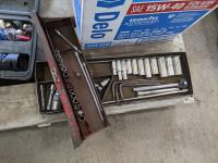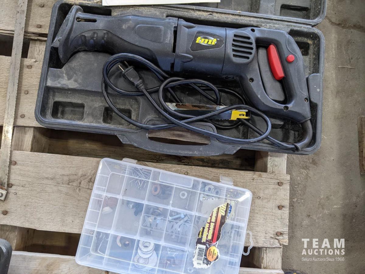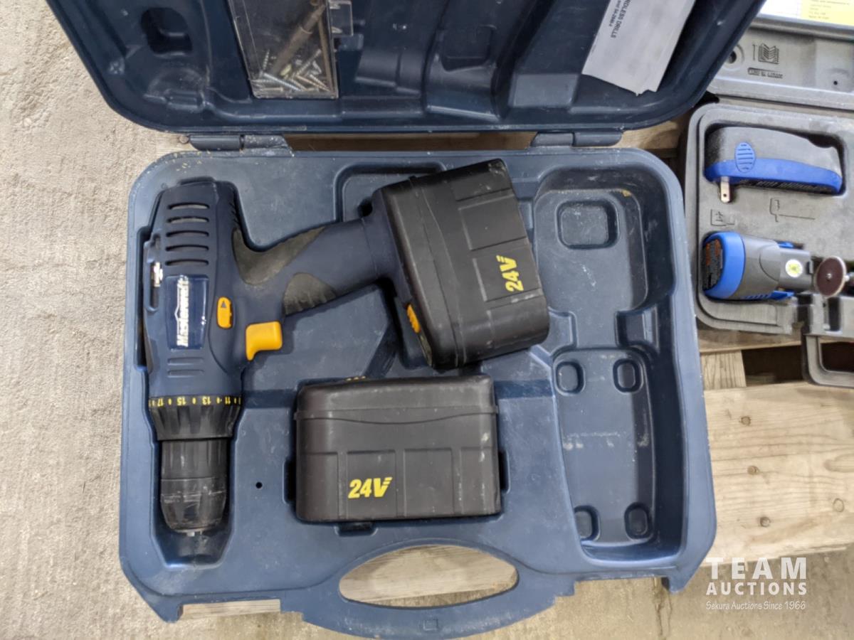 Mastercraft 24v drill, Dremel, 15W-40 oil, miscellaneous nuts and bolts, hand saw, reciprocating saw, sockets