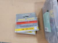 Wire wheel brushes, (2) cordless drills, clamps, staples