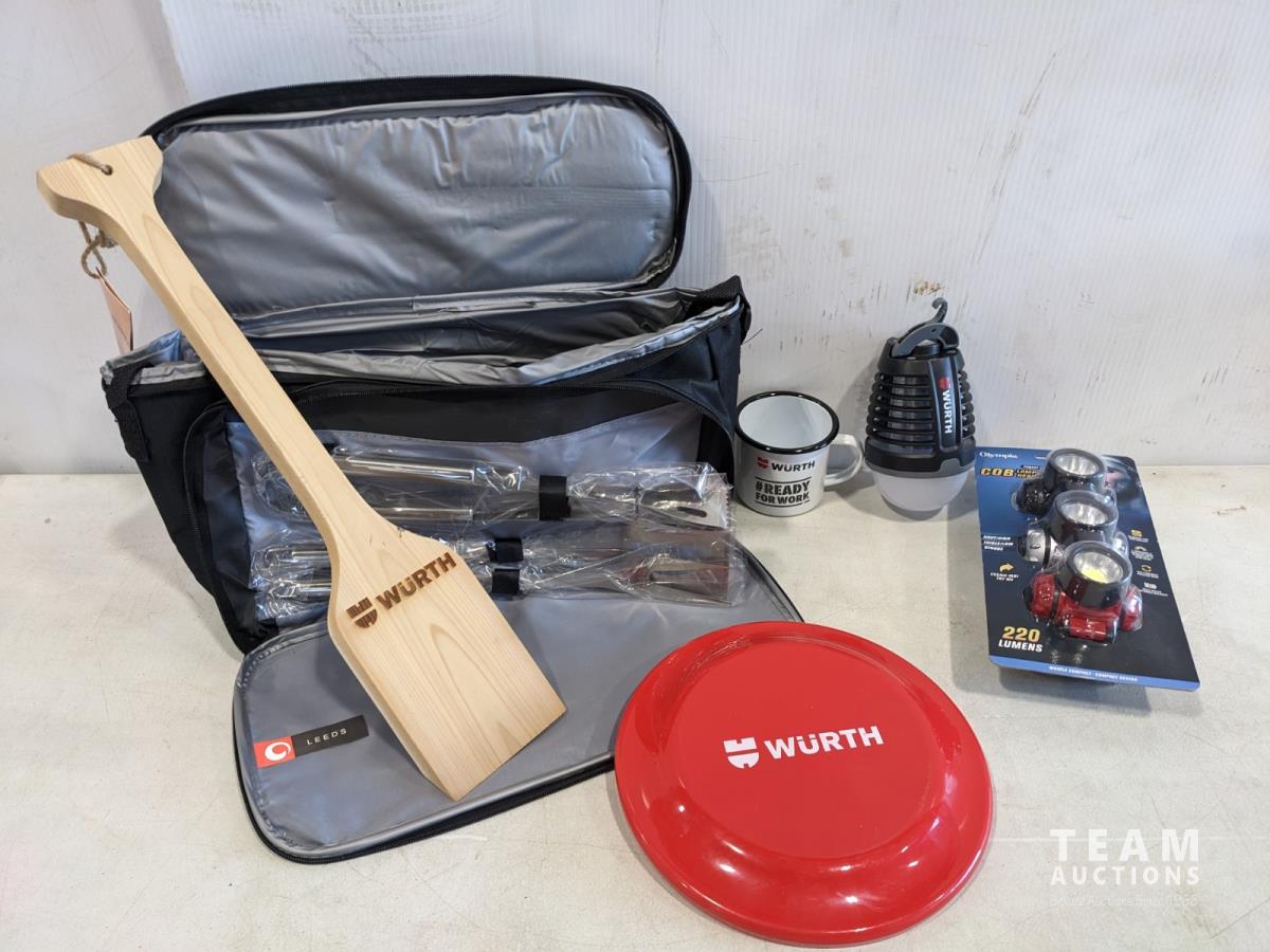 BBQ set with bag, BBQ scraper, frisbee, mug, bug light, cob head lamp