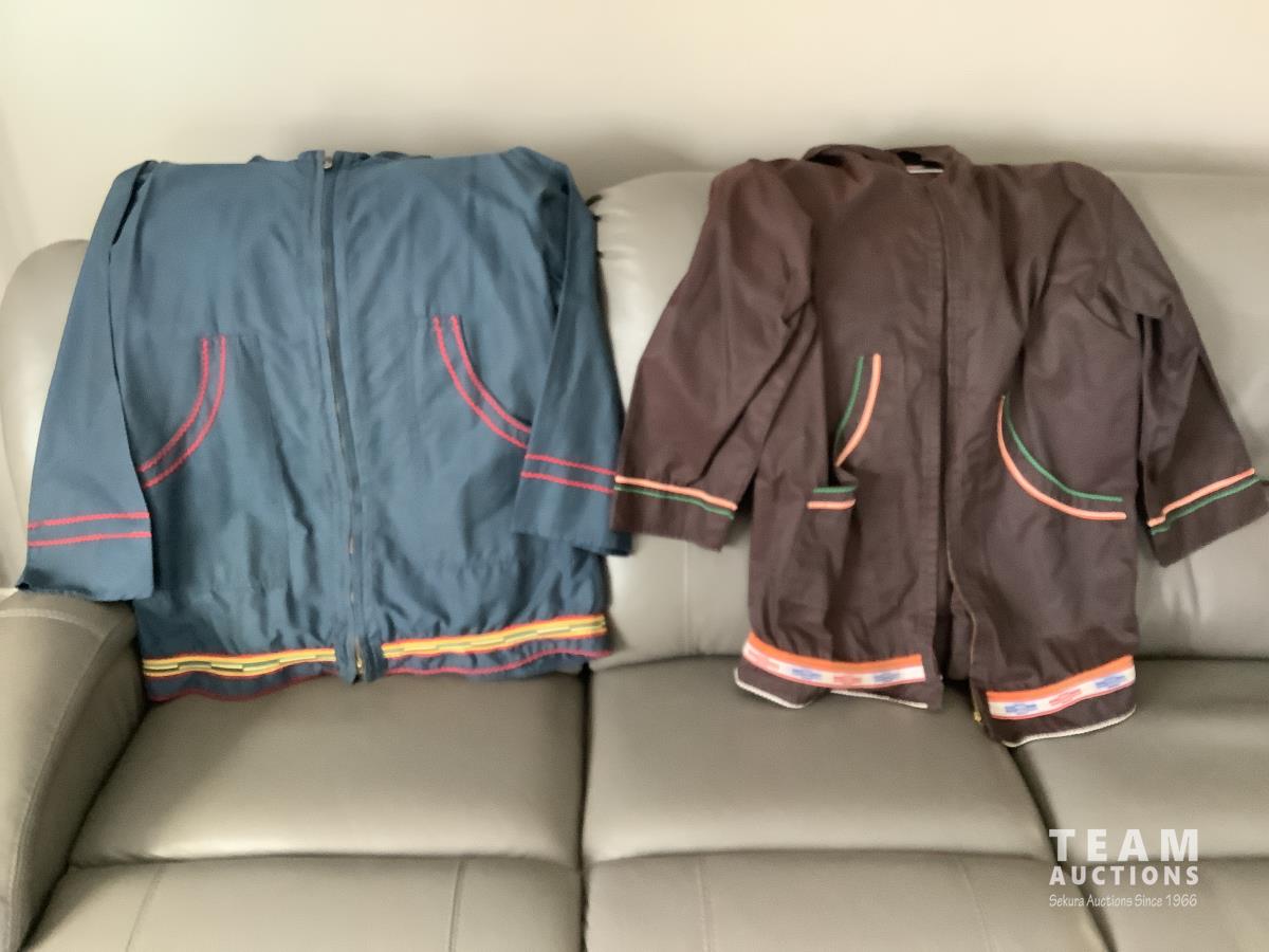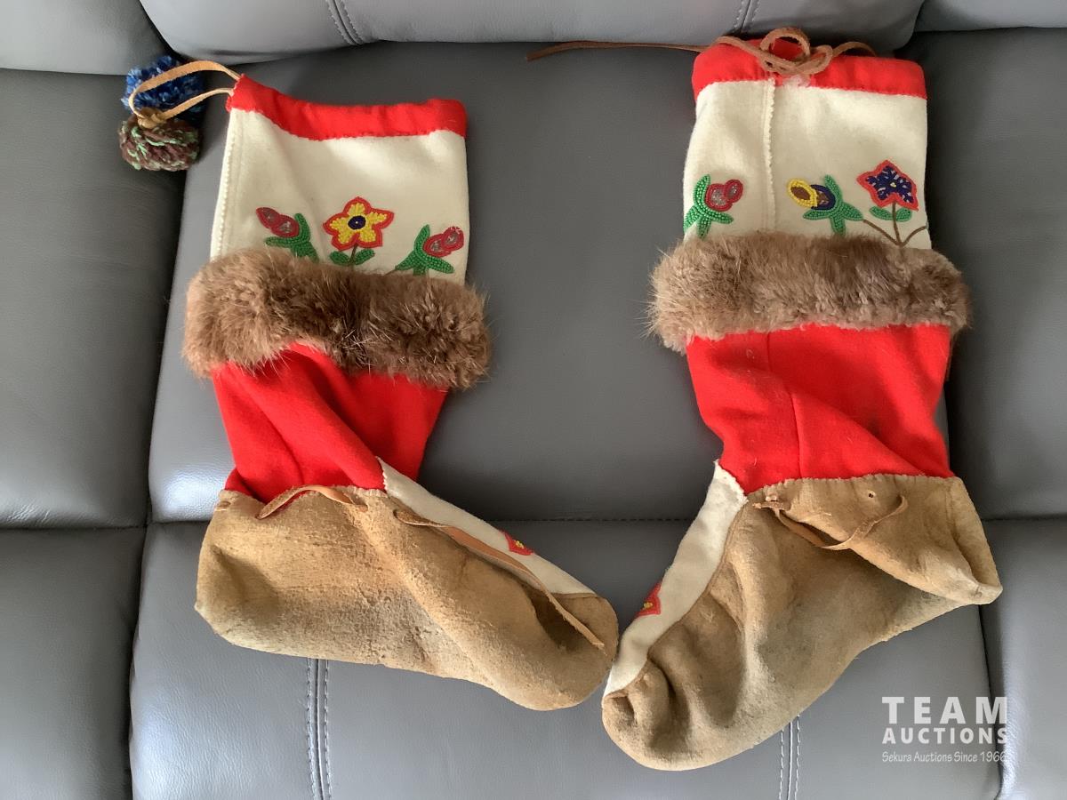 (2) vintage Inuit handmade women's size 14 winter wool coats, fur trimmed hood, hand embroidered designs, virgin wool, manufactured by Canadian Eskimo Company in northern Canada in approximately 1959-1962, Pair of women’s vintage handmade leather moccasins hand embroidered beads, fur trim from approximately 1960, (4) vintage nylon over coats with hoods various sizes with Inuit designs (the red one needs zipper repaired)